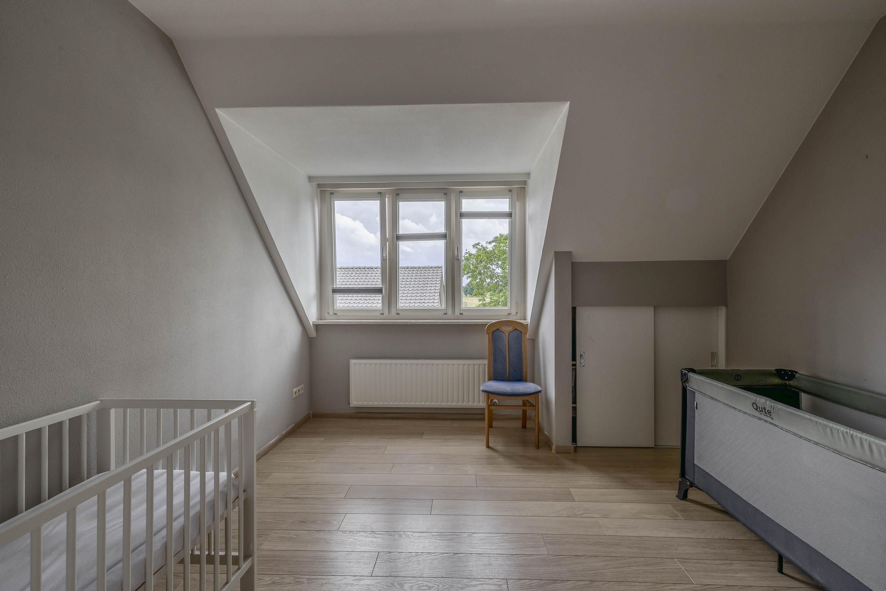 De ruime overloop met vide biedt toegang tot 3 slaapkamers, een badkamer en een technische/stookruimte. In de technische ruimte is het stofzuigsysteem, de WTW-installatie en de boiler gesitueerd. Slaapkamer I en III zijn beiden voorzien van een laminaatvloer, spuitwerk wanden en een spuitwerk plafond. In beide ruimtes is bergruimte gecreëerd onder de dakschuinte door middel van praktische schuifkasten. Twee ramen in de kopgevel zorgen voor natuurlijke lichtinval. Slaapkamer II is eveneens voorzien van een laminaatvloer, spuitwerk wanden en een spuitwerk plafond. Een dakkapel zorgt voor natuurlijke lichtinval en ventilatie in de ruimte. De ruime, geheel betegelde badkamer is uitgerust met een ligbad, wastafel met wastafelmeubel, douche, toilet en een designradiator. Een praktisch pluspunt van deze badkamer is de handige stortkoker voor de was. De koker mondt uit in de keuken, waardoor de vuile was direct beneden terechtkomt, dicht bij de wasapparatuur. Dit maakt het doen van de was een stuk efficiënter en zorgt voor extra gemak.