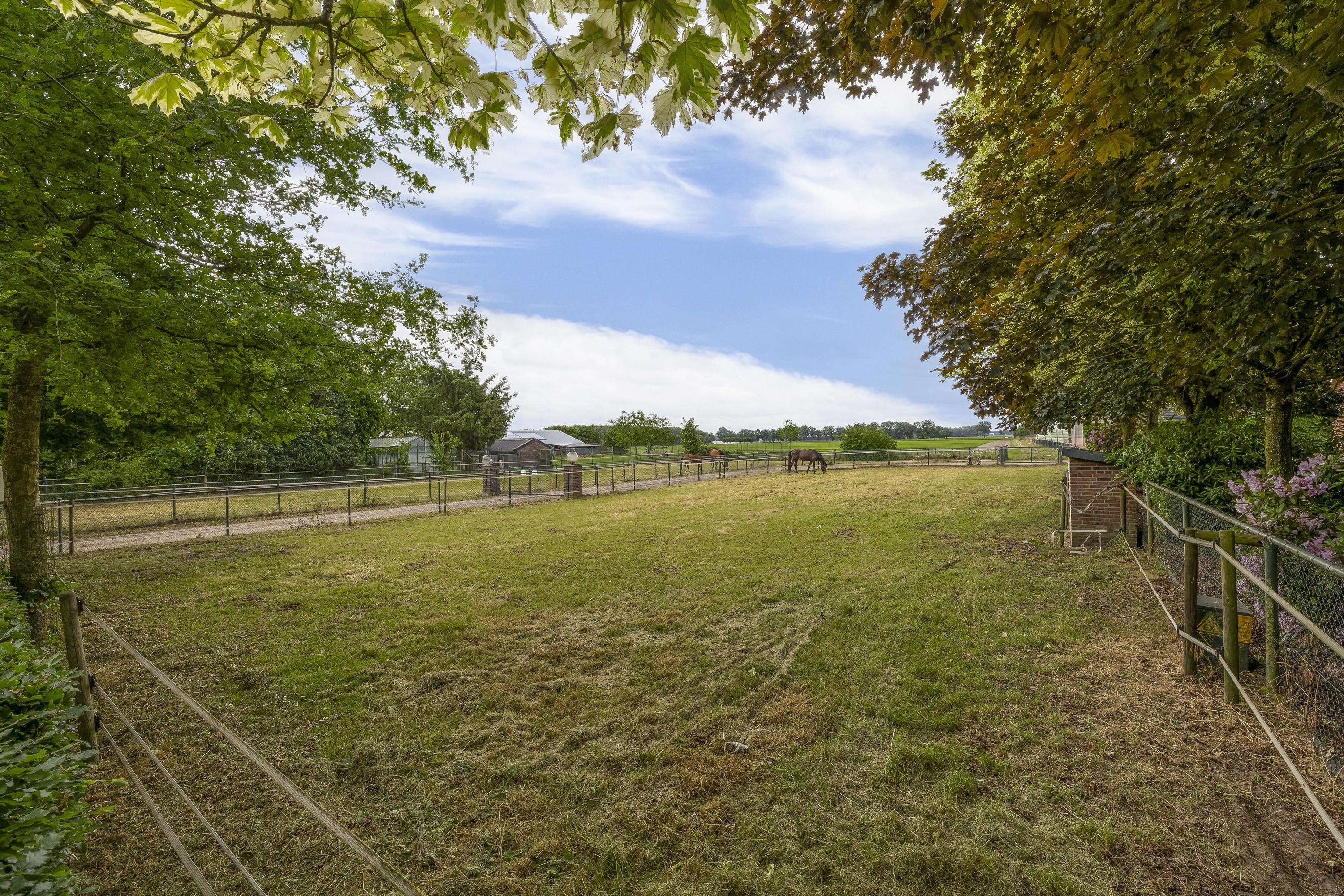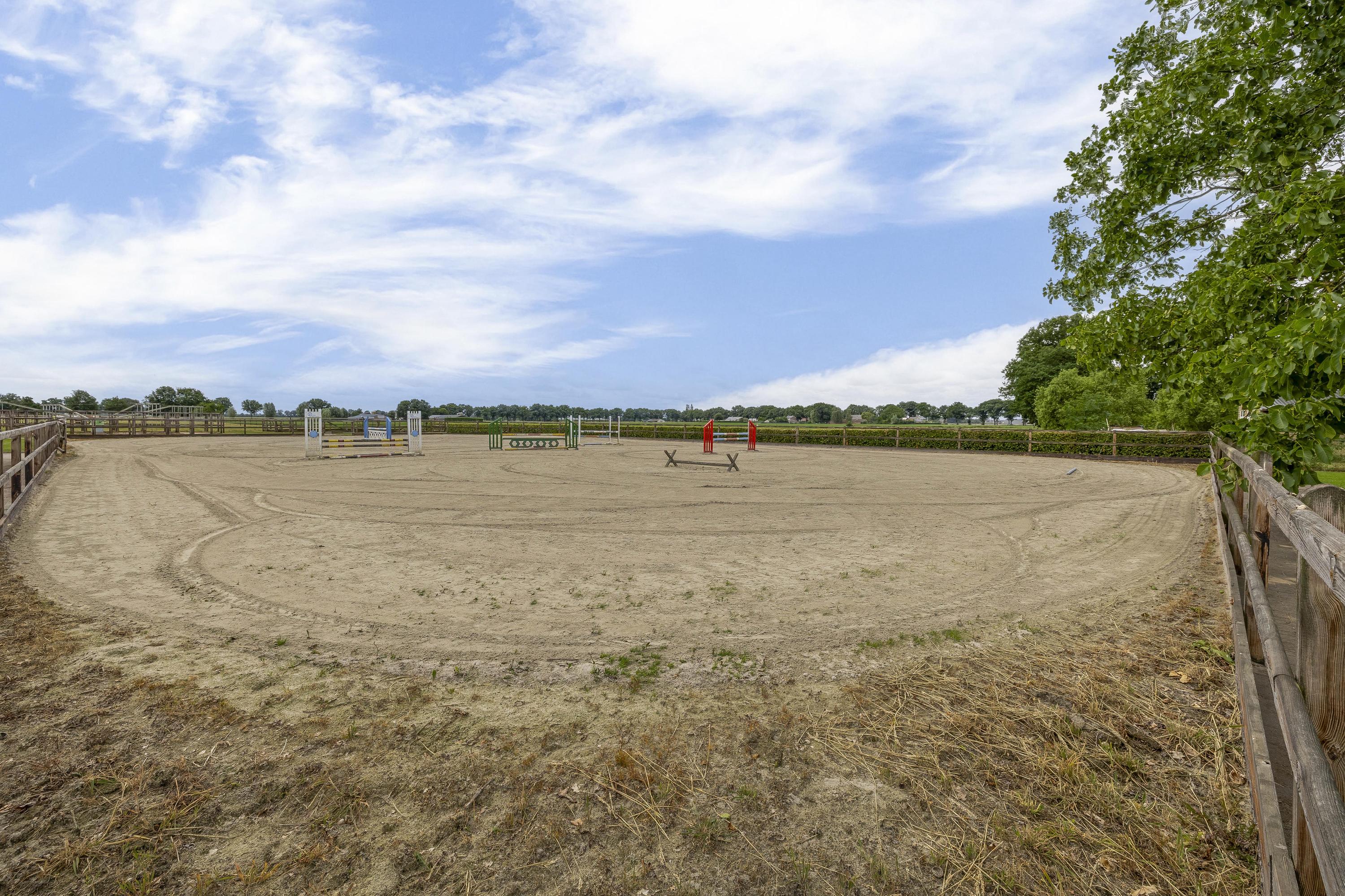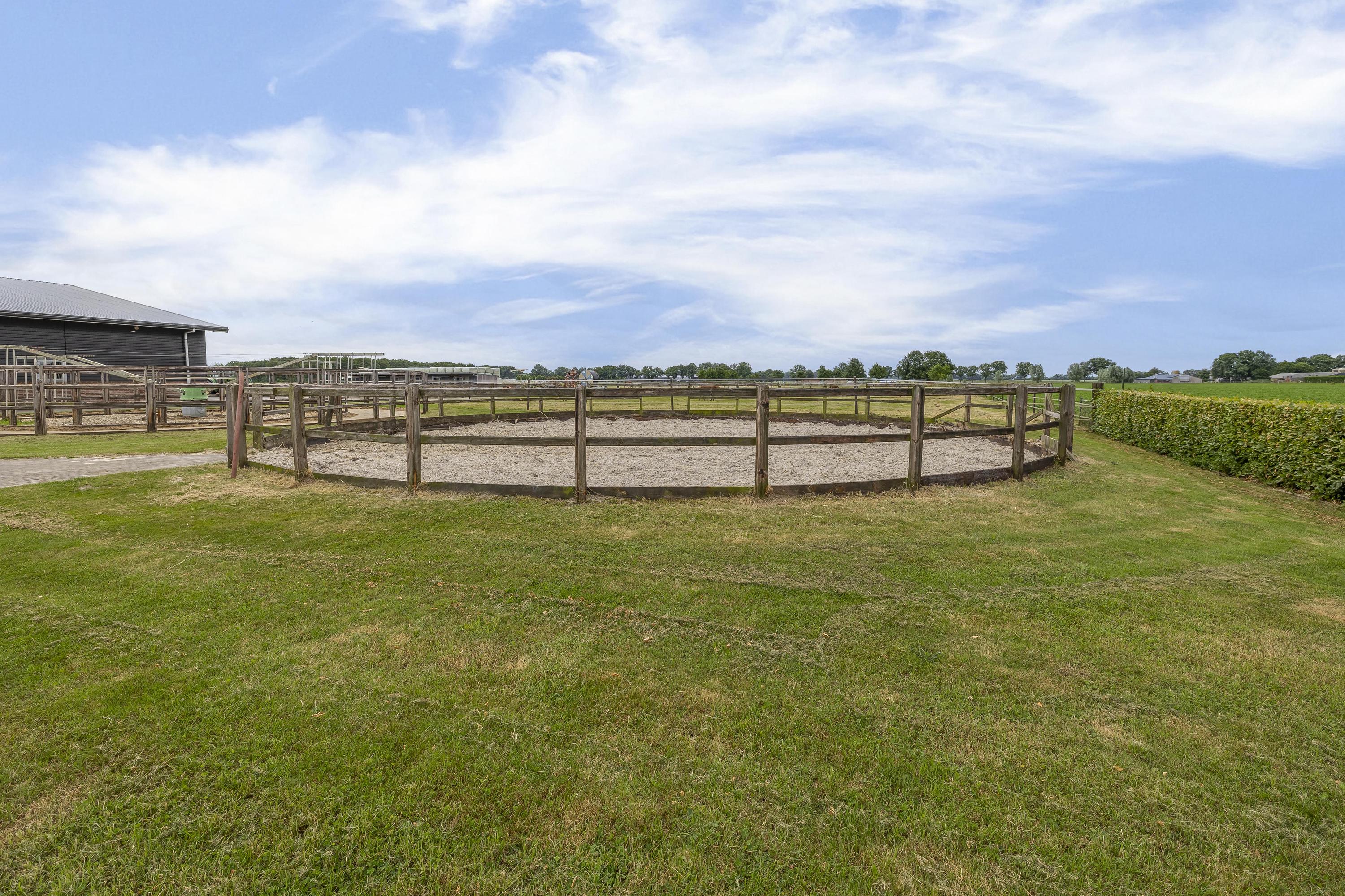 Het erf is verder ingericht met een buitenpiste, een praktische stapmolen en een longeercirkel. Daarnaast zijn er 6 buitenstallen, een mestvaalt en een opslagruimte voor stro aanwezig. Het geheel wordt verder aangevuld met een royaal weiland verdeeld in verschillende paddocks. Deze uitgebreide faciliteiten zorgen ervoor dat het geheel volop mogelijkheden biedt voor de (semi)professionele paardenliefhebber! De buitenpiste heeft een afmeting van ca. 50mtr. x 25mtr. is uitgerust met een eb/vloedbodem en voorzien van een houten omheining. De longeercirkel is omheind met hout en verder voorzien van een eb/vloed bodem. De stapmolen is geschikt voor 4 paarden en is uitgerust met een betonnen vloer en een houten omheining. Op het terrein zijn 6 buitenstallen gesitueerd. Deze stallen zijn voorzien van deels kunststof/ deels gegalvaniseerde voorwanden met een schuifdeur. Het dak is bedekt met damwand. De mestvaalt is verdiept gelegen, uitgerust met een betonnen vloer en wanden. Toevoer geschiedt via de mestketting. Toegang via de helling. Het weiland is verdeeld in paddocks, welke zijn omheind met houten palen en lint. Er is een middenpad aanwezig zodat je gemakkelijk de verschillende paddocks kunt bereiken.