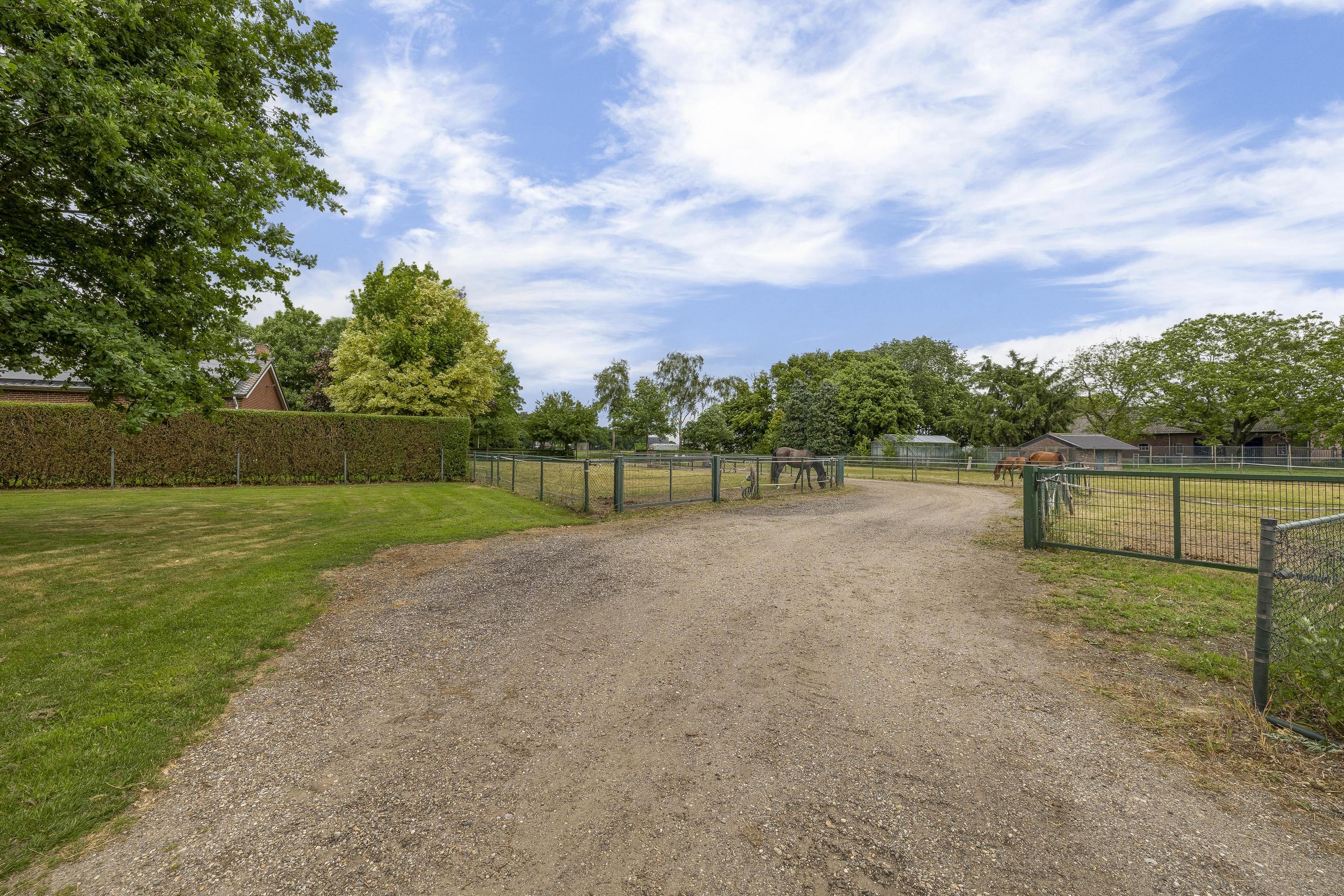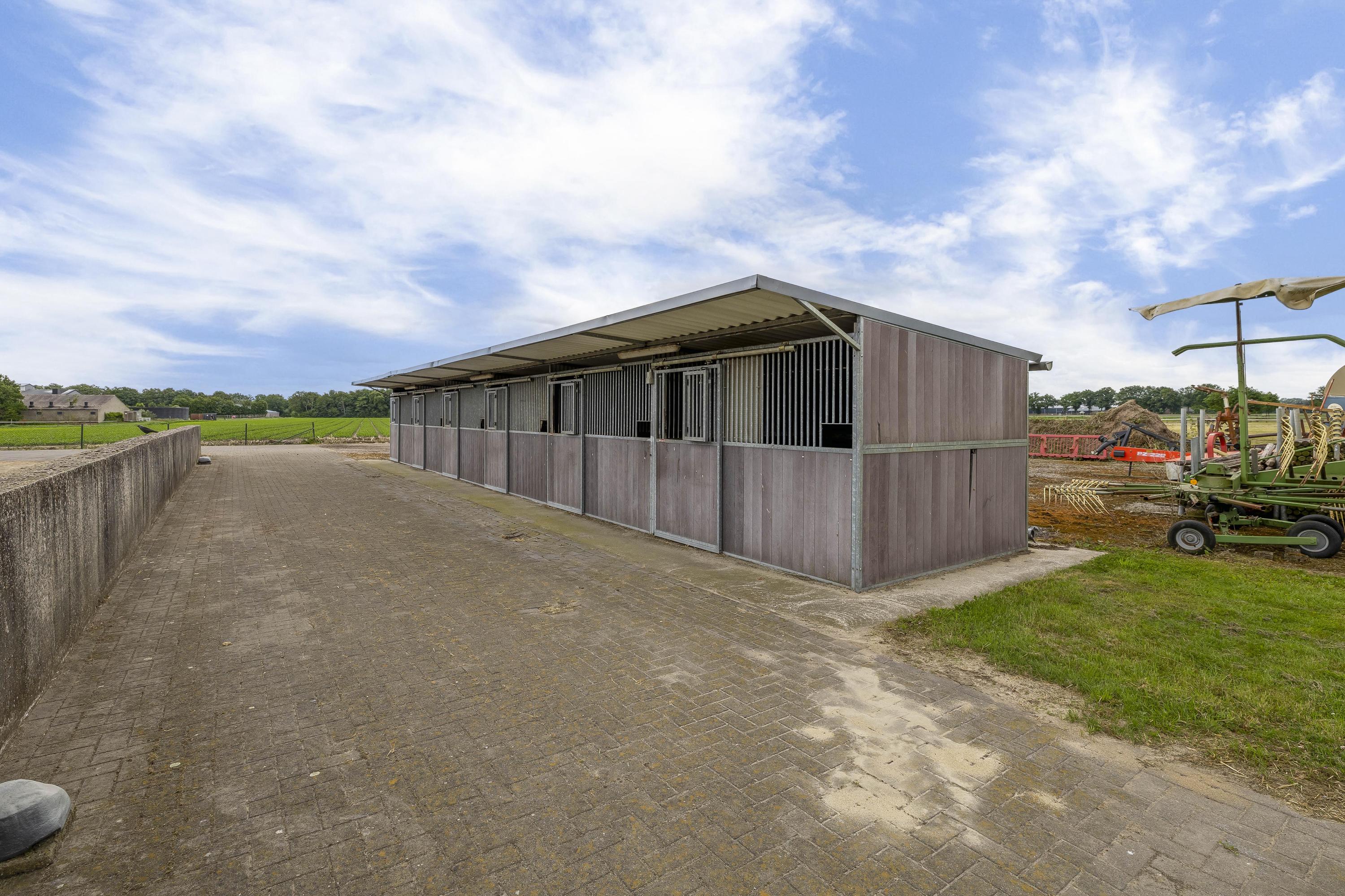 De goed onderhouden hippische accommodatie bestaat uit een vrijstaande rijhal met een binnenpiste (ca. 20x40 mtr.), een stalgedeelte met in totaal 20 paardenboxen, een ontvangstruimte met appartement, een 2e appartement en een loods/werkplaats.. Het erf is verder ingericht met een buitenpiste, 6 buitenstallen, een stapmolen, een longeercirkel, weiland, een mestvaalt. De rijhal is opgetrokken uit metselwerk gevels, stalen spanten en een geïsoleerd dak. De gevels zijn aan de buitenzijde deels gepotdekseld. Lichtdoorlatende platen zorgen voor natuurlijke lichtinval. Aan de binnenzijde zijn de gevels voorzien van betonelementen. De binnenpiste heeft een afmeting van ca. 20mtr. x 40mtr. en is uitgerust met een eb-vloed bodem. Er is een heather aanwezig. De piste is voorzien van verlichting. De wanden zijn van beton. Een roldeur in de achtergevel en een loopdeur in de zijgevel zorgen voor toegang. Het stalgedeelte is uitgerust met maar liefst 20 paardenboxen, waarvan de voorwanden deels zijn uitgevoerd in kunststof en deels in gegalvaniseerd staal. De boxen hebben betonnen tussen- en achterwanden en zijn voorzien van schuifdeuren. Aan de voorzijde van de hal is de loods/werkplaats gelegen welke is voorzien van een betonnen vloer en wanden en een betonplaten plafond. Aan de rechterzijde is de vaste trap gesitueerd naar de ontvangstruimte en het appartement op de 1e verdieping. De ruime ontvangstruimte is voorzien van een PVC-vloer en deels metselwerk/ deels stucwerk gevels. Er is een keukenblok gesitueerd welke is uitgerust met een gootsteen en een koelkast en bergruimte. De slaapkamer beschikt over dezelfde afwerking als de ontvangstruimte. De badkamer is uitgerust met een douche en een wastafel. Ook is er een zwevend toilet aanwezig. Vanuit de ontvangstruimte is er een fraai zicht op de binnenpiste. In de berging zijn de aansluitingen voor de wasapparatuur, de unit voor de vloerverwarming, de opstelling voor de CV-ketel (Nefit Topline) en de omvormer voor de zonnepanelen gesitueerd. De stro opslag aan de achterzijde van de rijhal is afgewerkt met een betonnen vloer. De voersilo is hier gesitueerd. Een roldeur aan de achtergevel en een loopdeur zorgen voor toegang tot het erf. Het dak is geïsoleerd.