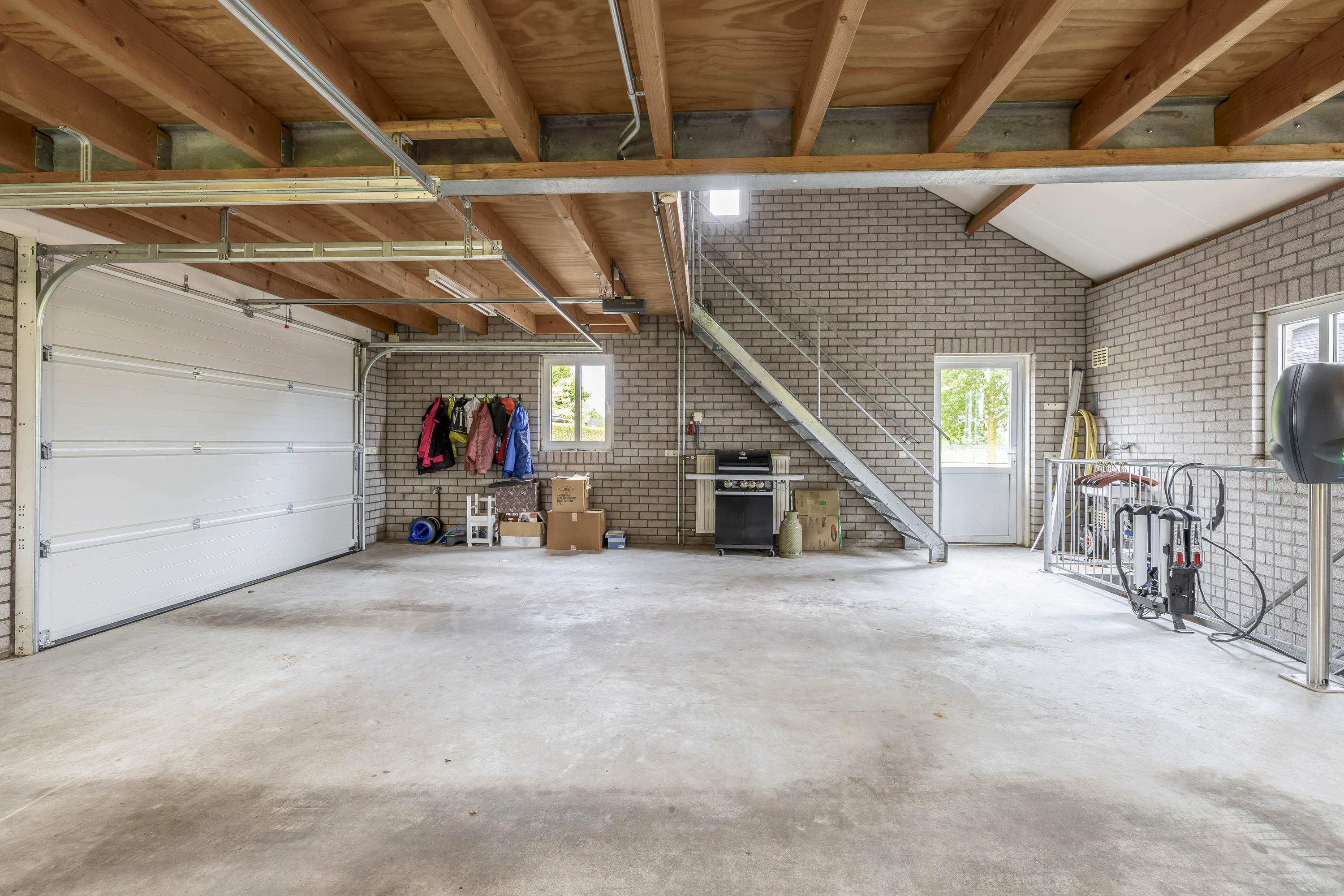 De vrijstaande garage is opgetrokken uit metselwerk gevels, stalen spanten en een met pannen gedekt dak. De volledig geïsoleerde garage beschikt over maar liefst drie verdiepingen, die dankzij een vaste trap gemakkelijk toegankelijk zijn.