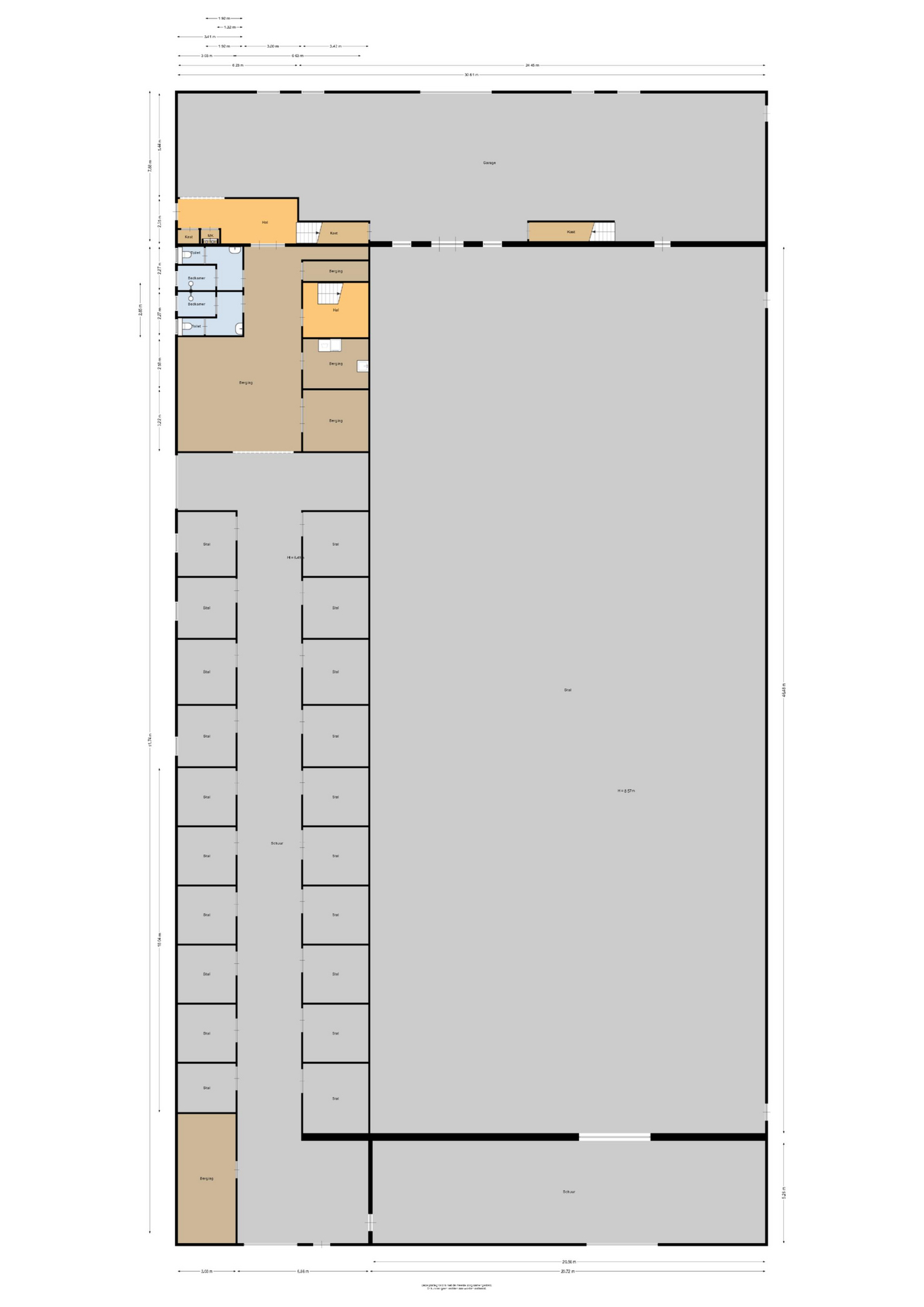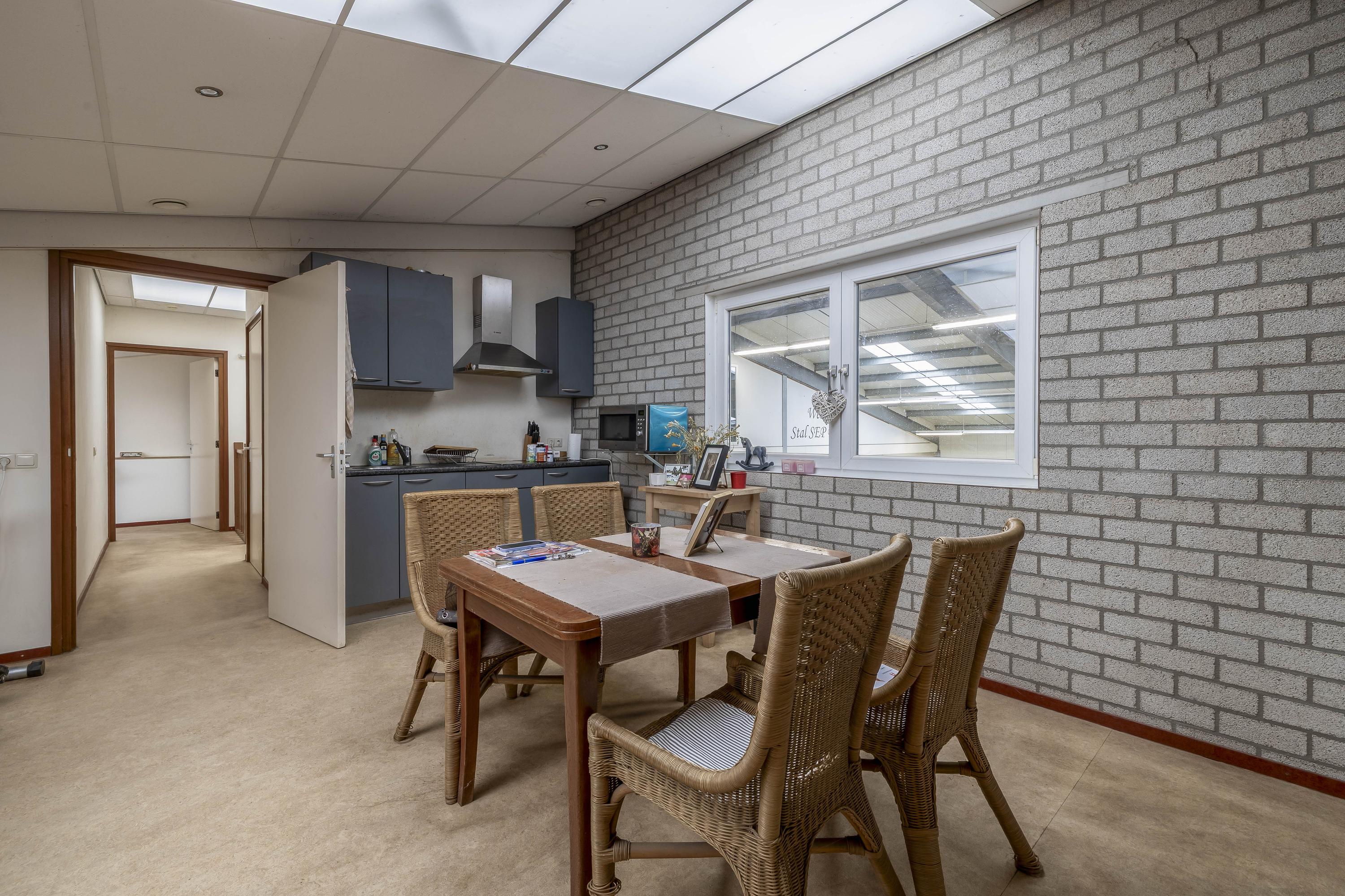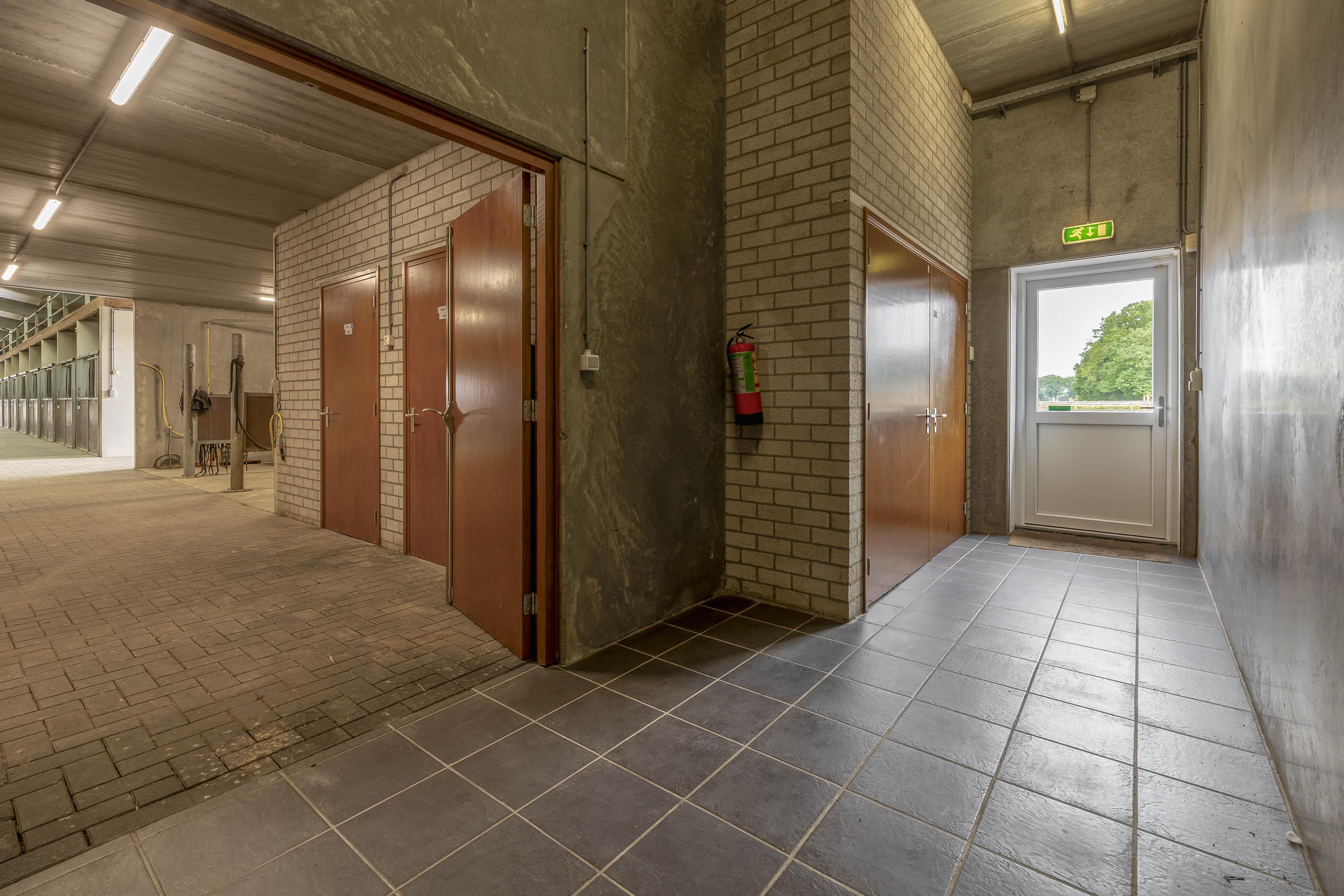 Middels een loopdeur is er toegang tot de stal. Een roldeur zorgt dan weer voor toegang tot de binnenpiste. Er zijn praktische magazijnopstellingen opstellingen gesitueerd. Er is krachtstroom aanwezig en een hogedrukleiding voor het reinigen van de stallen. Een elektrische roldeur en een loopdeur zorgen voor toegang tot het erf. Openslaande deuren zorgen voor toegang tot de rijhal. Daarnaast zijn 10 boxen uitgerust met praktische buitenluiken. Een groot voordeel is de hooizolder met handige hooiluiken, strategisch boven de stallen geplaatst, waardoor hooi en stro eenvoudig direct in de boxen kunnen worden gegooid. Verder draagt de aanwezige sleepketting voor de mest bij aan extra gemak en efficiëntie in het onderhoud van de stallen. Naast de stallen is een douche- en toiletruimte voor heren en dames gesitueerd. Ook zijn er 3 wasplaatsen aanwezig, welke zijn voorzien van een warm- en koud watervoorziening. Via een separate ingang, gelegen naast de zadelkamer is het appartement bereikbaar. Het appartement is afgewerkt met een vinylvloer, deels metselwerk / deels stucwerk wanden en een systeemplafond. Er bergruimte onder de dakschuinte gecreëerd. De woonkamer van het appartement is uitgerust met een keukenblok. Vanuit deze ruimte is er zicht op de binnenpiste. De slaapkamer is voorzien van een praktische inbouwkast. De badkamer is ingericht met een douche, wastafel en een toilet en is geheel betegeld.