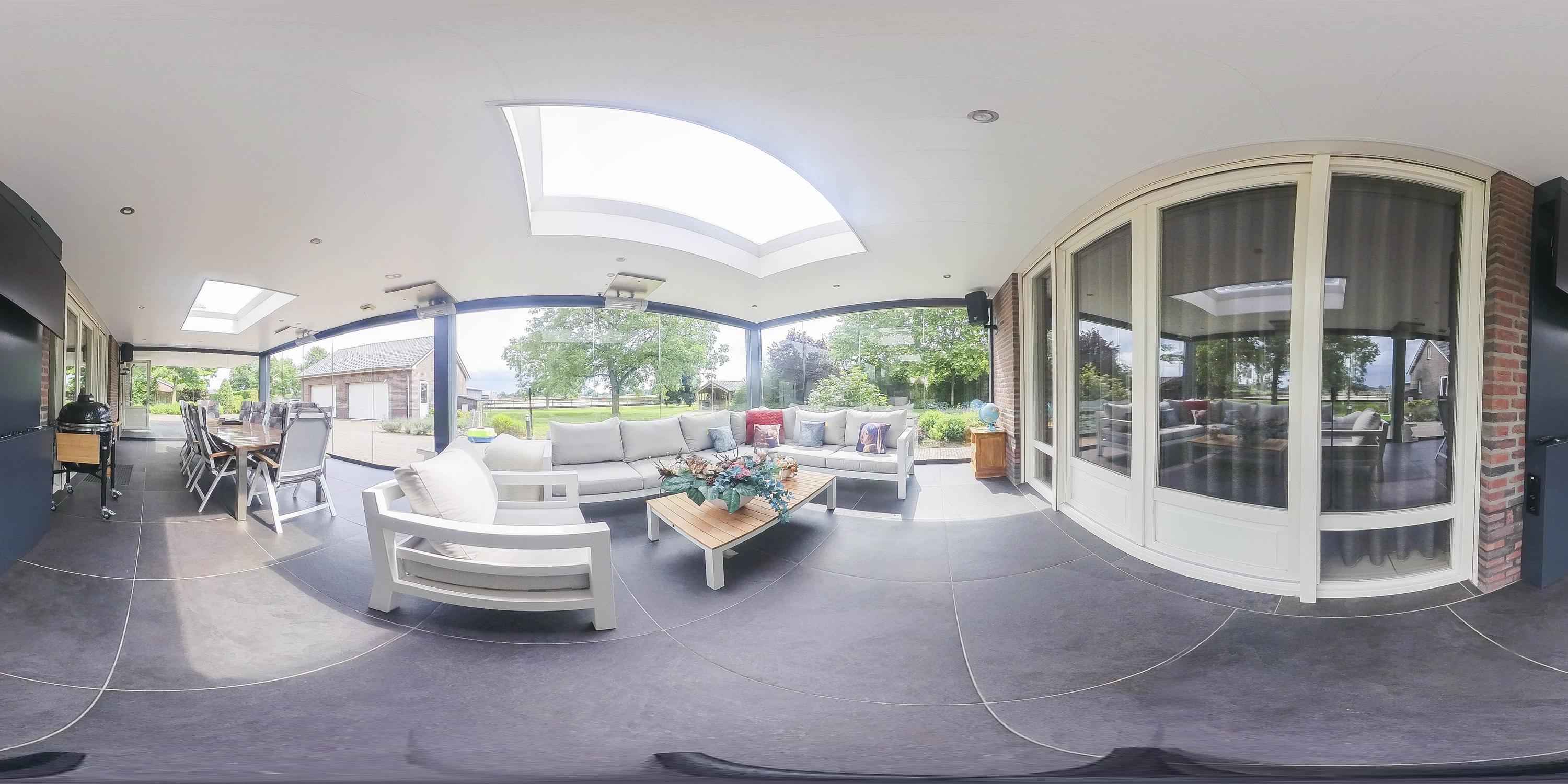 De tuin is voorzien van een royaal overdekt terras met glazen schuifwanden, zodat u het hele jaar door kunt genieten van het buitenleven. Vanuit het terras heb je een fraai uitzicht op de tuin en zelfs op de buitenpiste. Daarnaast is er een tuinhuis, een uitgestrekt gazon en diverse volwassen bomen en struiken aanwezig. Voor extra gemak beschikt de tuin over een beregeningsinstallatie. Het erf is grotendeels voorzien van betonklinkers. Een gedeelte, de weg tot aan de garage is afgewerkt met gebakken klinkers. Het deel vanaf de weg, naast de stal en tot aan de achterzijde van de stal is voorzien van gebroken asfalt. Er zijn 2 opritten aanwezig, er is een aparte oprit die toegang biedt tot de accommodatie.