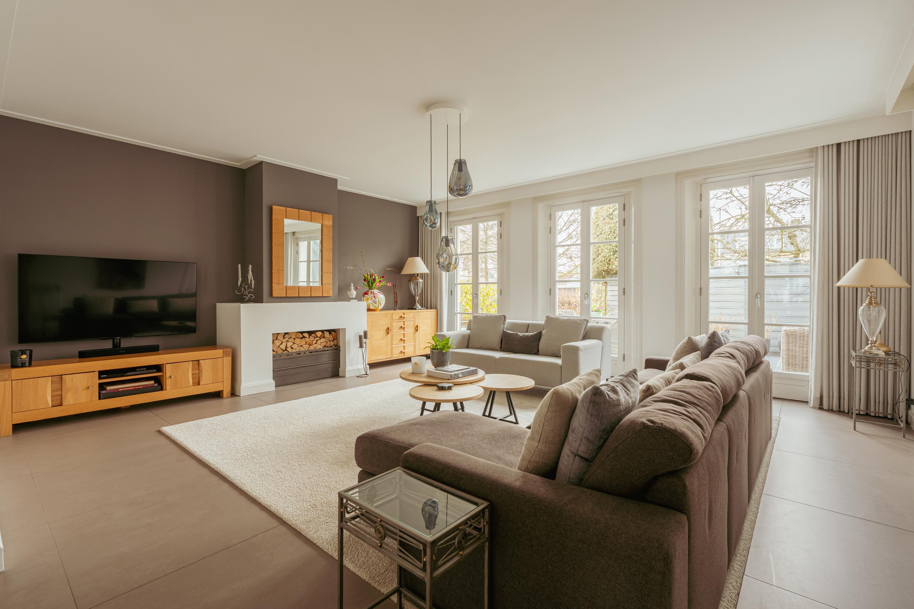 Dankzij de grote raampartijen voelt deze verdieping bijzonder licht en ruim aan. Aan de achterzijde geven drie openslaande deuren toegang tot het zonnige terras.