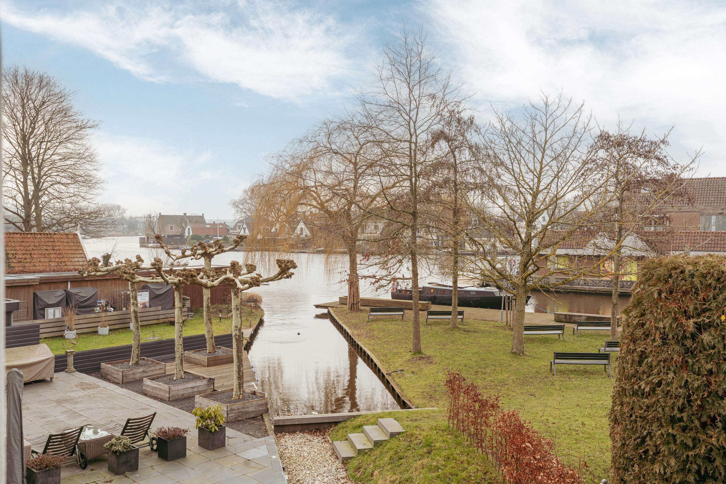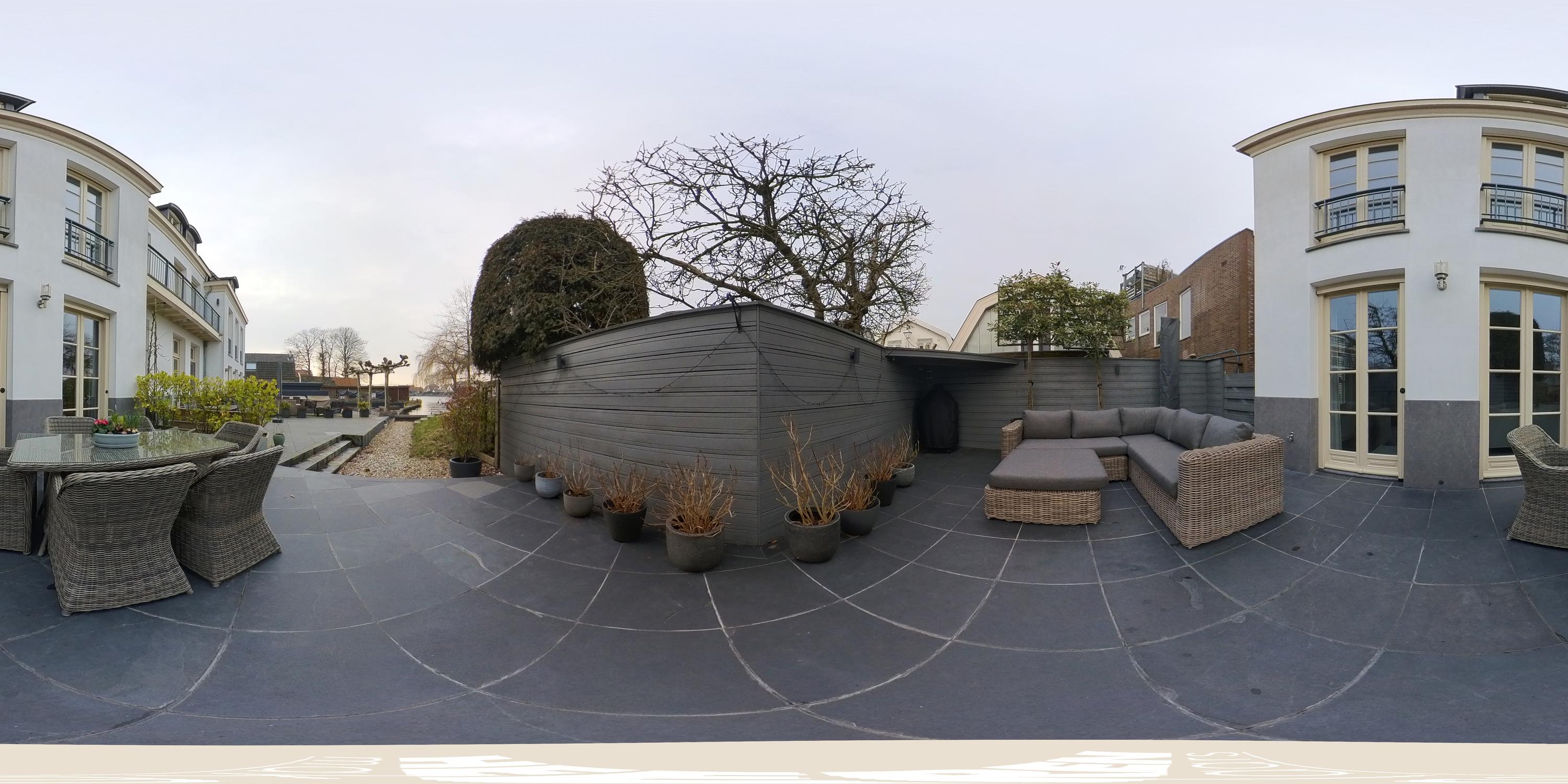 Het terras is afgewerkt met antracietkleurige tegels en heeft een uitzonderlijk mooi uitzicht over de Amstel. Een heerlijke plek om op zomerse avonden met vrienden te genieten van een borrel en het uitzicht over het water, en in de winter behoort schaatsen hier zelfs tot de mogelijkheden. In de voortuin bevindt zich een separate berging van circa 7 m², voorzien van elektra. Langs de woning is tevens een achterpad aanwezig.