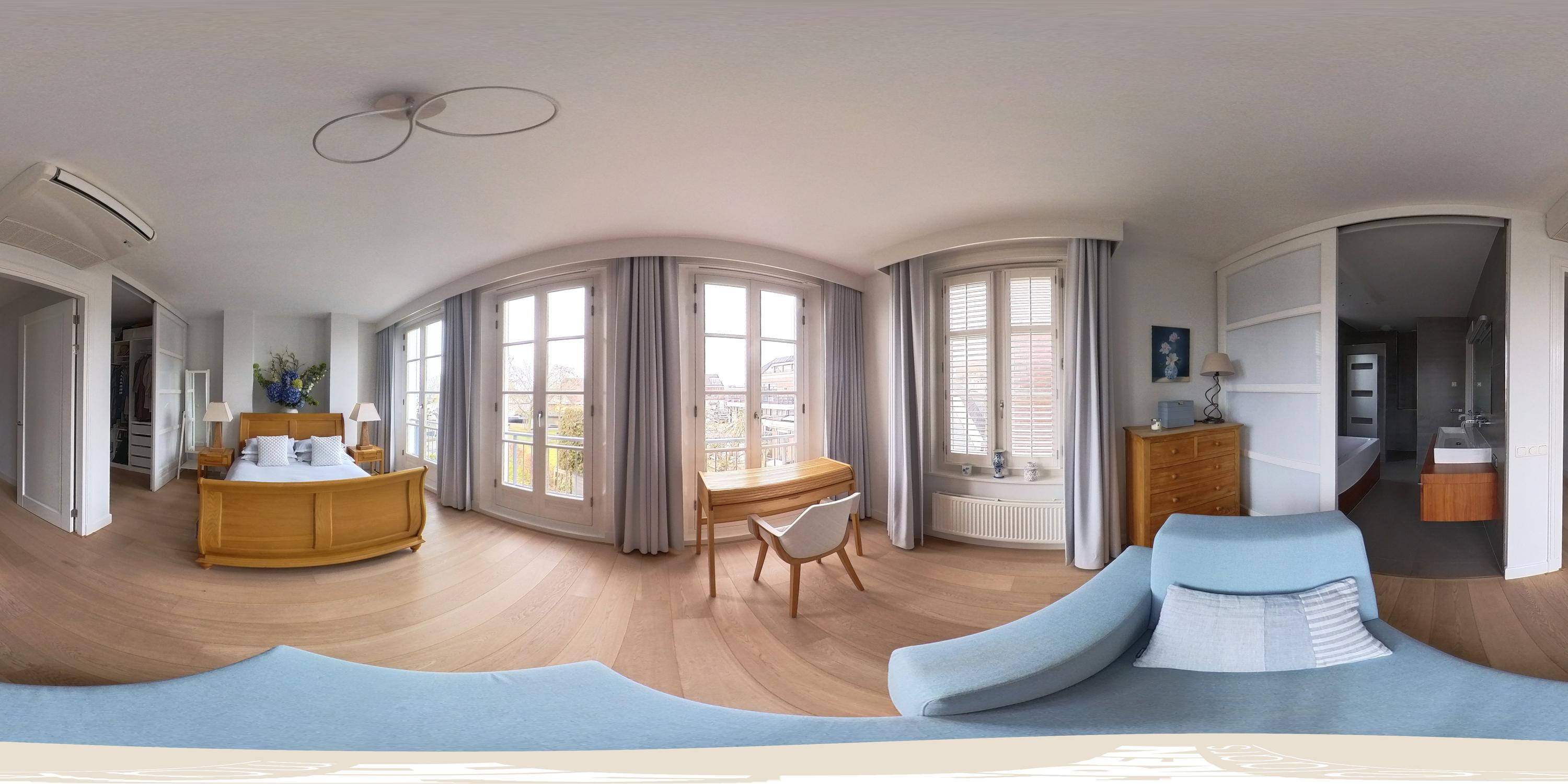 De royale hoofdslaapkamer aan de achterzijde beschikt over airconditioning en een afsluitbare inloopkast met schuifdeuren en biedt directe toegang tot de en-suite badkamer. De badkamer is voorzien van vloerverwarming, een ligbad met bubbelsysteem, een inloopdouche en een dubbel wastafelmeubel en is tevens bereikbaar vanaf de overloop.