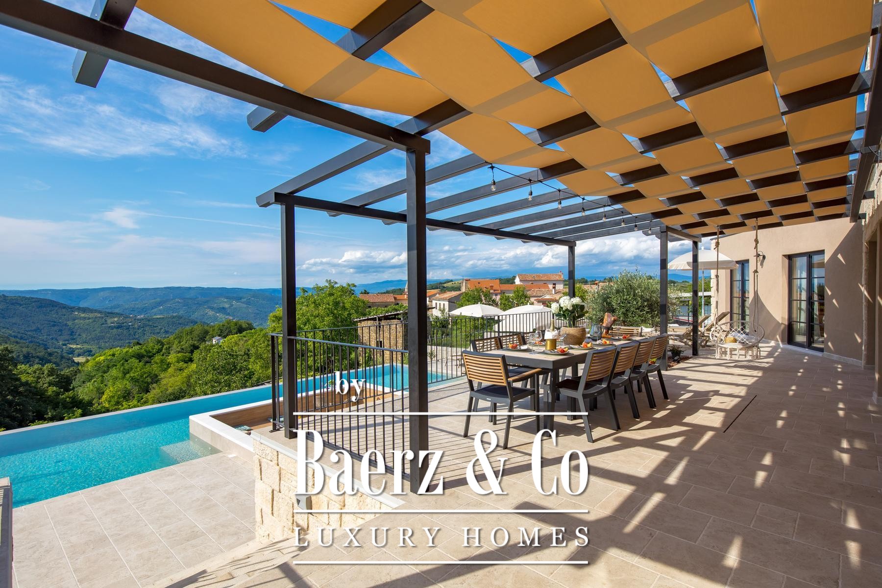 Luxe villa Pazin Okolica biedt 230 m² eigentijdse leefruimte, gelegen op een omheind perceel van 1.420 m² te midden van de zacht glooiende heuvels van Istrië. Het eigendom trakteert op weidse panoramische vergezichten, van het weelderige landschap tot aan Slovenië en Italië, en biedt het zeldzame gevoel van vrijheid en beslotenheid dat kenmerkend is voor de regio.