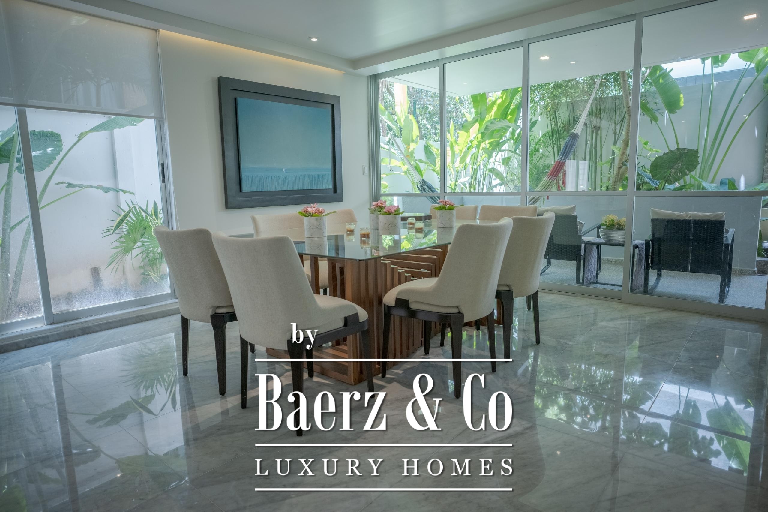 En planta baja, disfruta de una sala-comedor amplia con ventanales corredizos que se abren completamente hacia una terraza integrada con un hermoso jardín tropical, creando un ambiente ideal para el descanso o la convivencia. La cocina equipada cuenta con barra integrada al comedor, cubierta de granito negro y carpintería en madera, perfecta para quienes aman cocinar o recibir invitados.