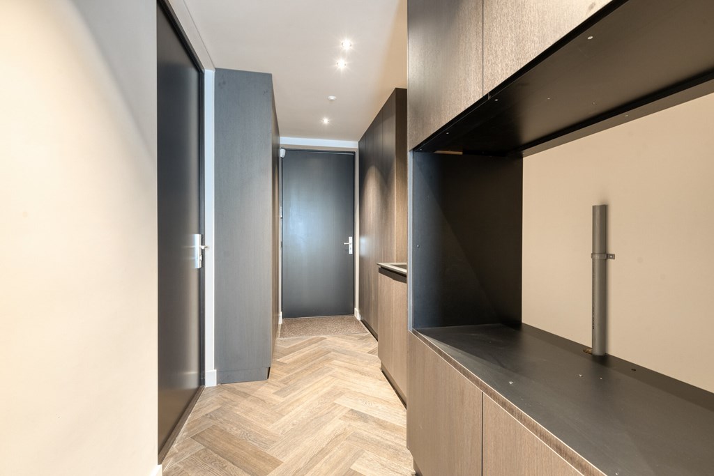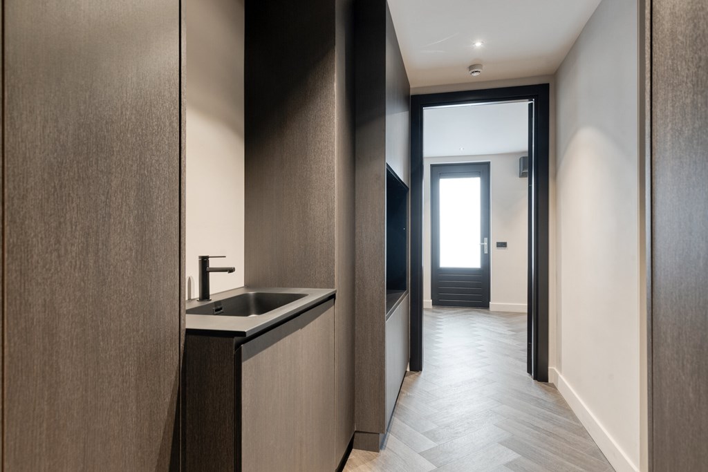 De moderne badkamer is volledig betegeld en voorzien van een inloopdouche met glazen wand, een dubbele wastafel met spiegel en Sonos-speaker. Op de overloop bevindt zich een separate toiletruimte met zwevend toilet. Alles straalt kwaliteit en comfort uit.