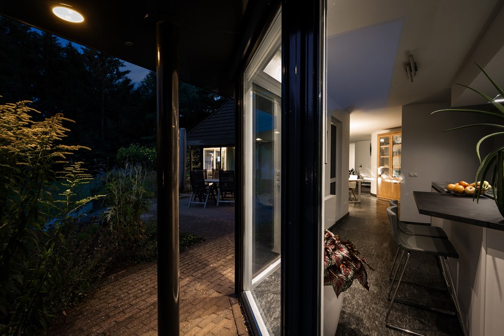 U komt binnen in een ruime, lichte hal die toegang geeft tot de woonkamer, een werkkamer, toiletruimte, meterkast (21 groepen + glasvezel) en de trapopgang. De werkkamer is ideaal en perfect bereikbaar om bijvoorbeeld klanten te ontvangen. De royale woonkamer heeft een bijzondere indeling, waardoor u gemakkelijk verschillende zithoeken kunt creëren. De grote ramen rondom bieden een prachtig uitzicht op de tuin en zorgen voor veel licht. Een sfeervolle gashaard voegt extra warmte toe. Via een dubbele schuifpui loopt u zo de zonnige achtertuin in. Aan de zonnige kant zorgen screens voor extra comfort. De ruime keuken met een eigen deur naar de tuin is ideaal voor het bereiden van maaltijden. Aangrenzend aan de keuken vindt u een bijkeuken met een aanrecht voorzien van spoelbak en aansluitingen voor de wasmachine en droger. De gehele benedenverdieping is voorzien van een natuurstenen vloer met vloerverwarming. In de woonkamer bevindt zich ook een airco.