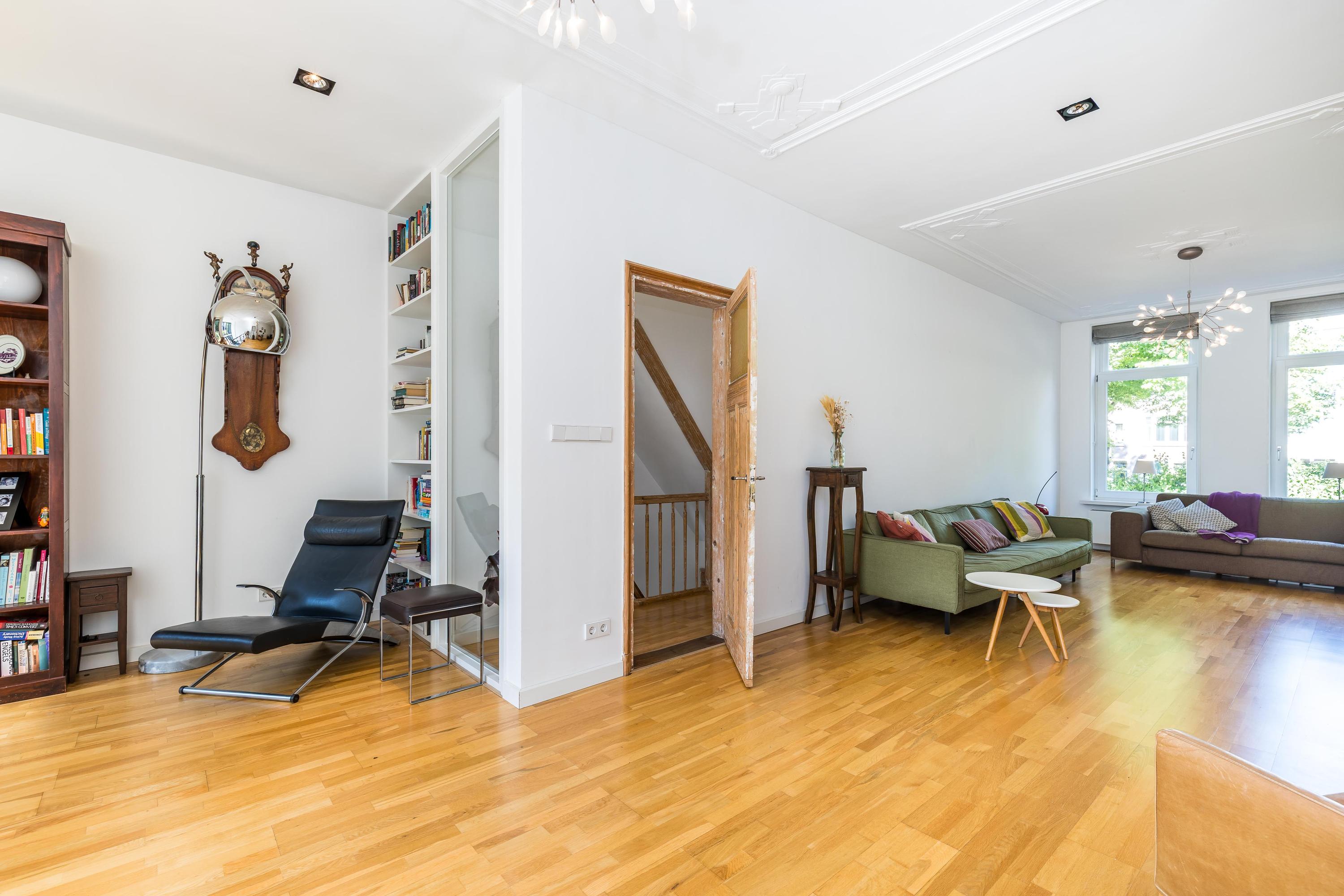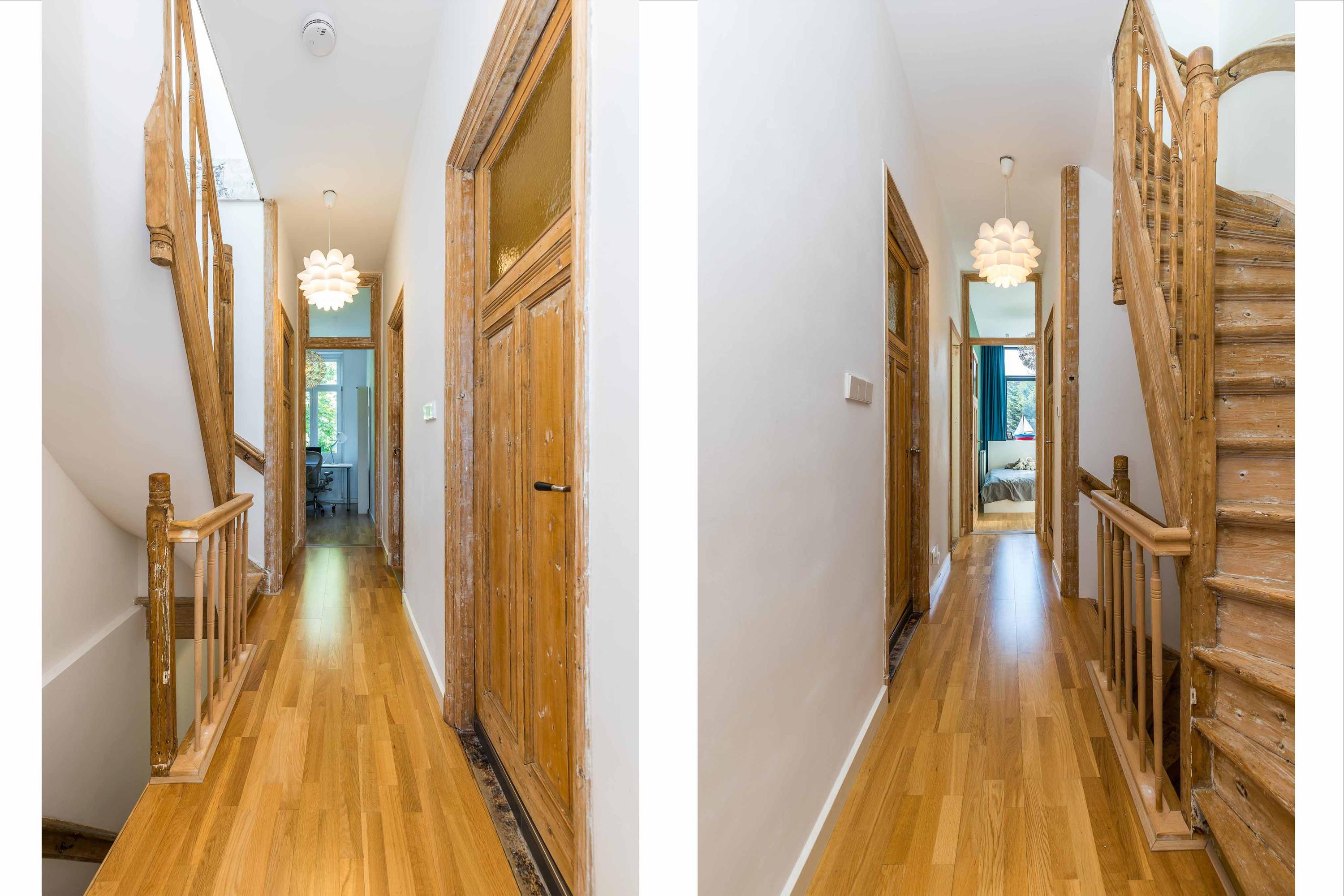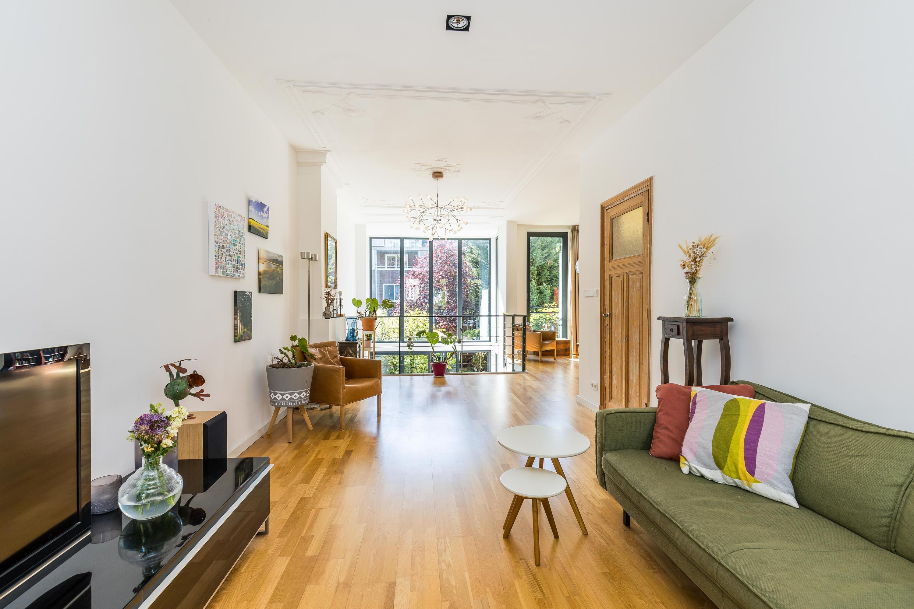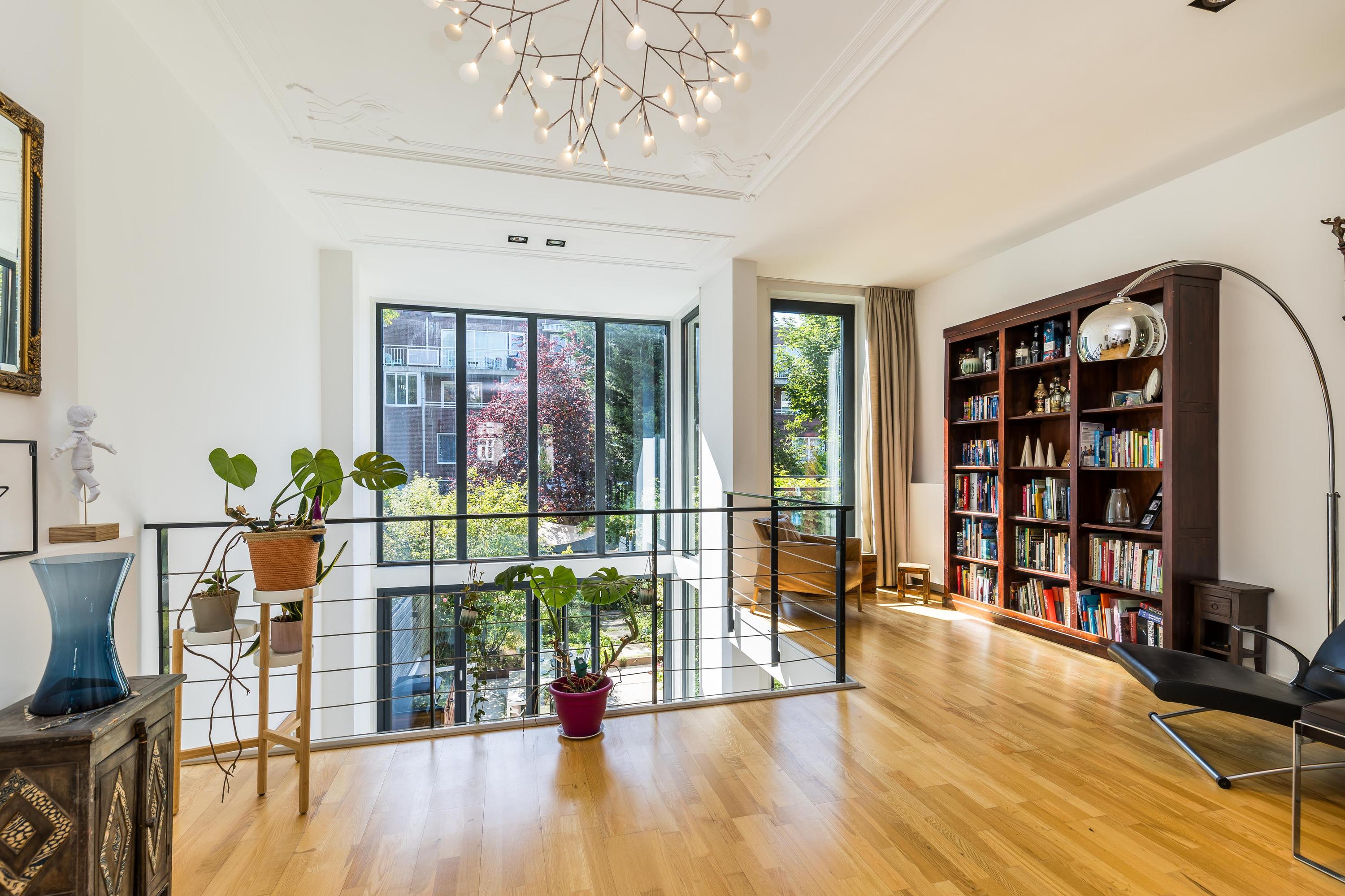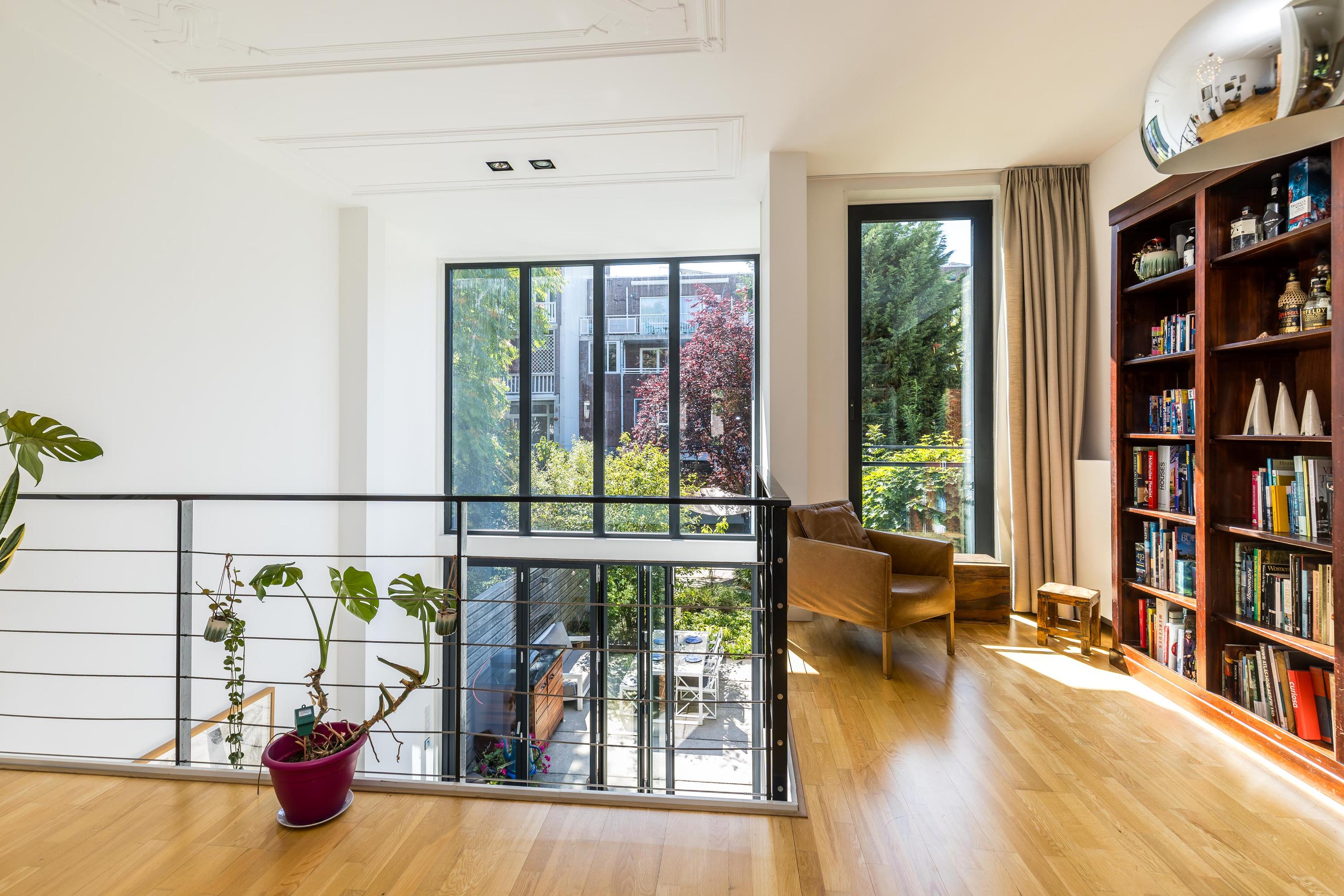 Overloop, toegang tot de ruime woonkamer met veel lichtinval door de spectaculaire vide aan de achterzijde en de raampartijen aan de voorzijde. Aan de voorzijde bevindt zich de knusse zitkamer met mooi uitzicht op de groene Bergselaan, terwijl de achterzijde een prachtig uitzicht biedt op de achtertuin.