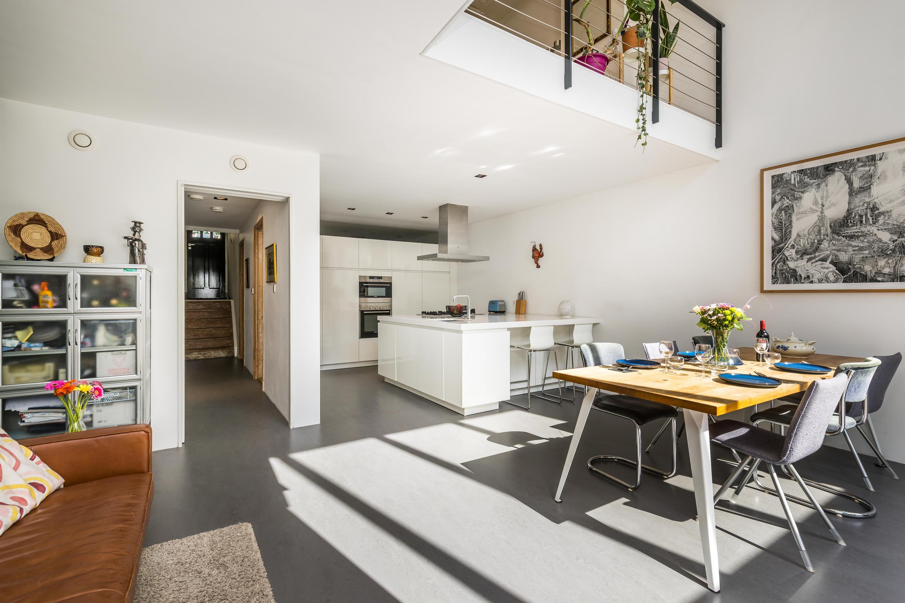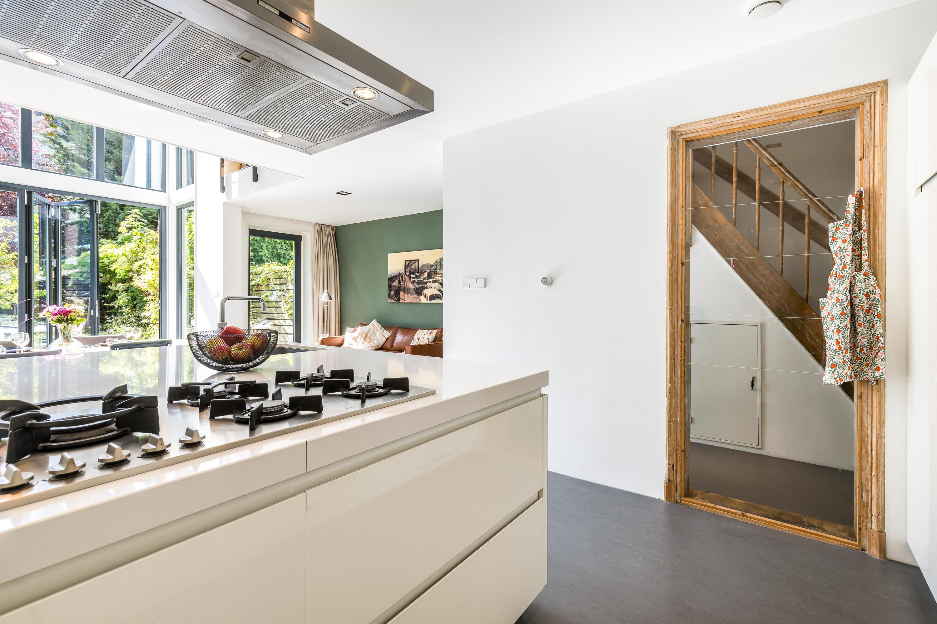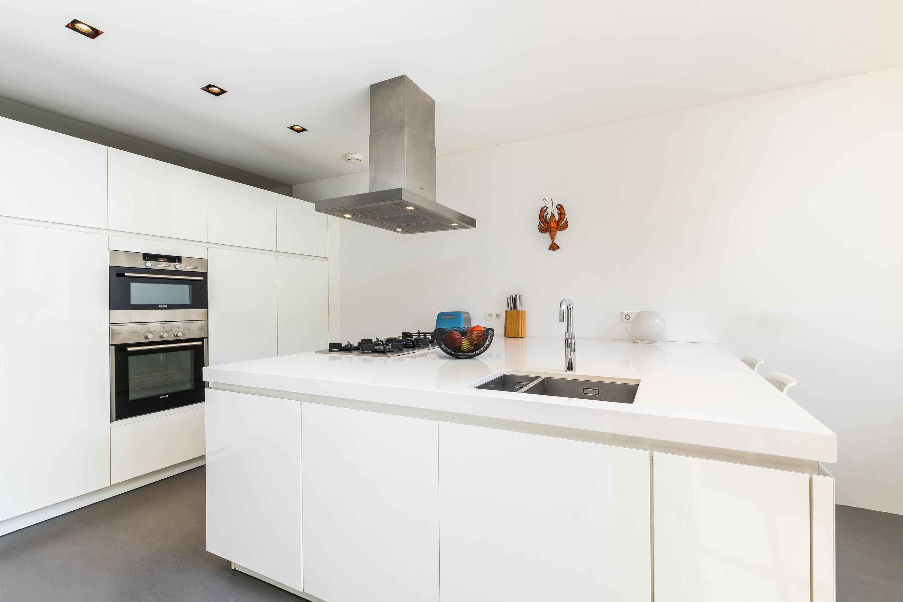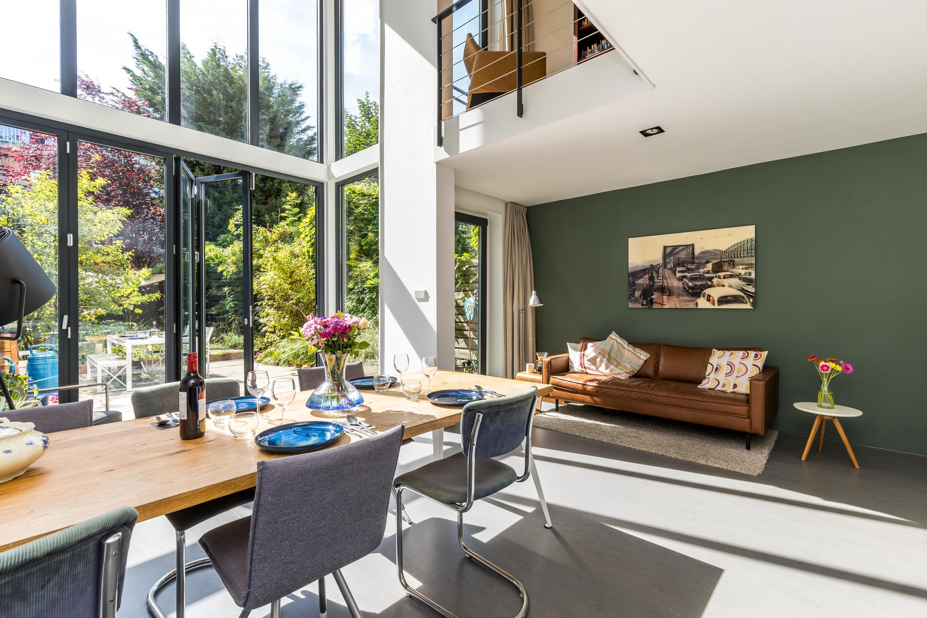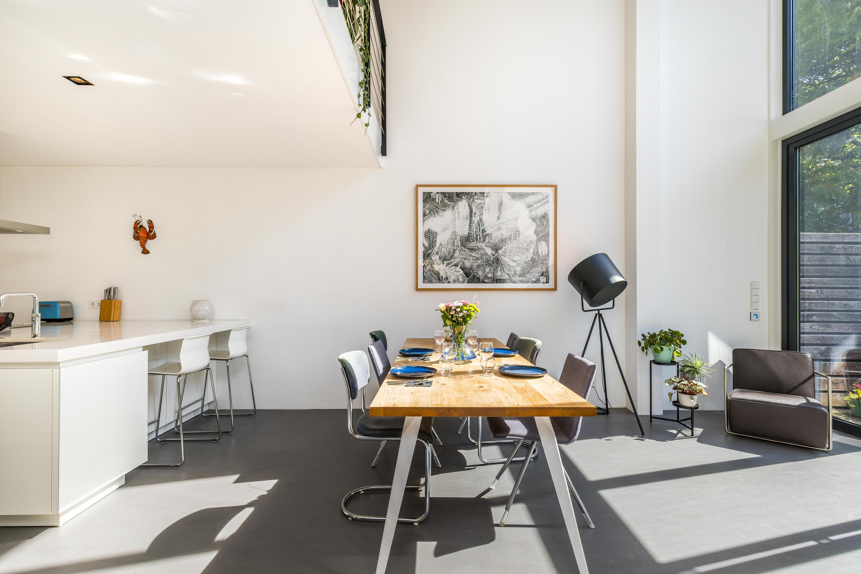 Entree via de hal met toegang tot de berging/fietsenstalling, een moderne toiletruimte met hangcloset en fonteintje. De royale keuken is uitgerust met een luxe keukenblok voorzien van hoogwaardige inbouwapparatuur en strak gestucte wanden. Aansluitend bevindt zich de eetkamer, waar het opvallend hoge plafond en de grote aluminium raampartijen zorgen voor een prachtige lichtinval. Via de stijlvolle harmonicadeuren is het ruime terras bereikbaar, met aansluitend de zonnige achtertuin op het zuidoosten.