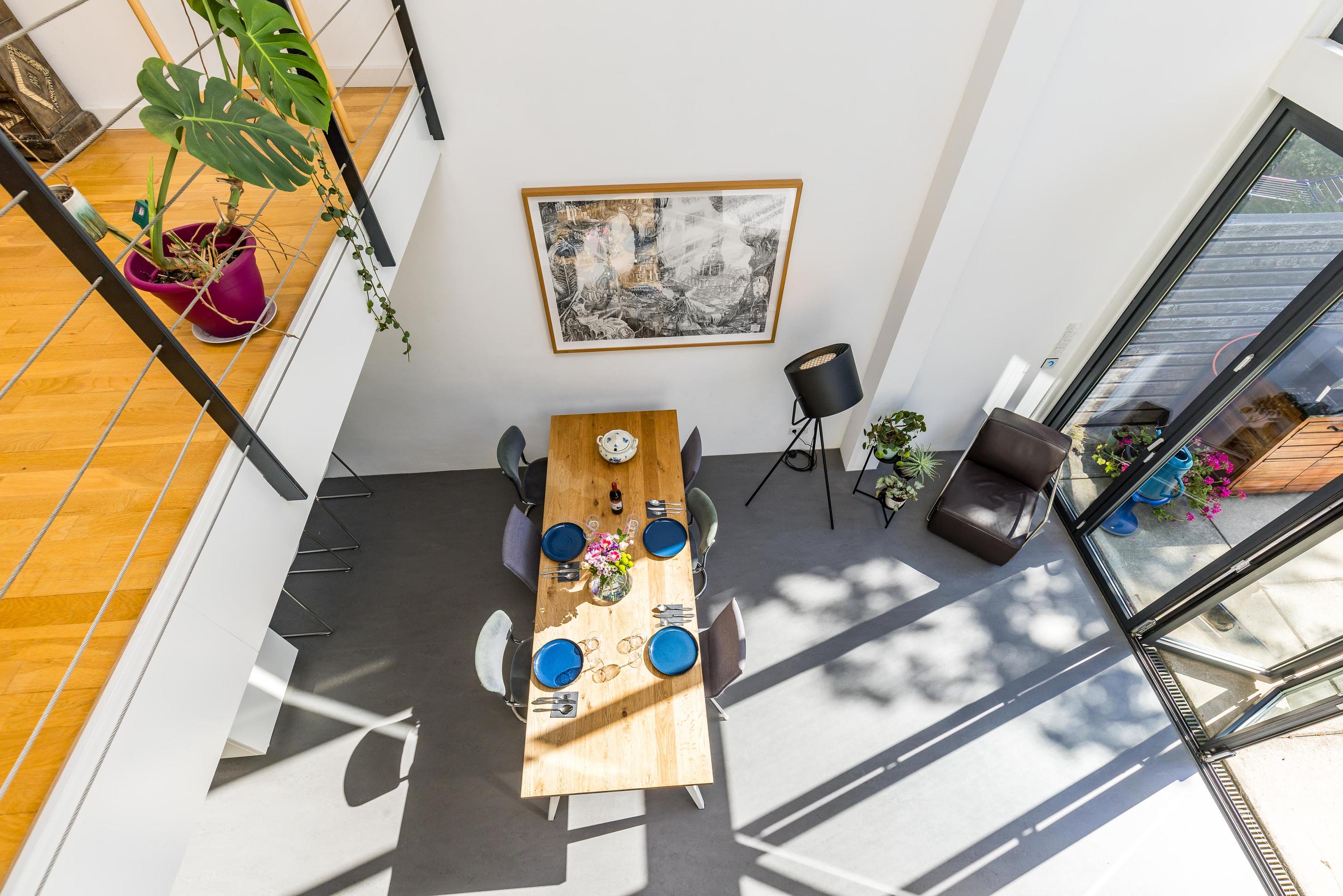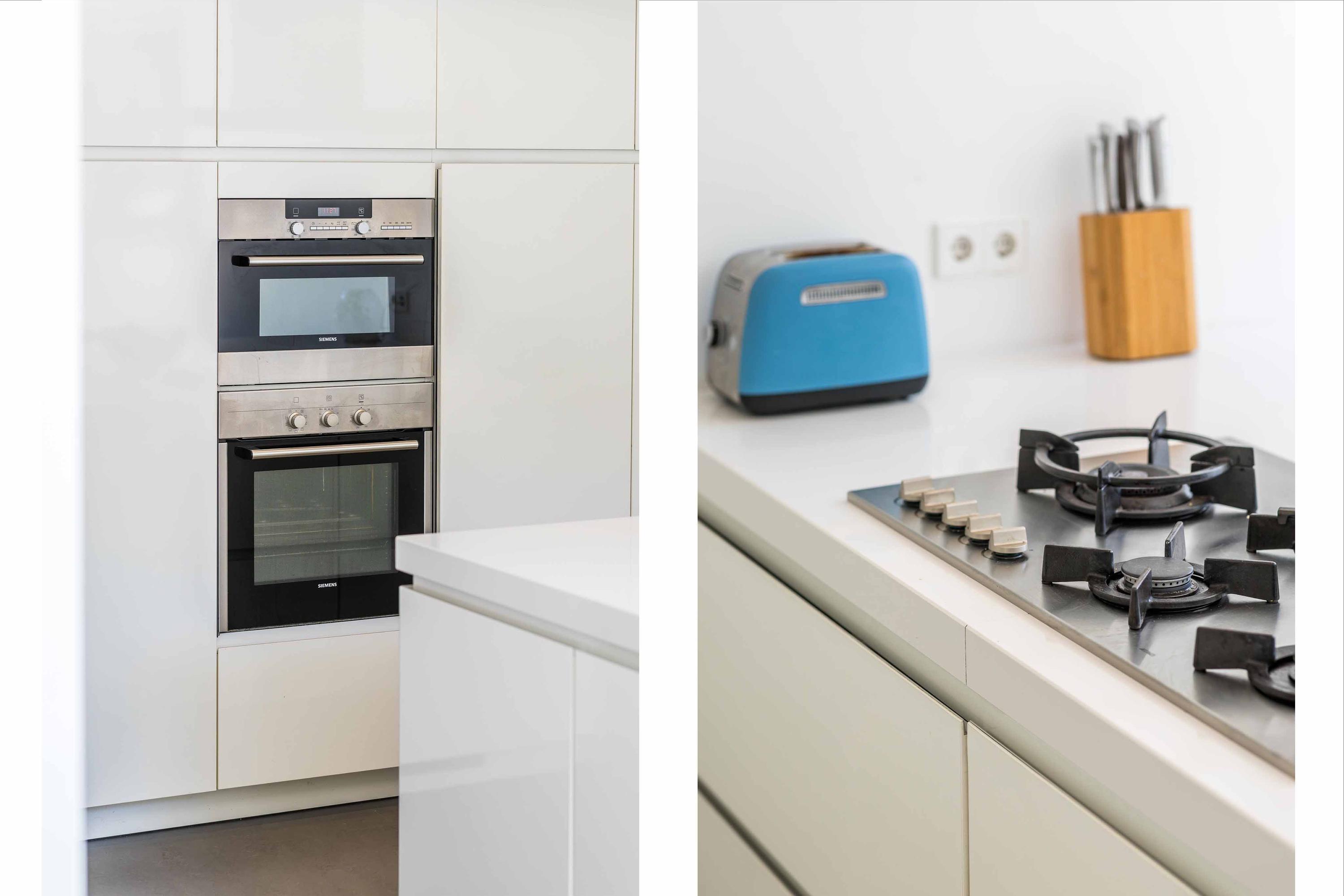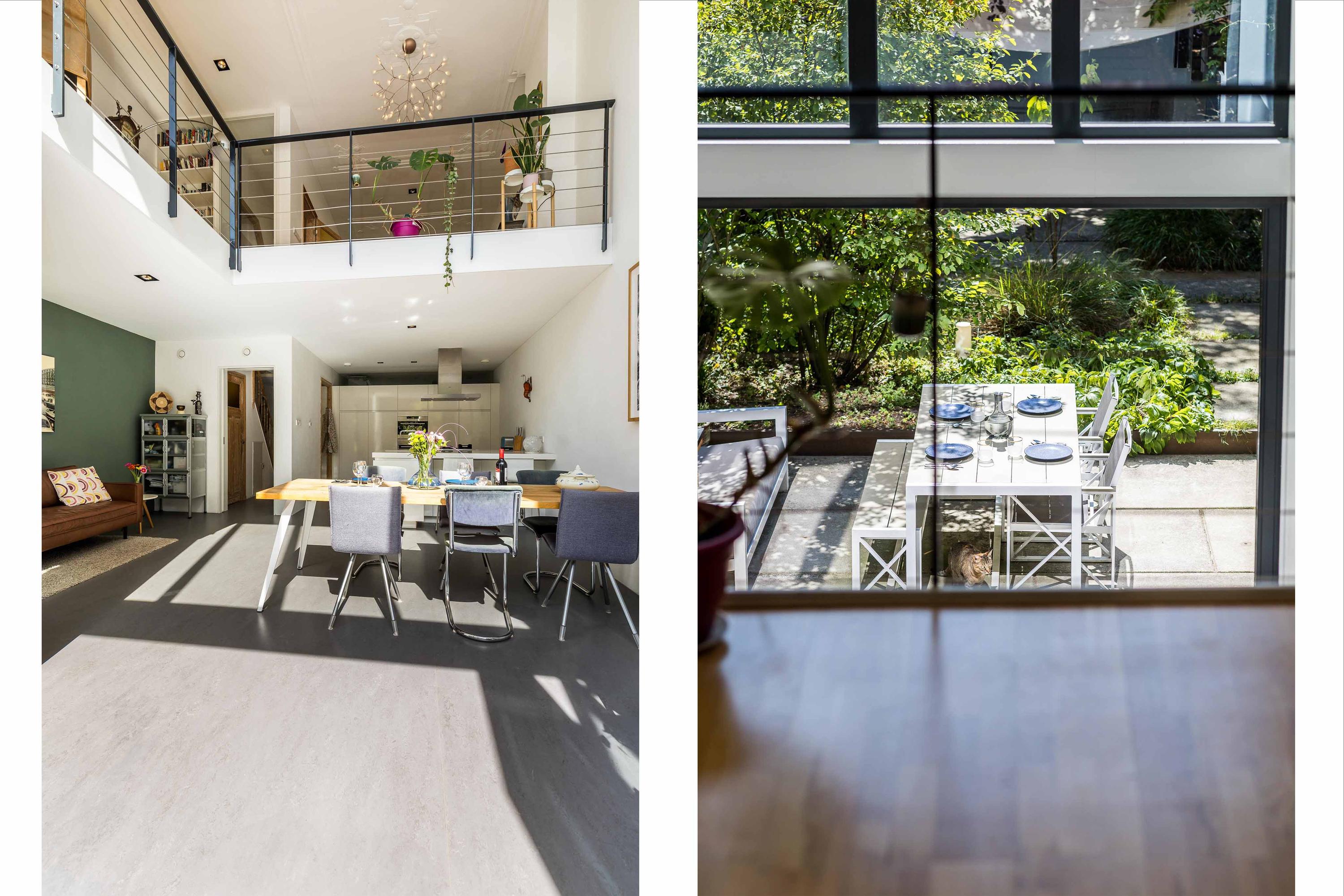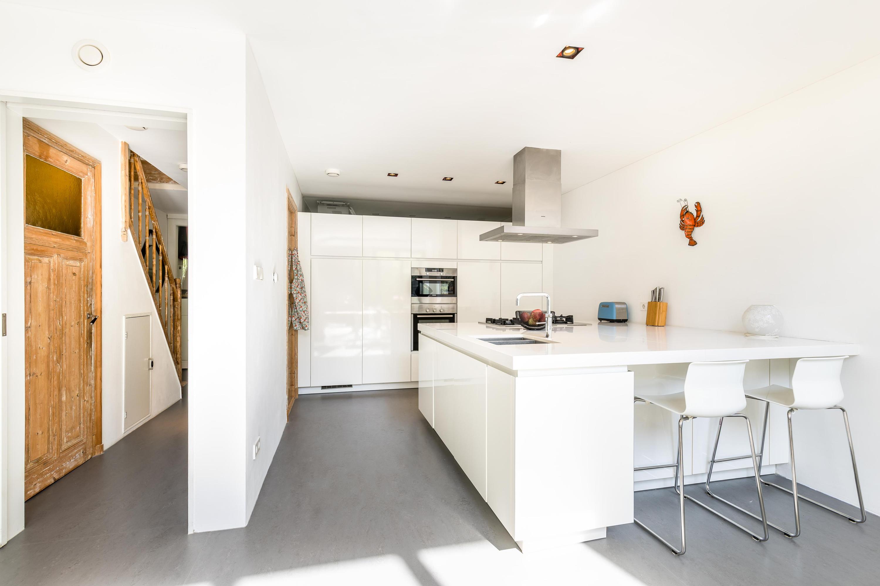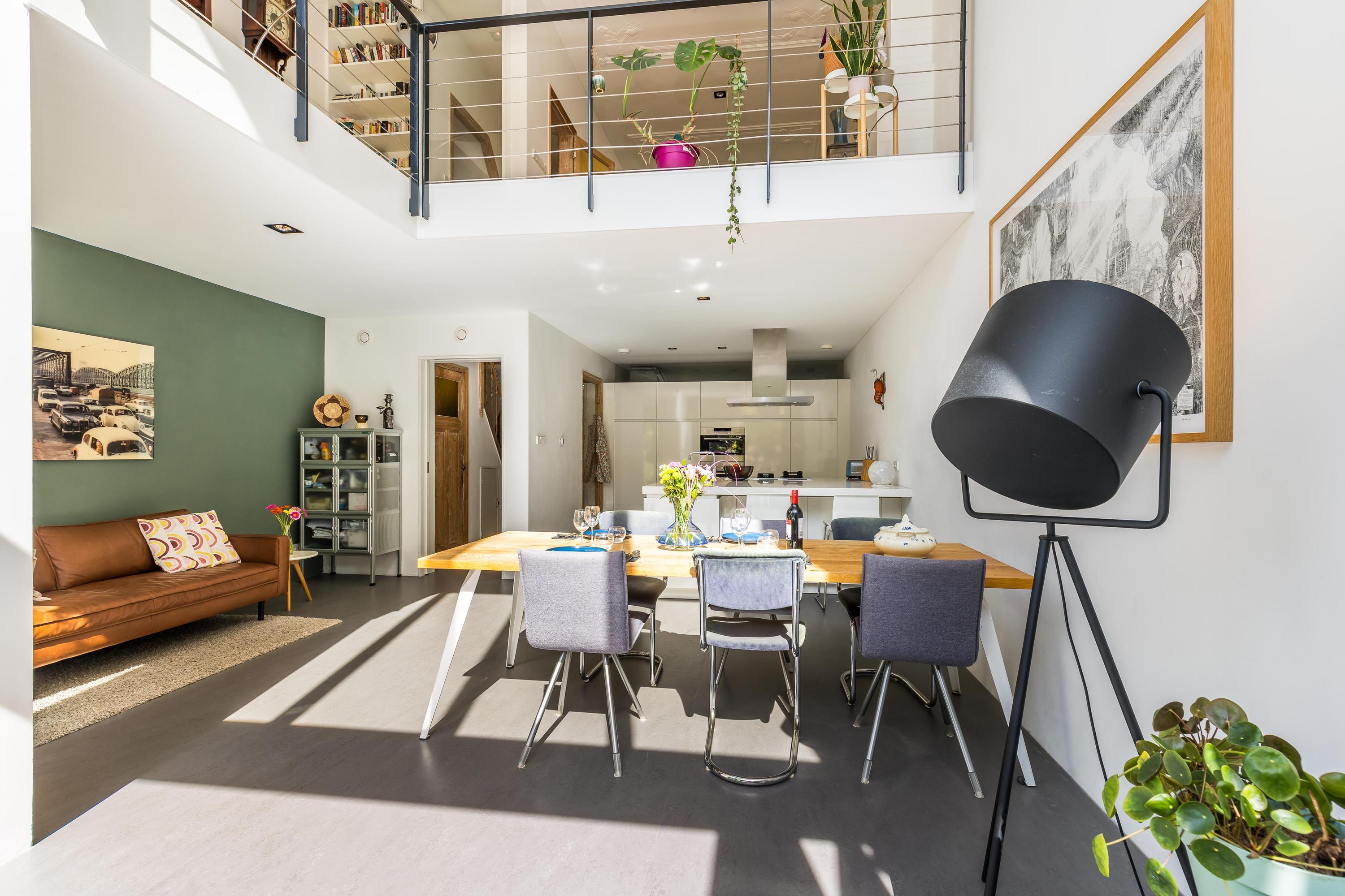 Entree via de hal met toegang tot de berging/fietsenstalling, een moderne toiletruimte met hangcloset en fonteintje. De royale keuken is uitgerust met een luxe keukenblok voorzien van hoogwaardige inbouwapparatuur en strak gestucte wanden. Aansluitend bevindt zich de eetkamer, waar het opvallend hoge plafond en de grote aluminium raampartijen zorgen voor een prachtige lichtinval. Via de stijlvolle harmonicadeuren is het ruime terras bereikbaar, met aansluitend de zonnige achtertuin op het zuidoosten.
