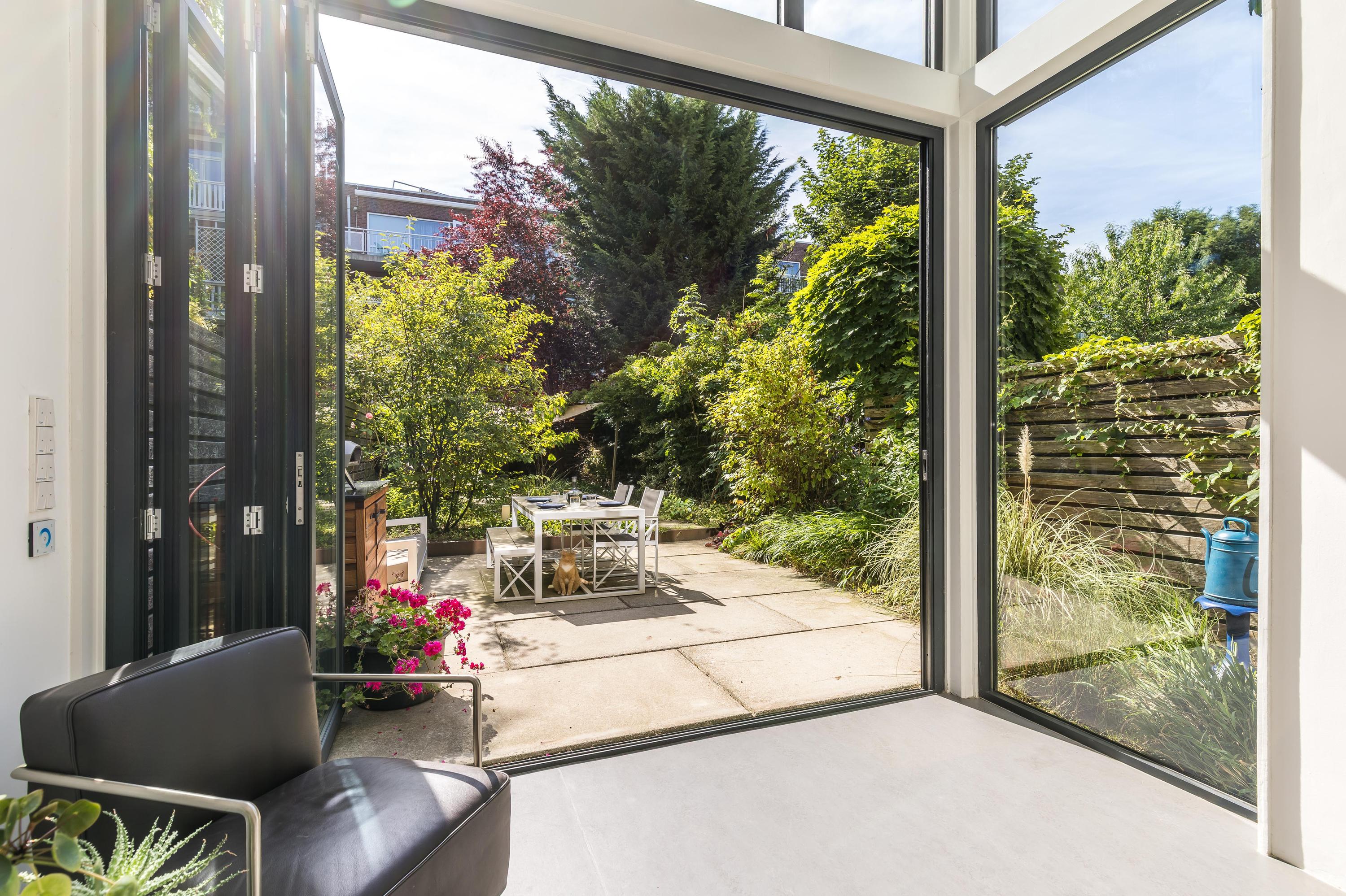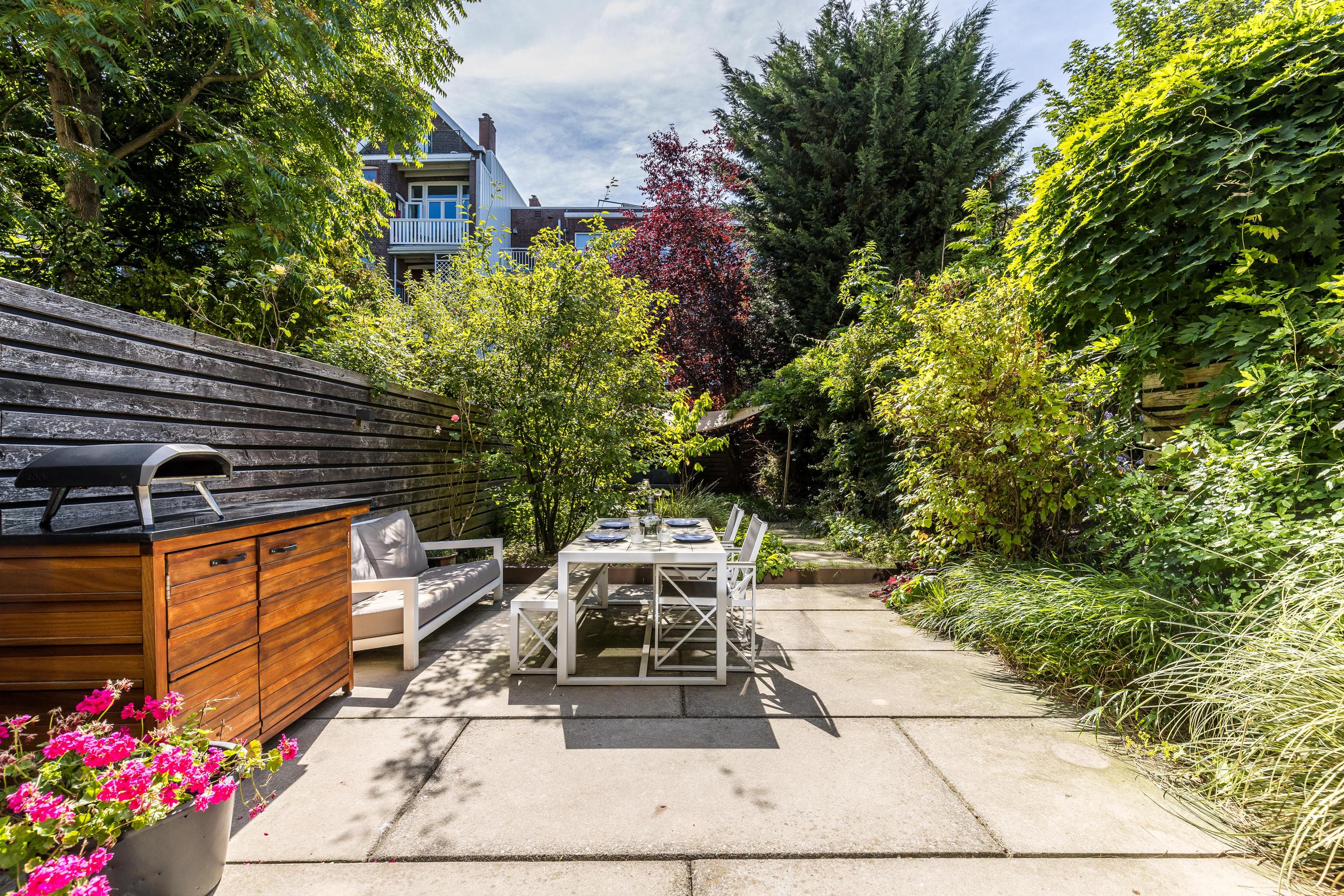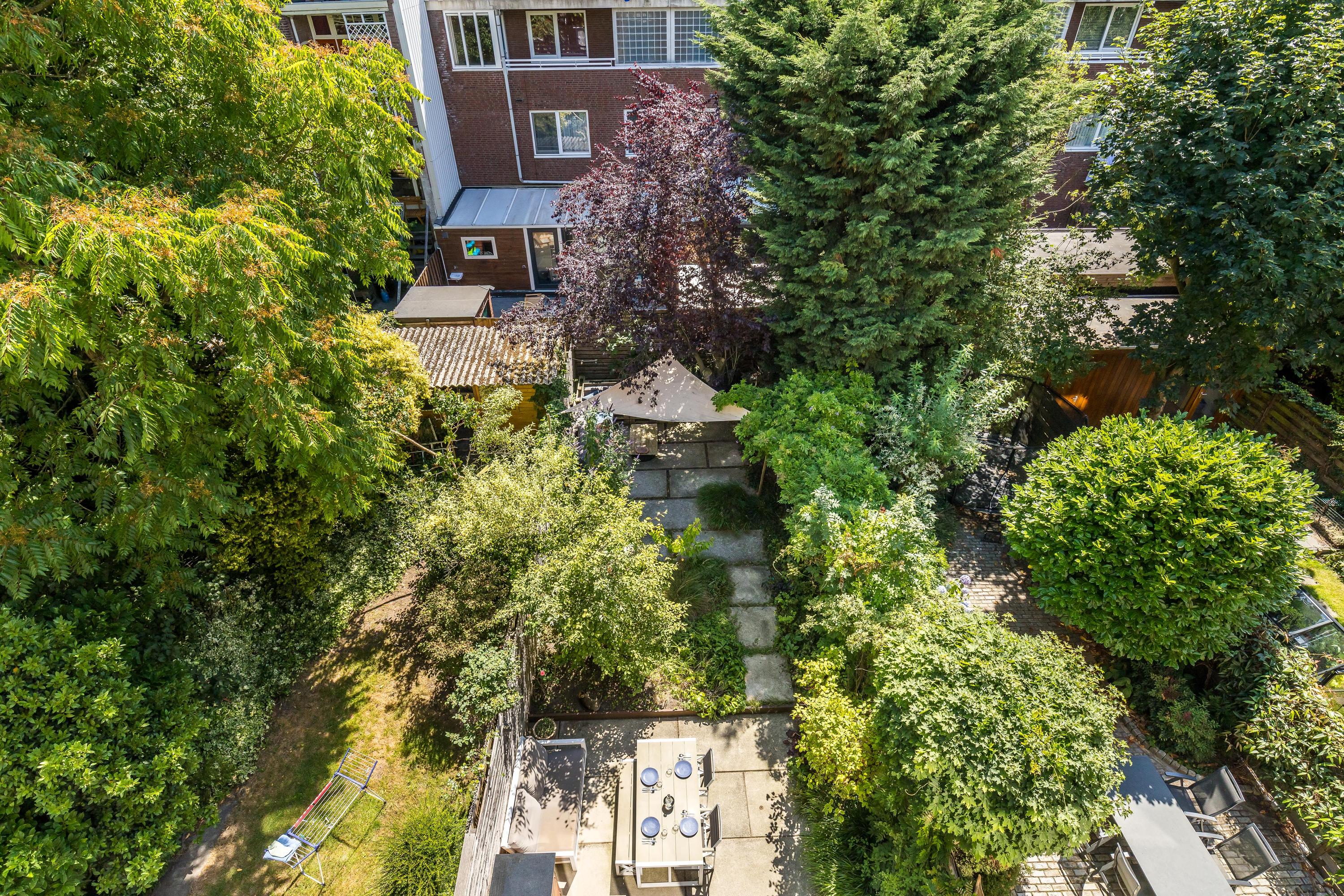 De bijzonder ruime en fraai aangelegde achtertuin van circa 81 m² beschikt over meerdere gezellige zitplekken en biedt het overgrote deel van de dag zon. Vanuit de tuin geniet je van een prachtig zicht op de stijlvolle woonkeuken.