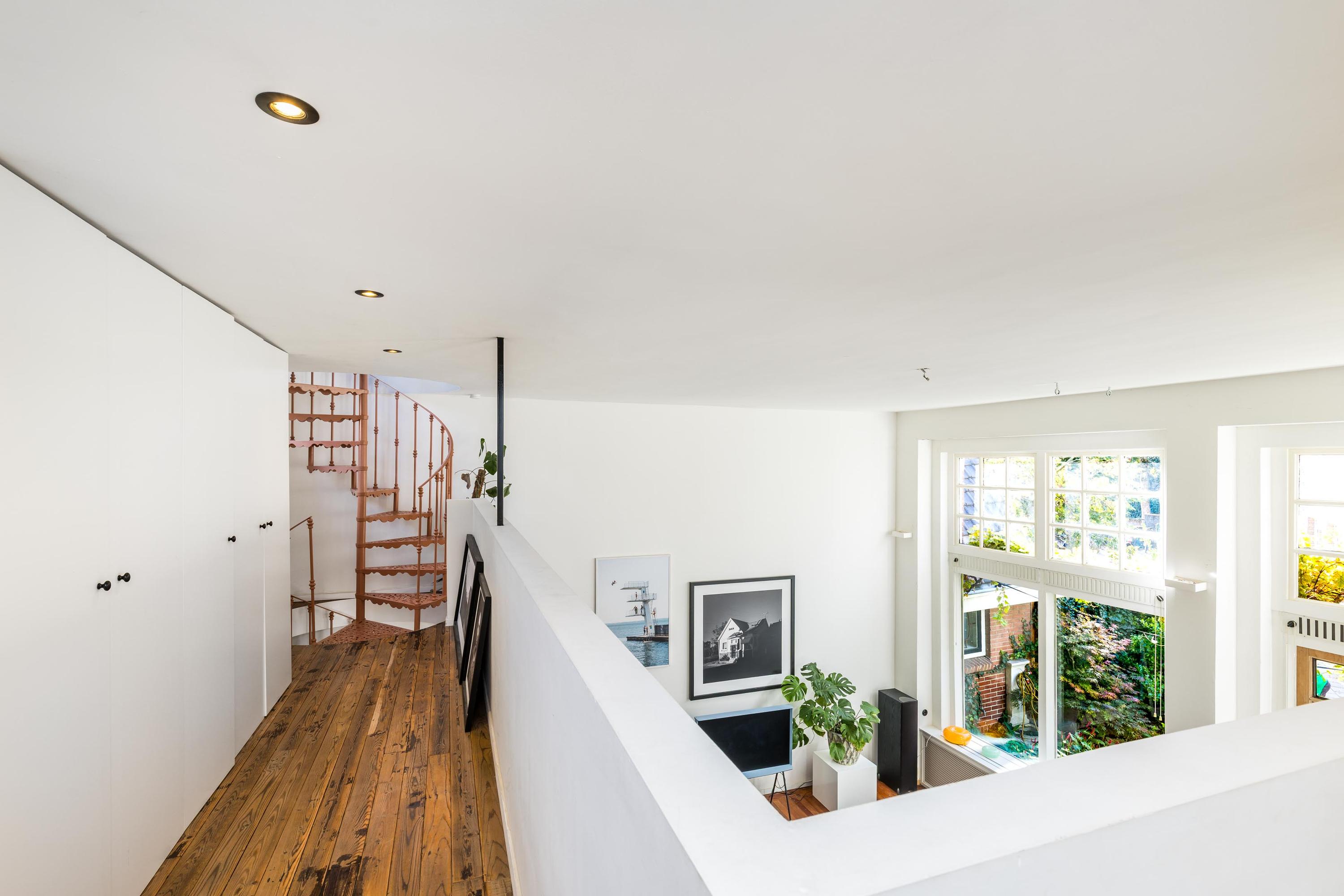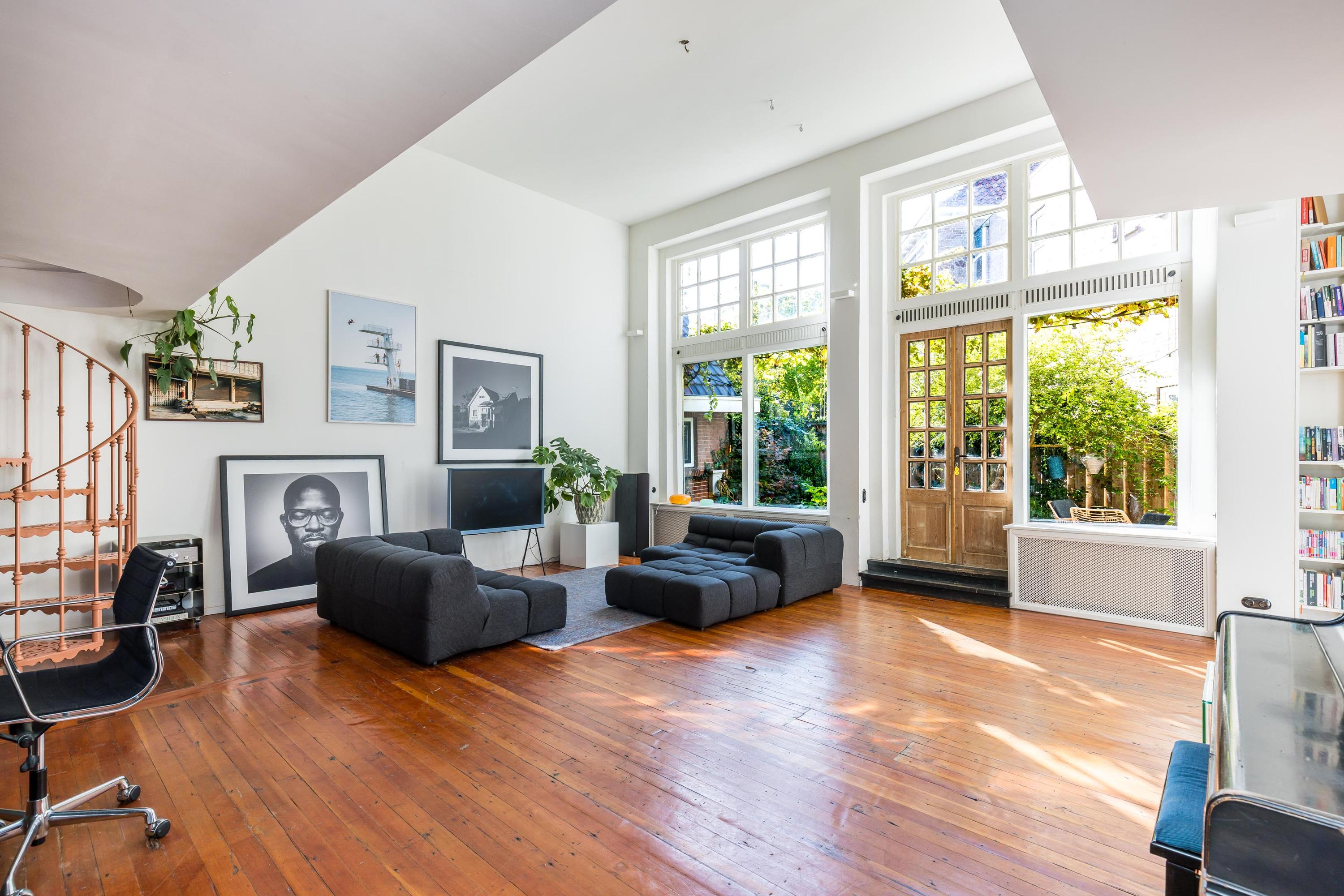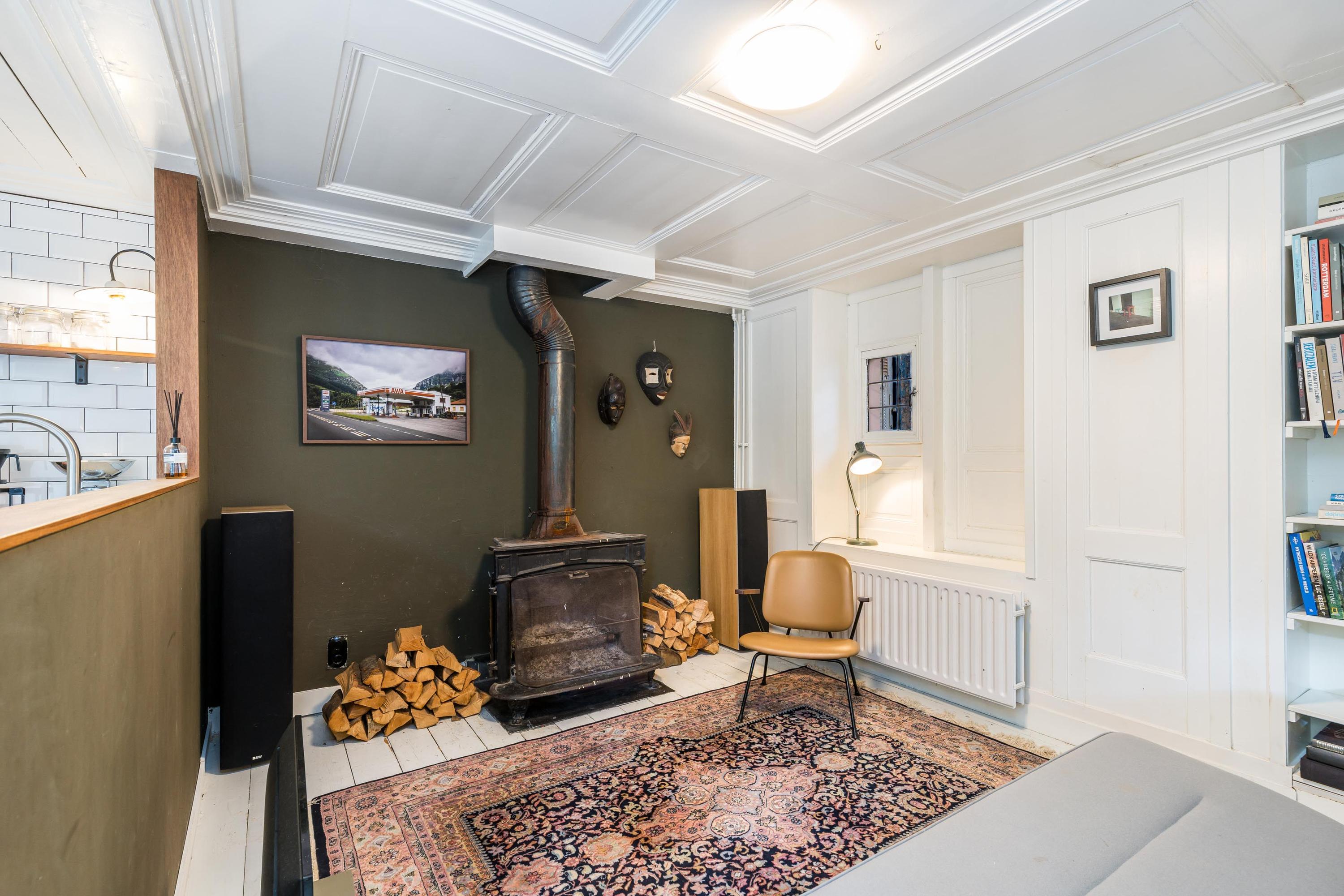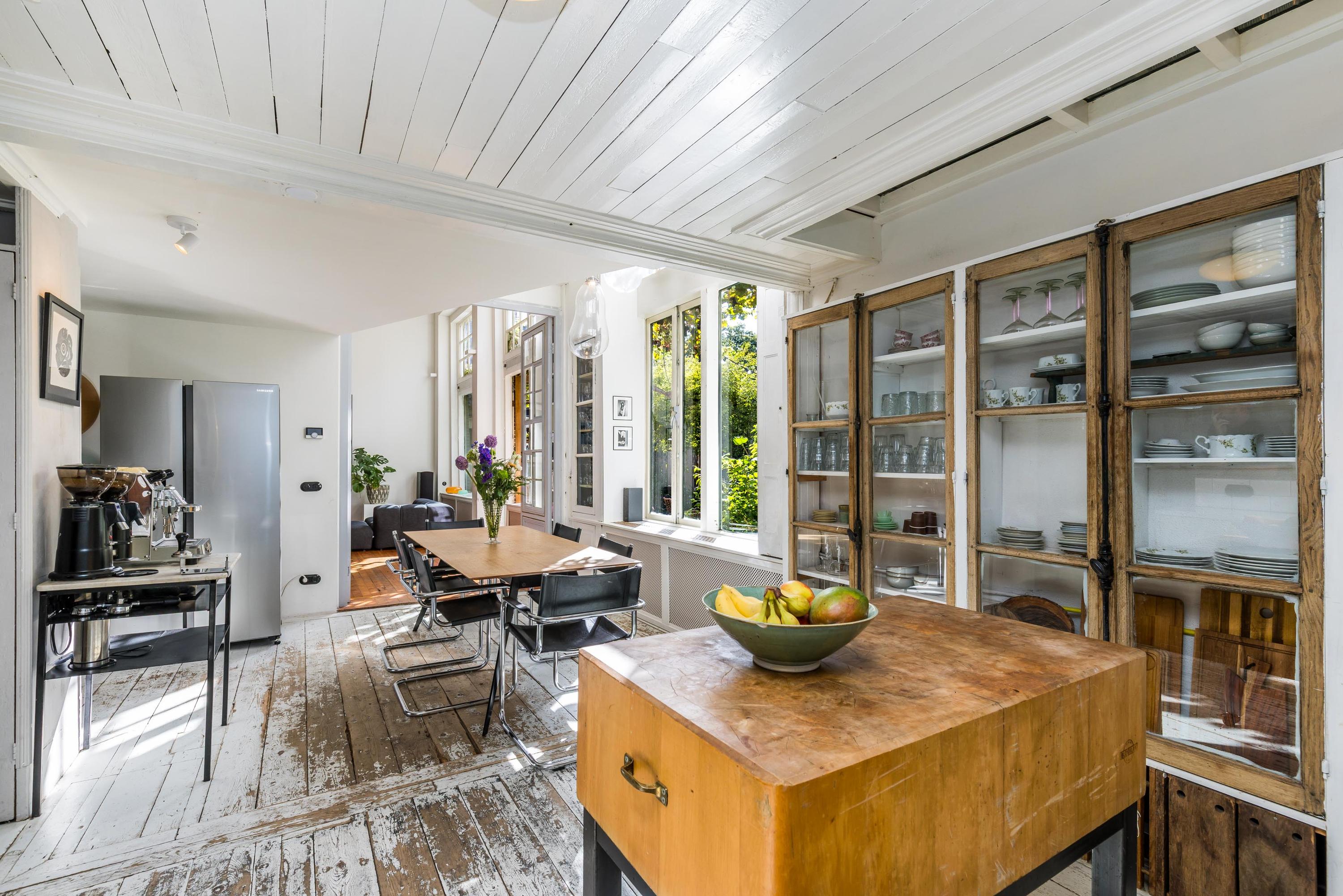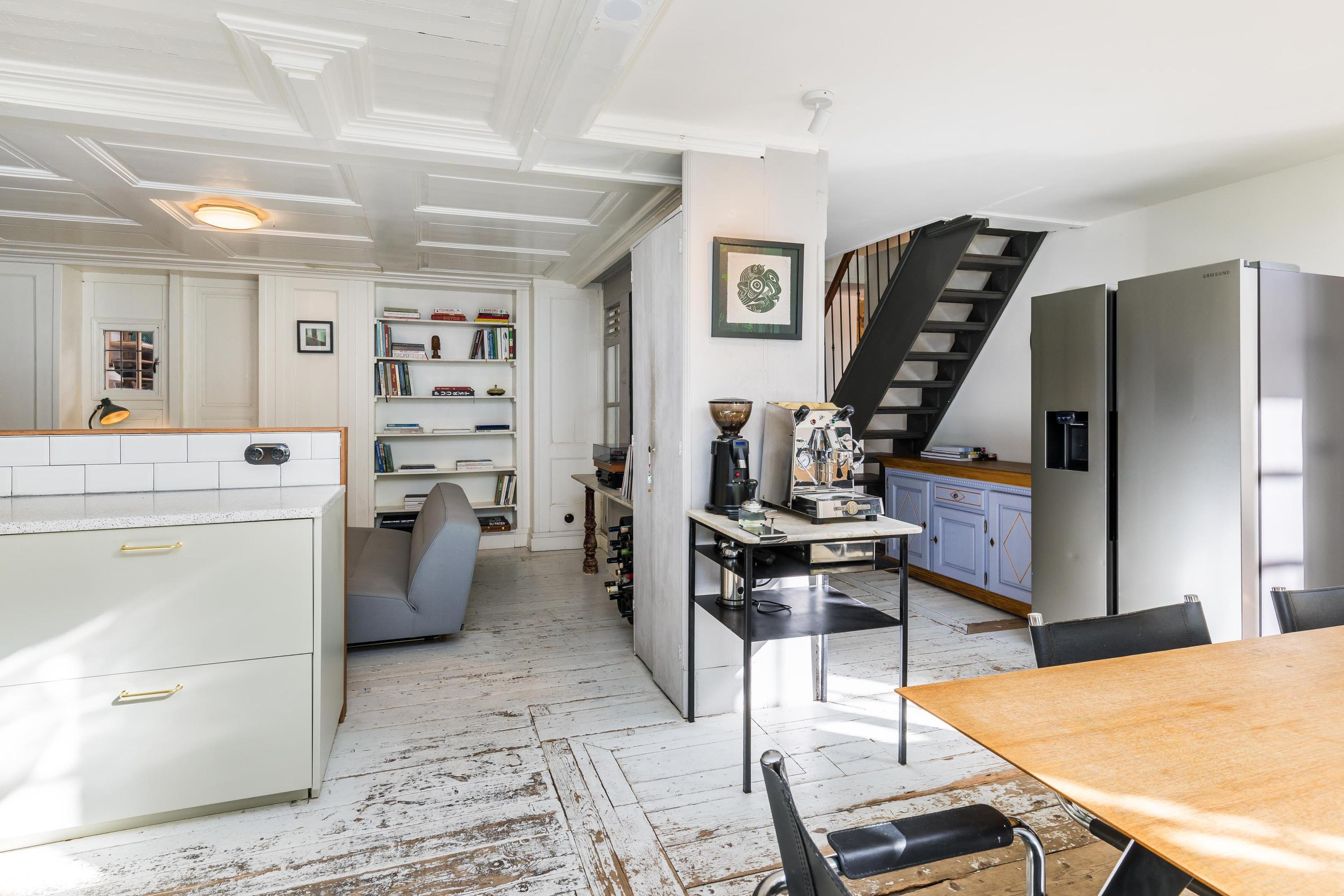 Binnen valt direct de woonkamer op: een indrukwekkende ruimte met hoogte, licht en karakteristieke details zoals hoge deuren en een opvallende wenteltrap. Aansluitend bevindt zich de leefkeuken, het hart van het huis, met een open haard, een knusse zithoek en volop ruimte om samen te koken en lang te tafelen.