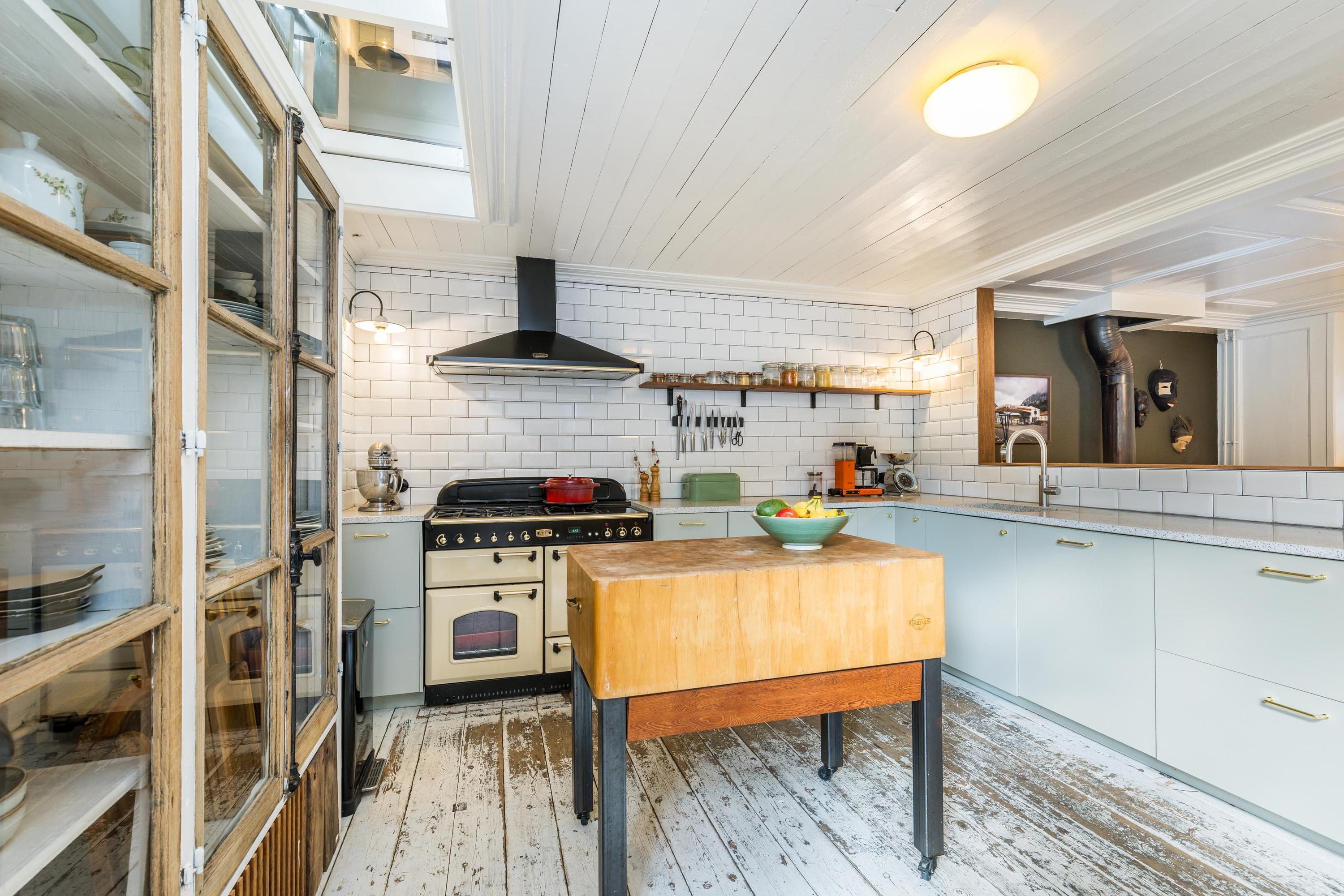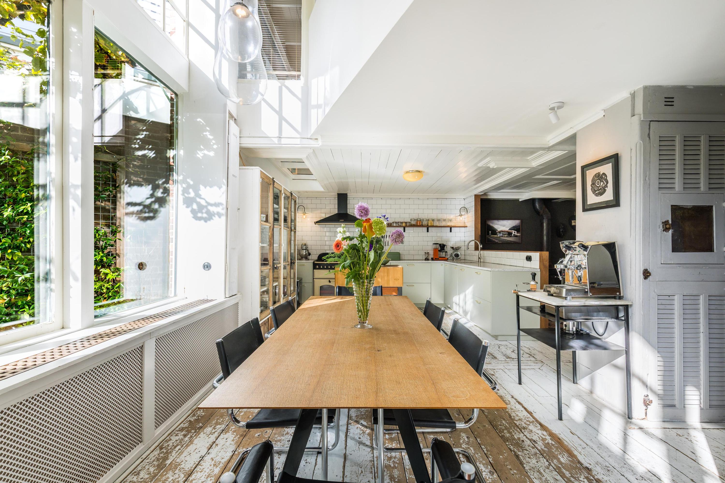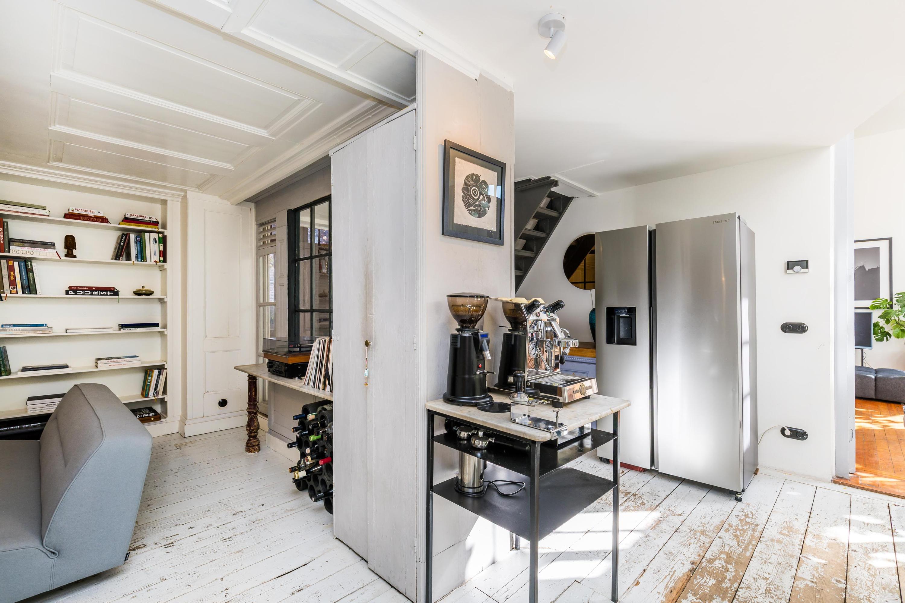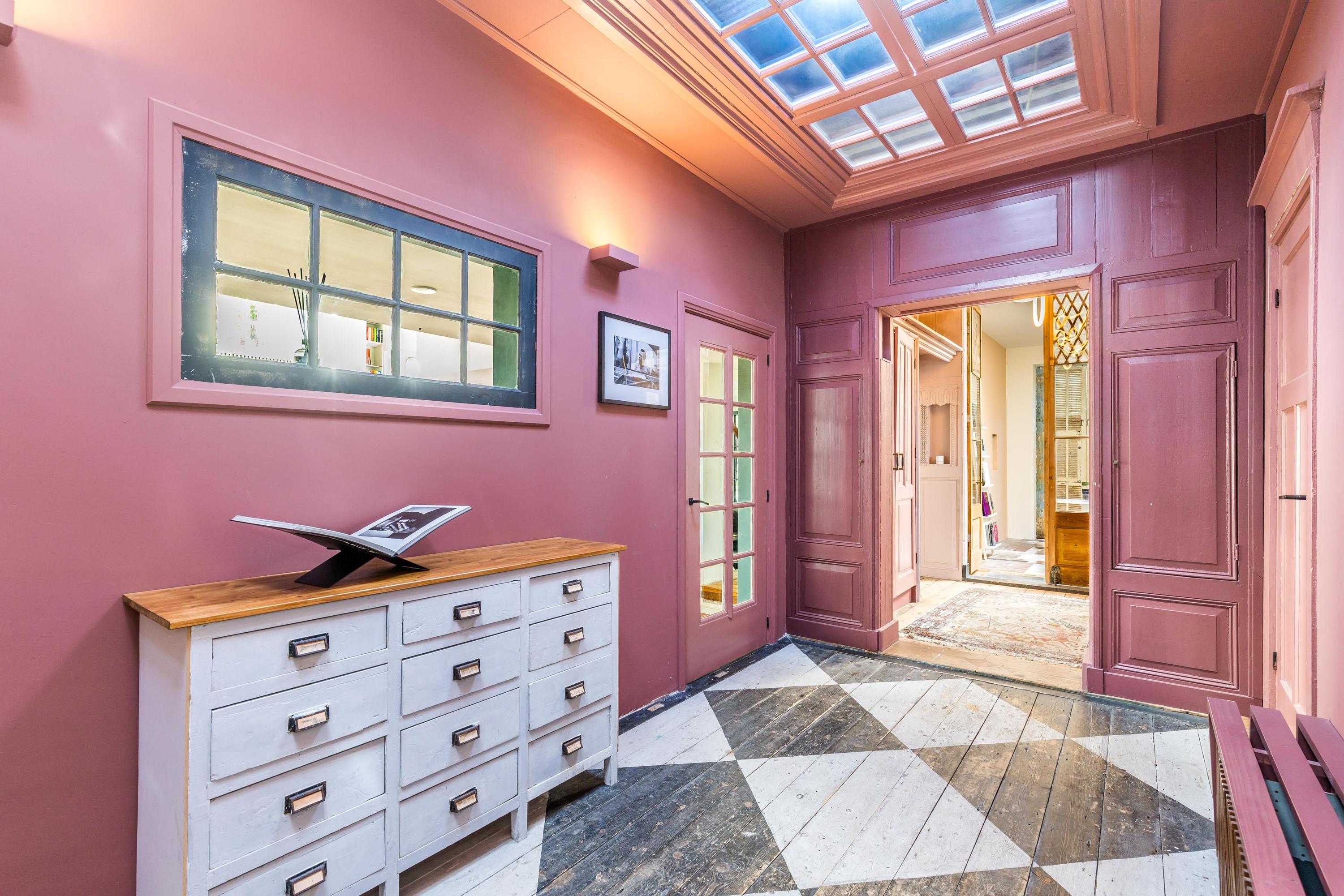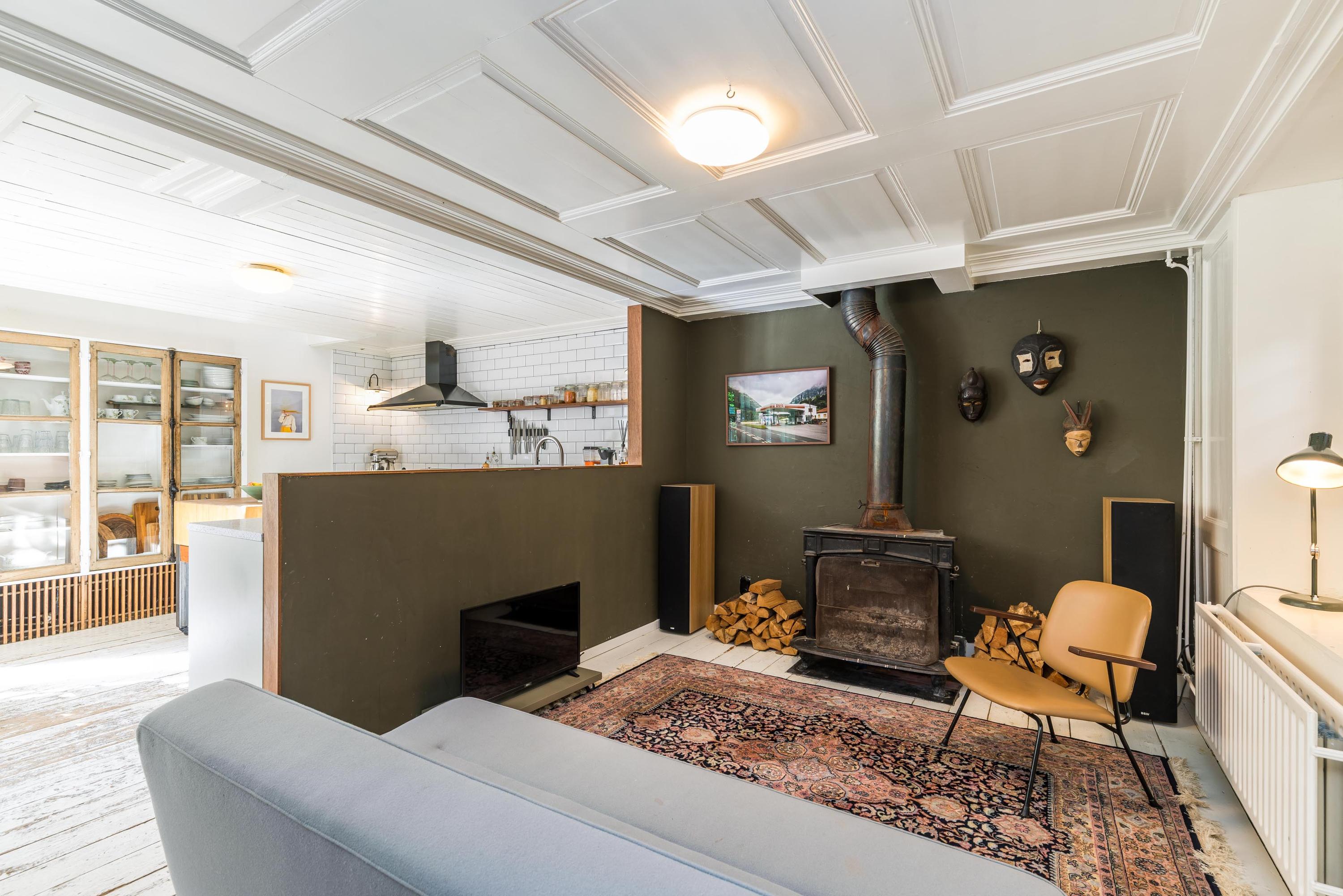 Binnen valt direct de woonkamer op: een indrukwekkende ruimte met hoogte, licht en karakteristieke details zoals hoge deuren en een opvallende wenteltrap. Aansluitend bevindt zich de leefkeuken, het hart van het huis, met een open haard, een knusse zithoek en volop ruimte om samen te koken en lang te tafelen.