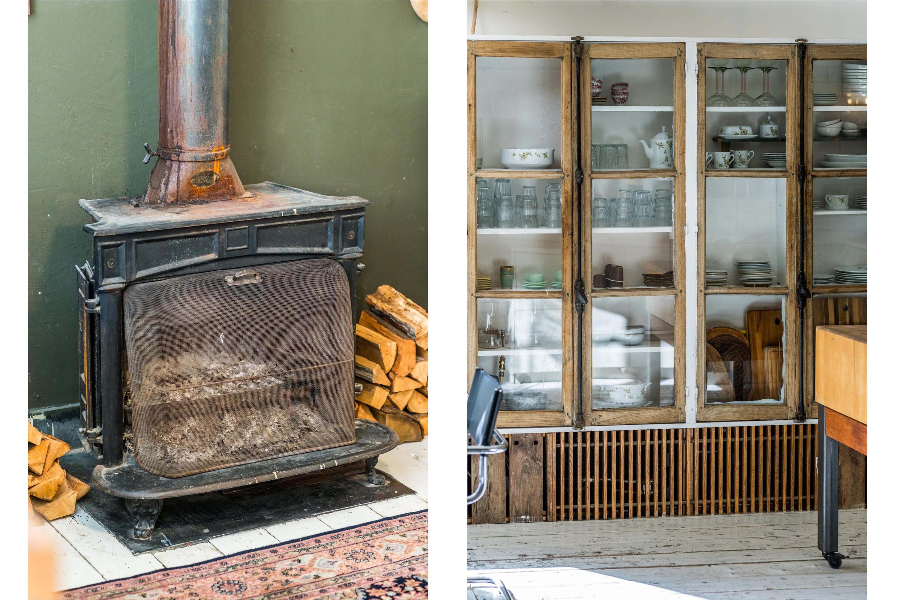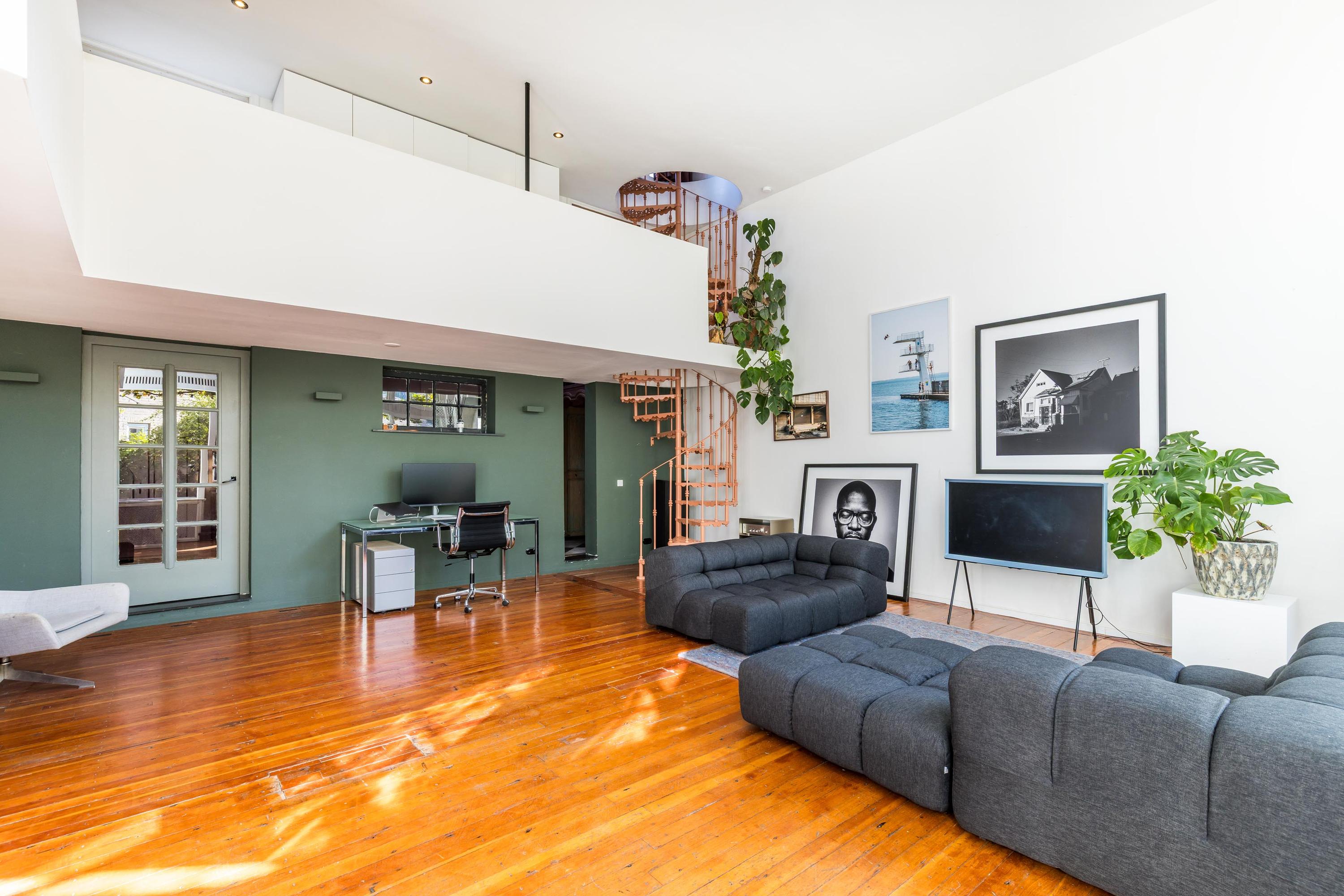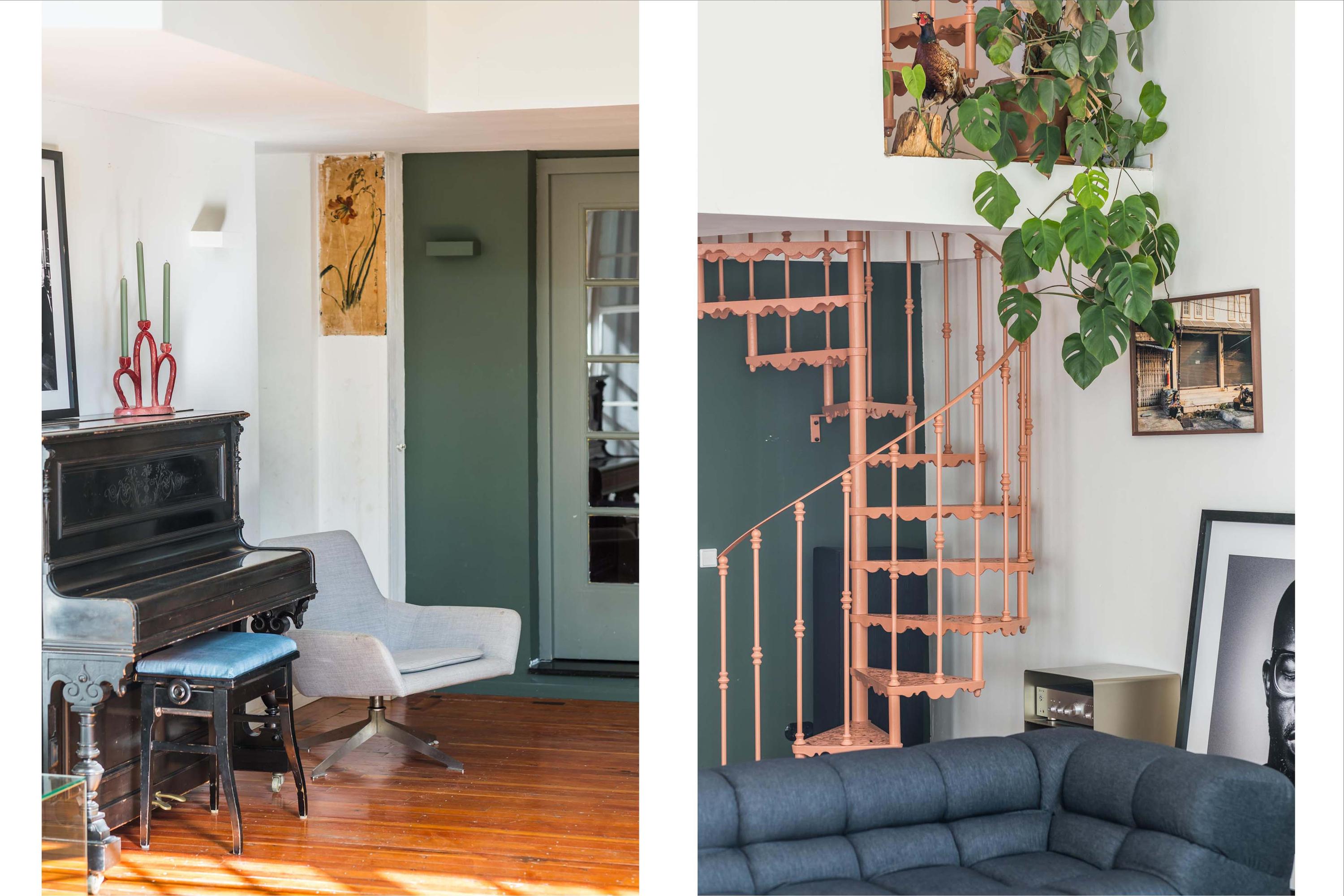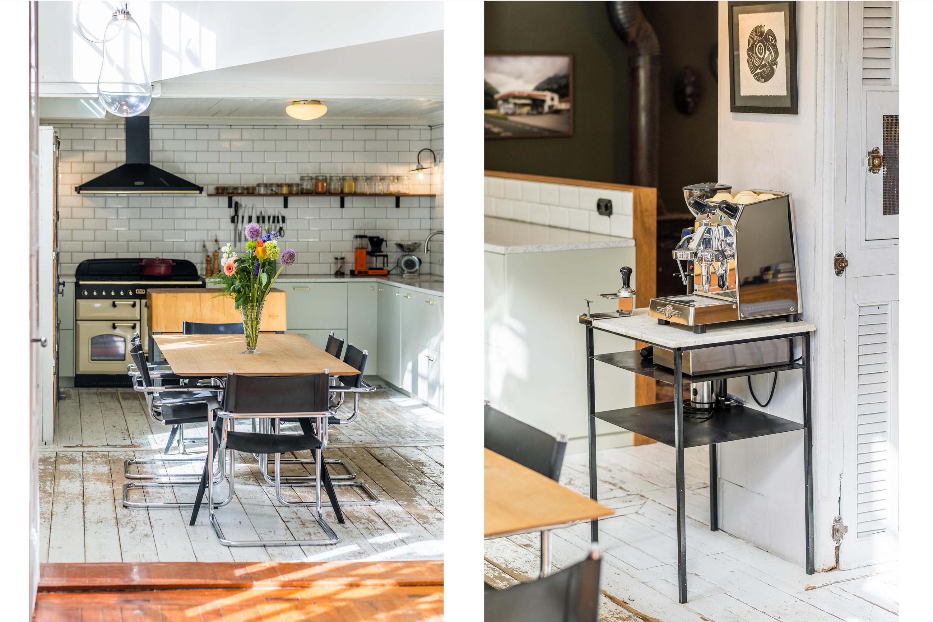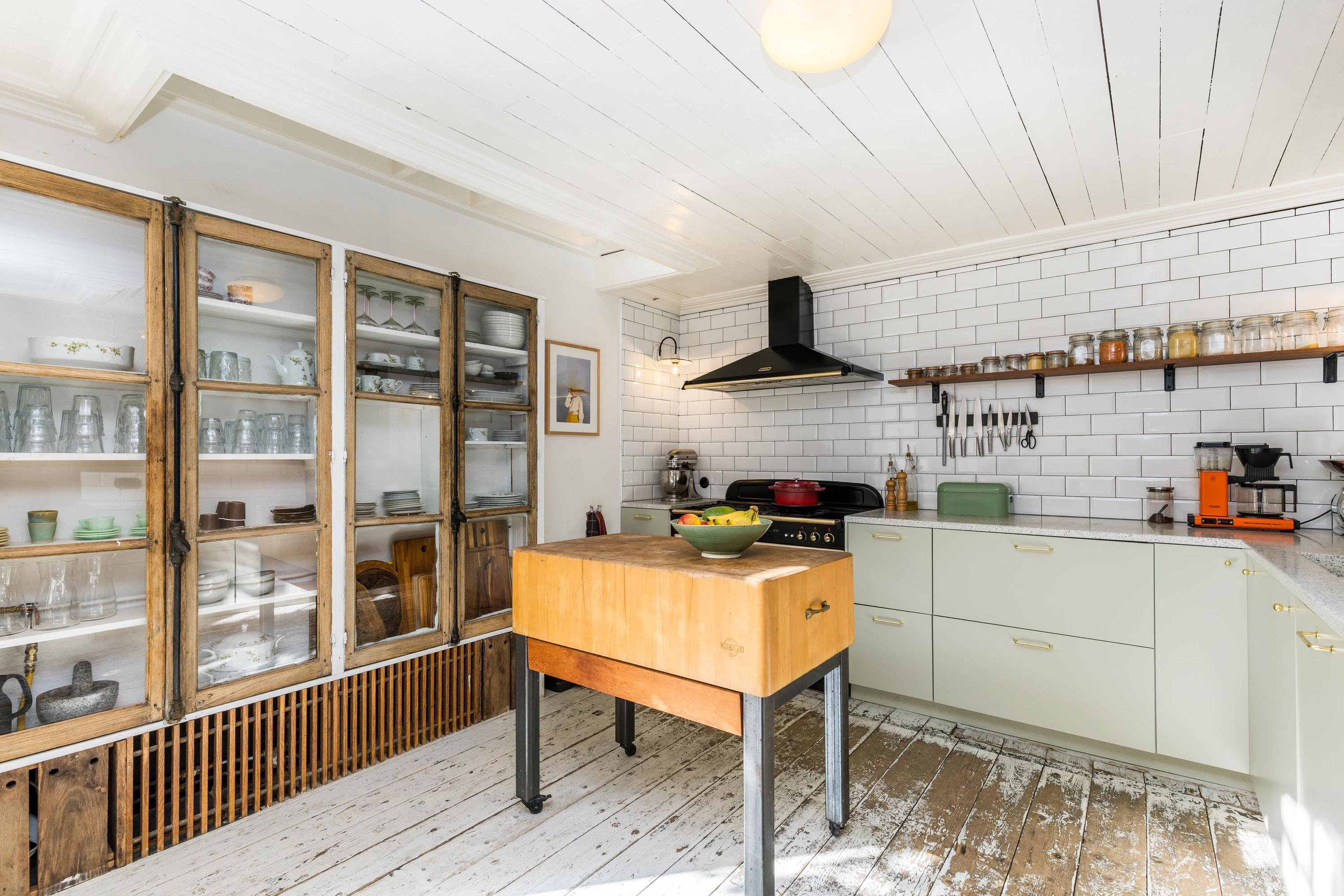 Binnen valt direct de woonkamer op: een indrukwekkende ruimte met hoogte, licht en karakteristieke details zoals hoge deuren en een opvallende wenteltrap. Aansluitend bevindt zich de leefkeuken, het hart van het huis, met een open haard, een knusse zithoek en volop ruimte om samen te koken en lang te tafelen.