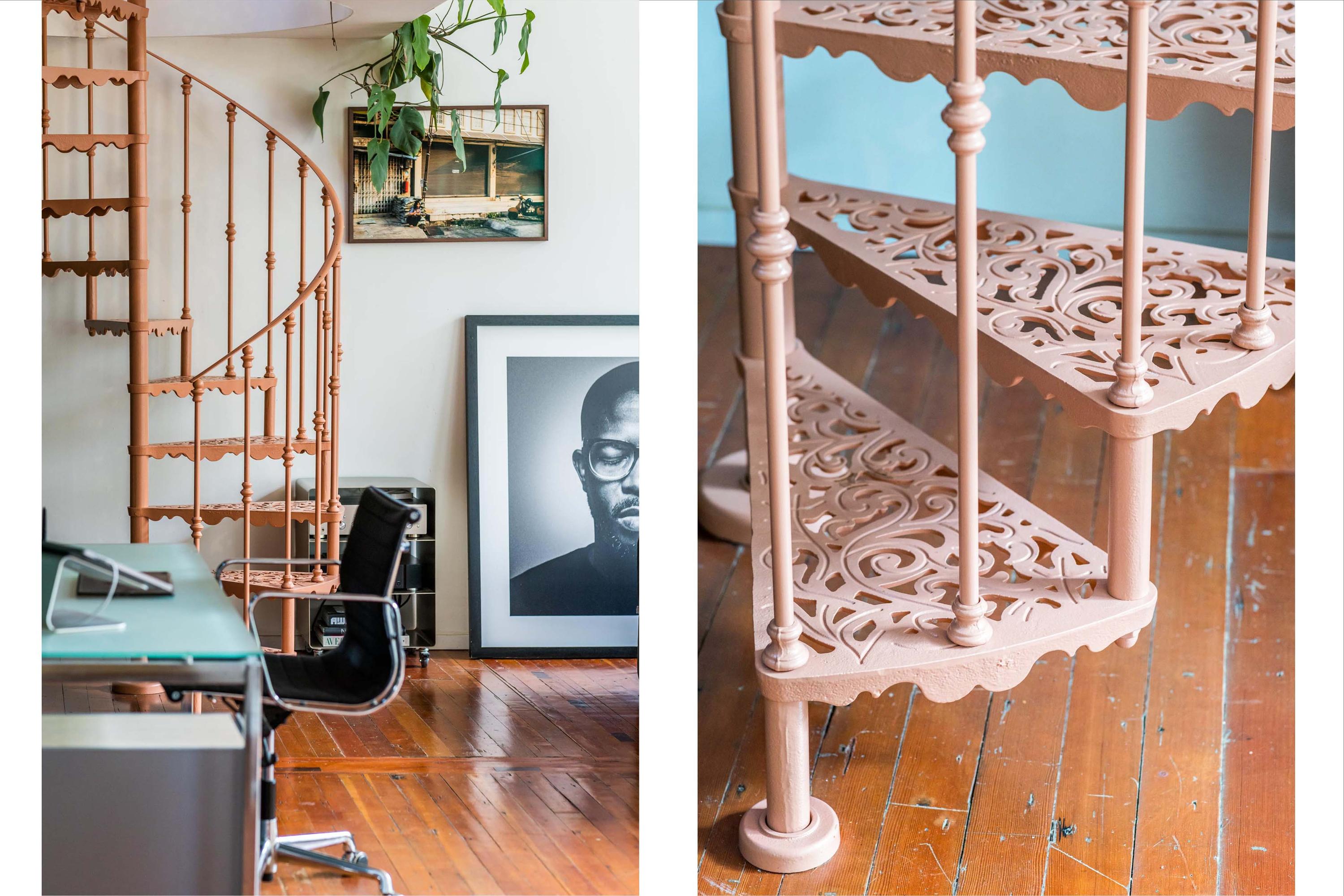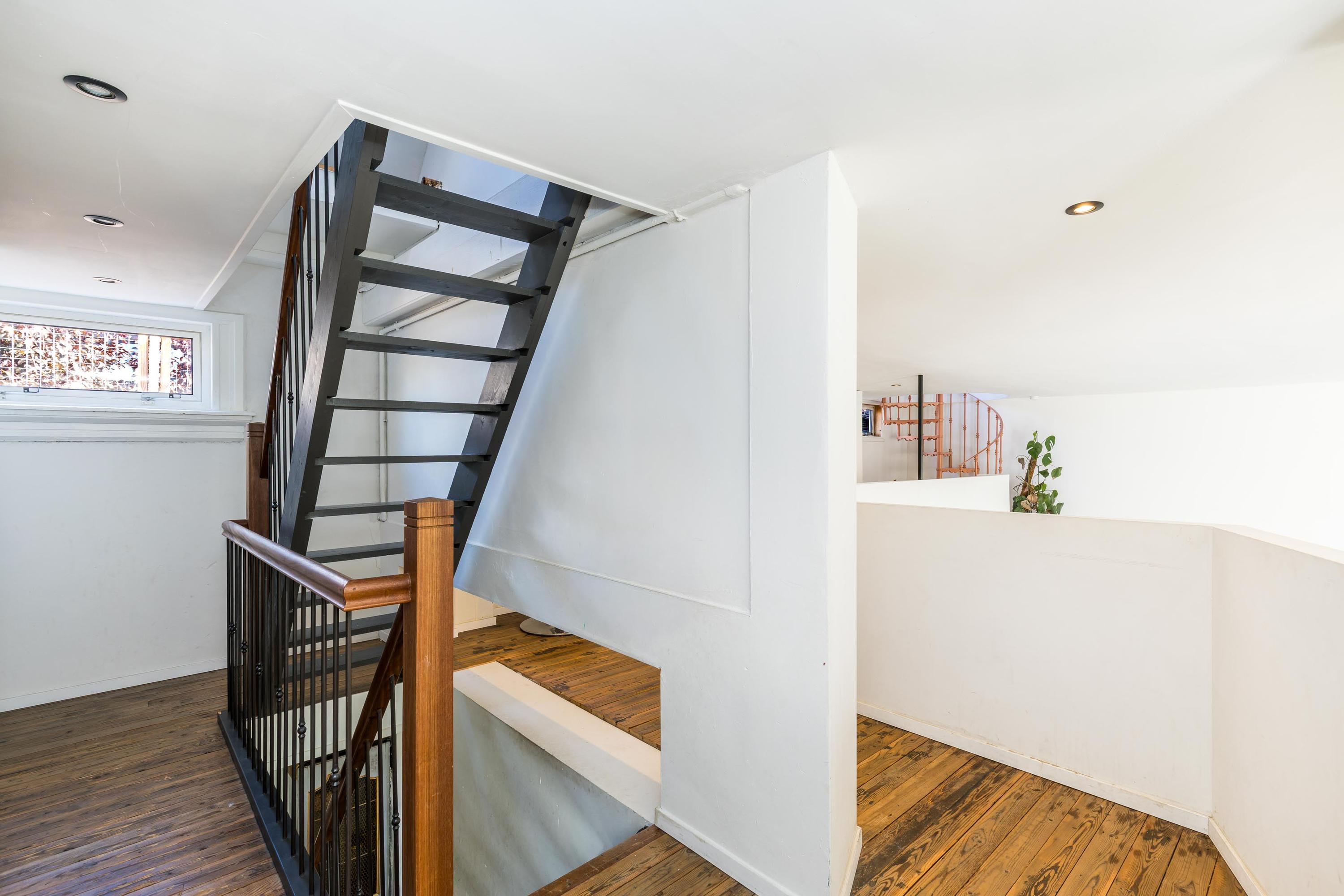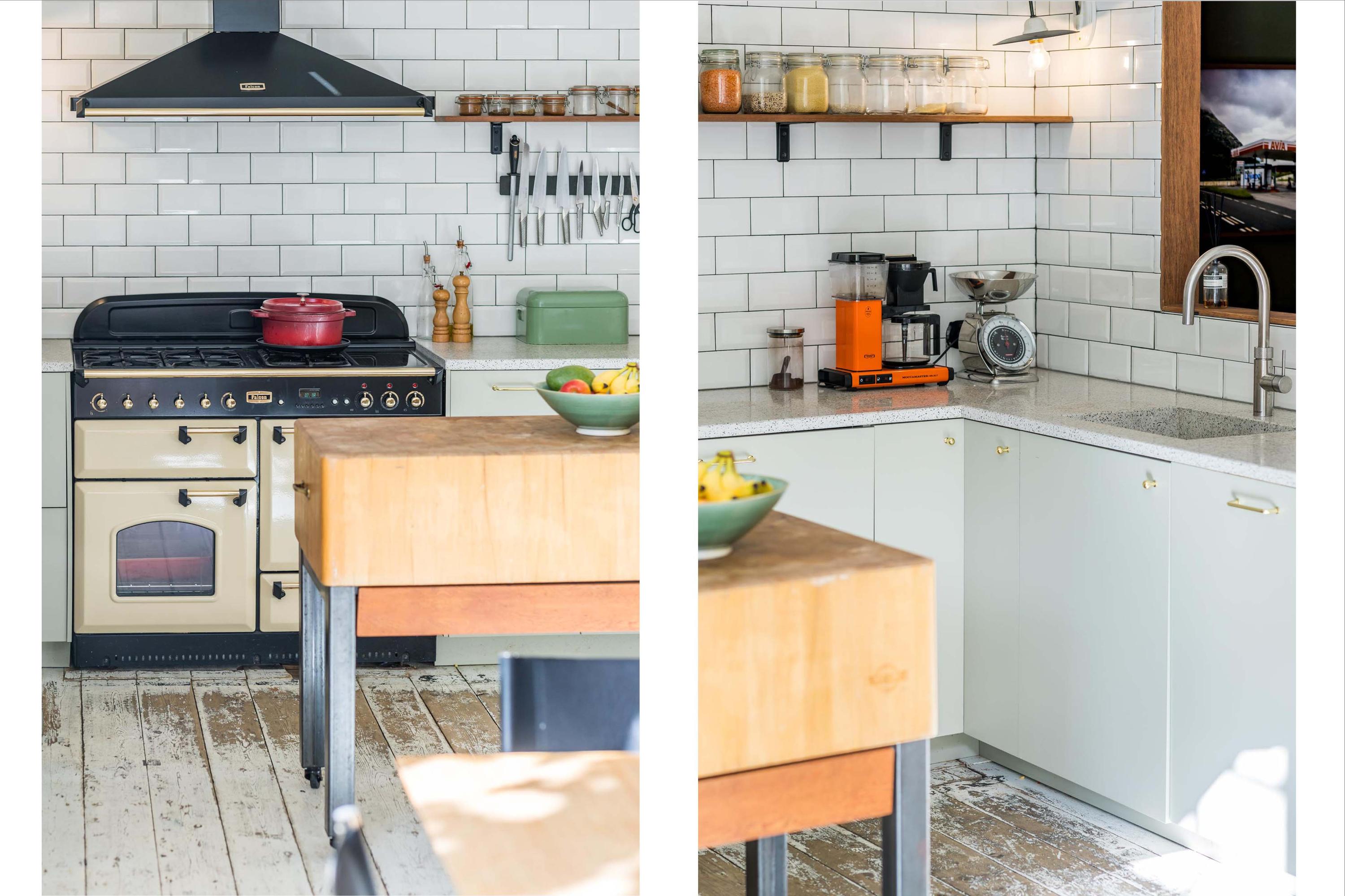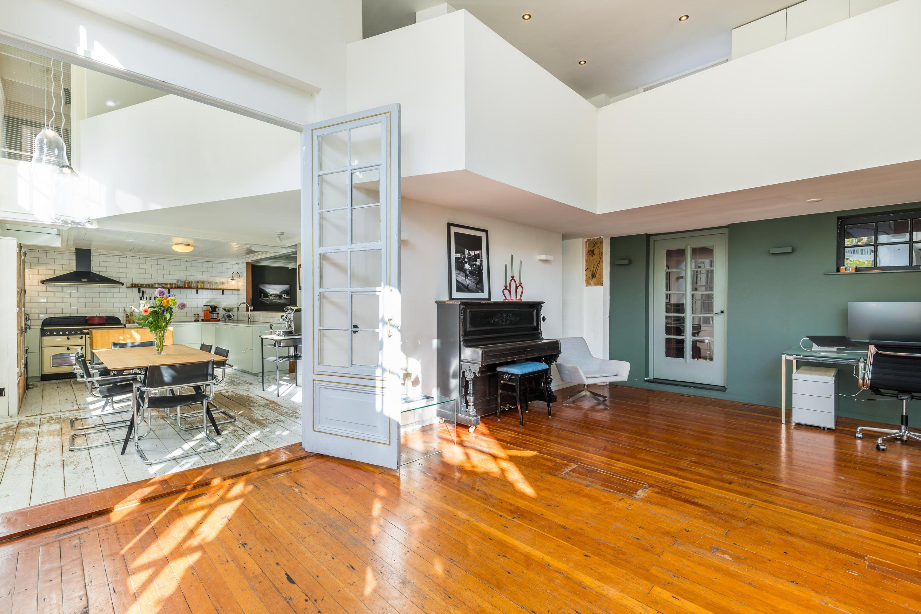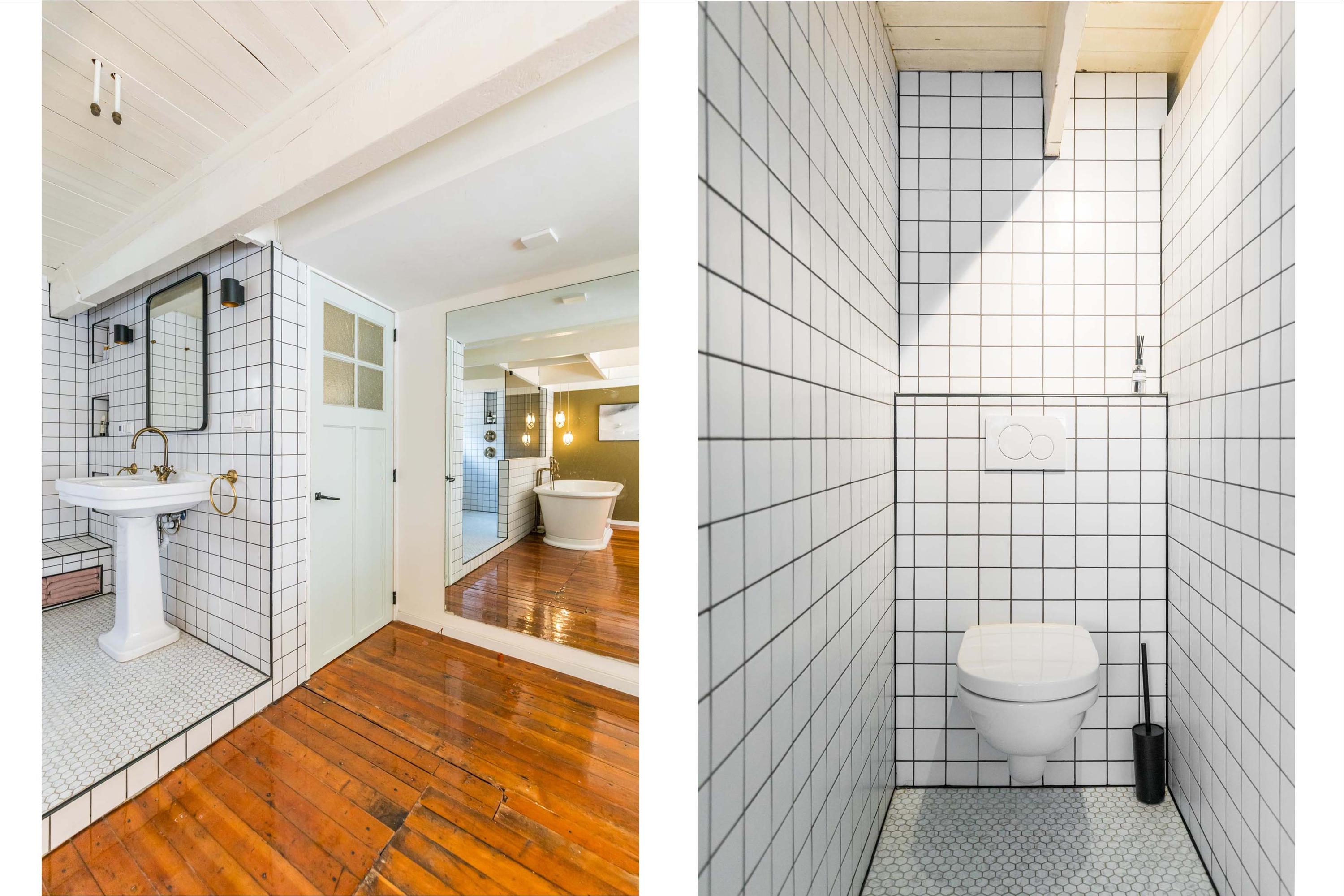 Binnen valt direct de woonkamer op: een indrukwekkende ruimte met hoogte, licht en karakteristieke details zoals hoge deuren en een opvallende wenteltrap. Aansluitend bevindt zich de leefkeuken, het hart van het huis, met een open haard, een knusse zithoek en volop ruimte om samen te koken en lang te tafelen.