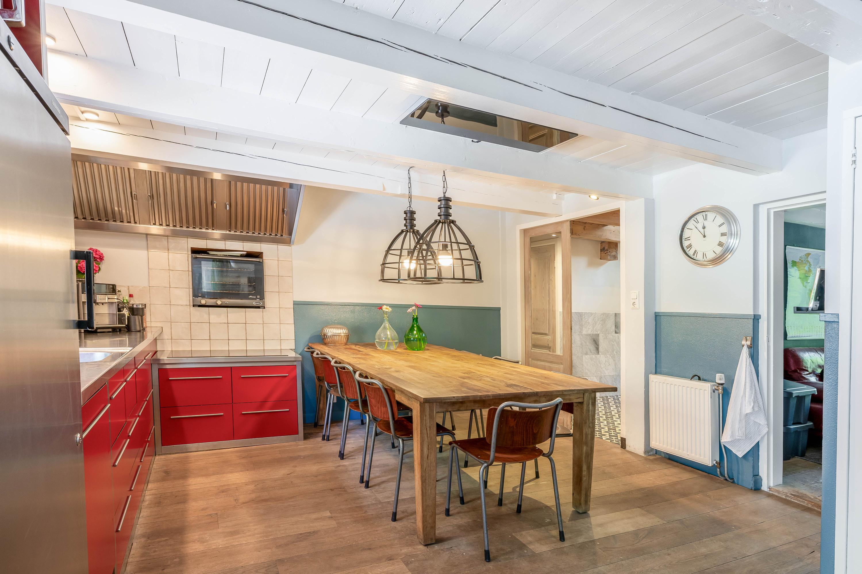 Entree aan voorzijde met indrukwekkende ontvangstruimte met antieke schouw met houtkachel, Belgisch hardstenen vloer met vloerverwarming en monumentale bedstedewand (een aparte toiletruimte, een badkamer met douche en wastafel en de trap naar verdieping, zijn hierachter verborgen), toegang naar wijnkelder en naar de daarboven gelegen opkamer, die thans dienst doet als werkkamer, sfeervolle woonkamer met houten vloerdelen, schouw en houtkachel, doorgang naar gezellige woonkeuken met horecakeuken en professionele apparatuur zoals een heteluchtoven, inductiekookplaat, afzuiginstallatie, vaatwasser, koelkast en RVS aanrechtblad, houten vloerdelen en deur naar tuin, slaapkamer met schouw en houten vloerdelen, zij-entree met garderobe, luxe toilet, bijkeuken met extra keukenblok en aansluiting wasmachine, luxe wellnesruimte met zwembad met automatisch roldek, grote jacuzzi, douche en voorbereiding voor sauna.
