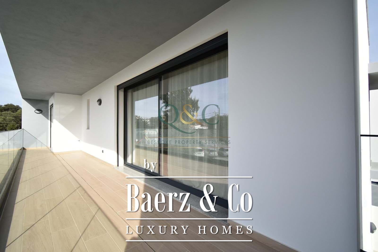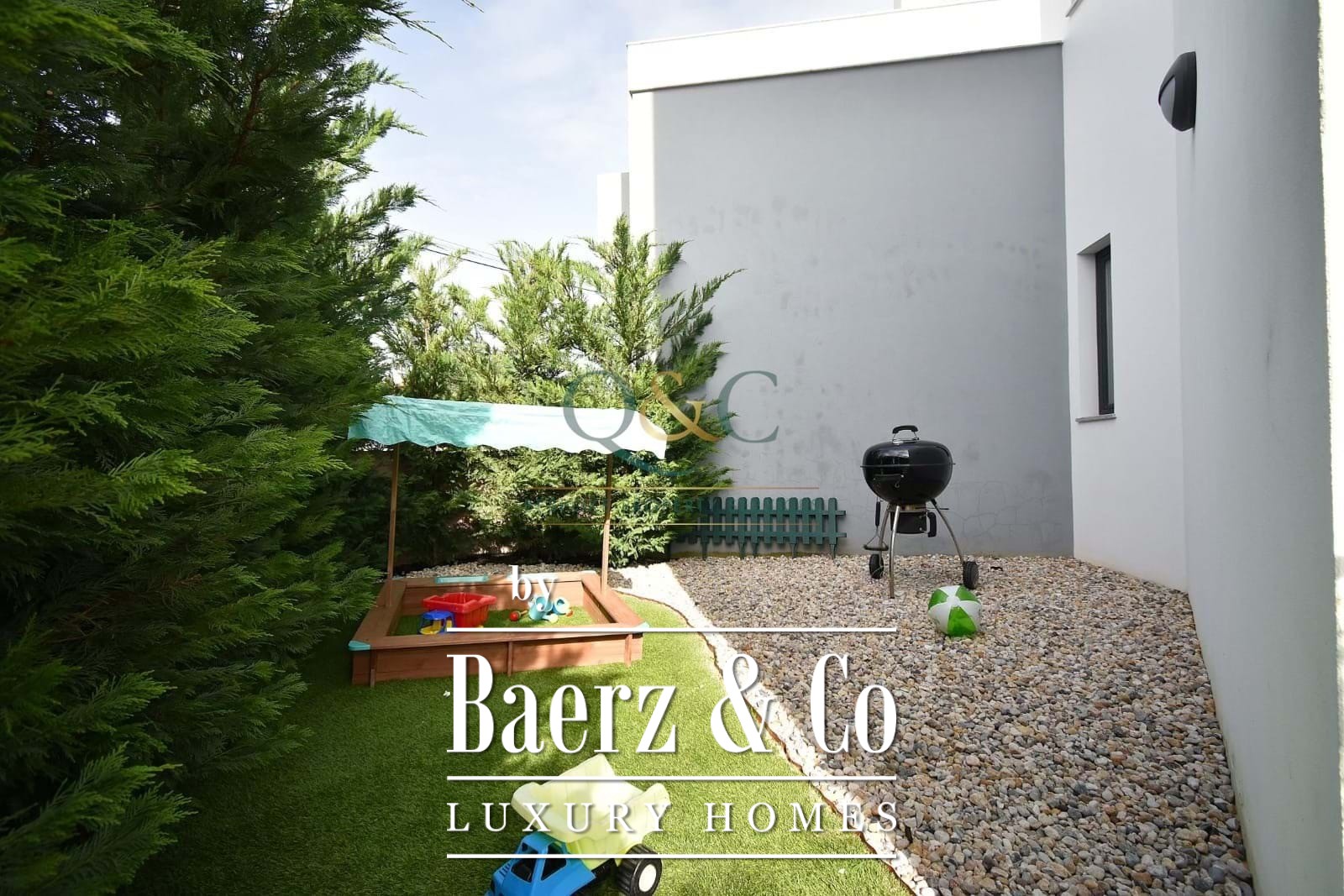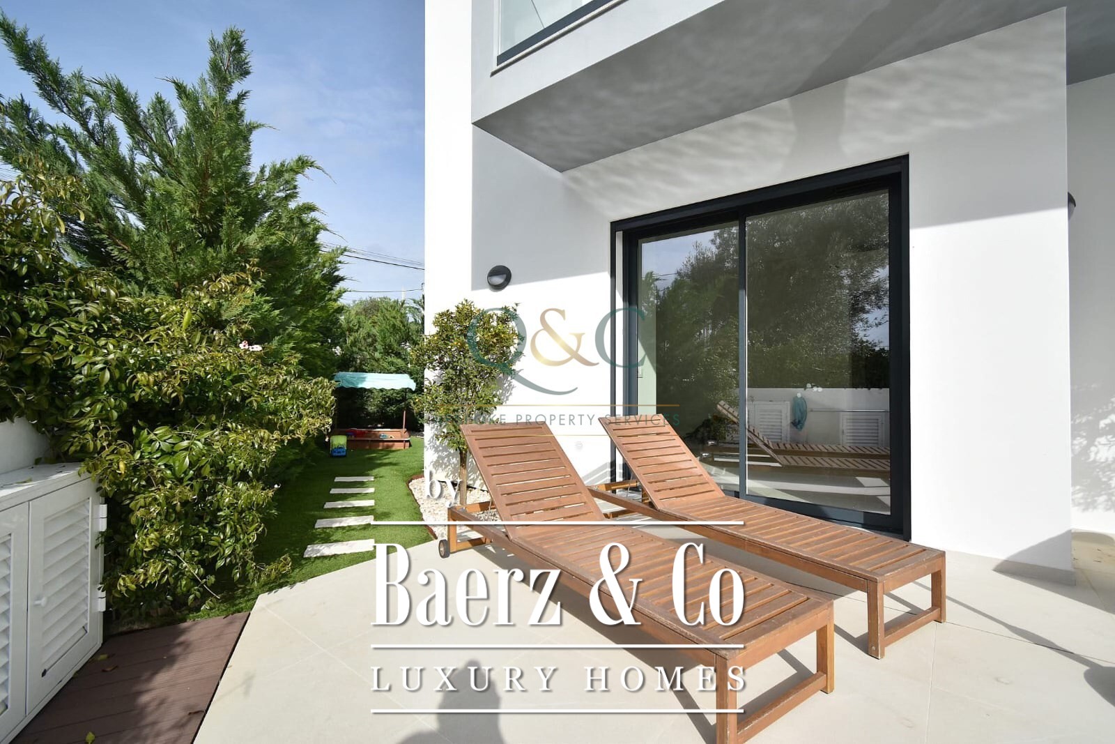 De eerste verdieping beschikt over twee slaapkamers, een complete badkamer en een master suite van 28 m² die uitkomt op een balkon van 23 m². Daikin klimaatregeling, elektrische rolluiken, een geïntegreerde geluidsinstallatie en vloerverwarming in de badkamers verhogen het comfort. Gebouwd in 2023 in een cluster van vier woningen, deelt dit huis slechts een achterzijde, waardoor uitzonderlijke privacy wordt gewaarborgd, vooral op het zuidperceel. Tags duiden op een gunstige ligging ten opzichte van luchthaven en strand.