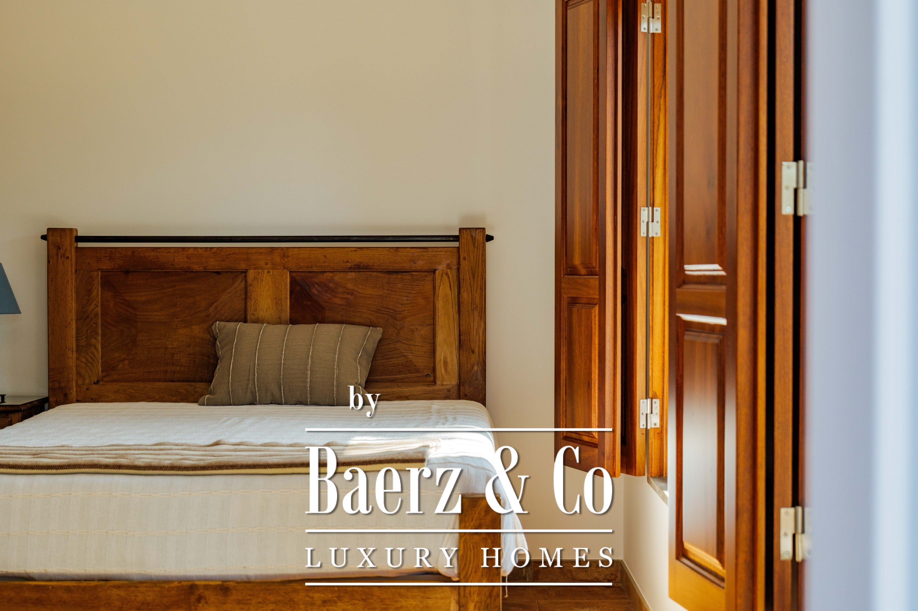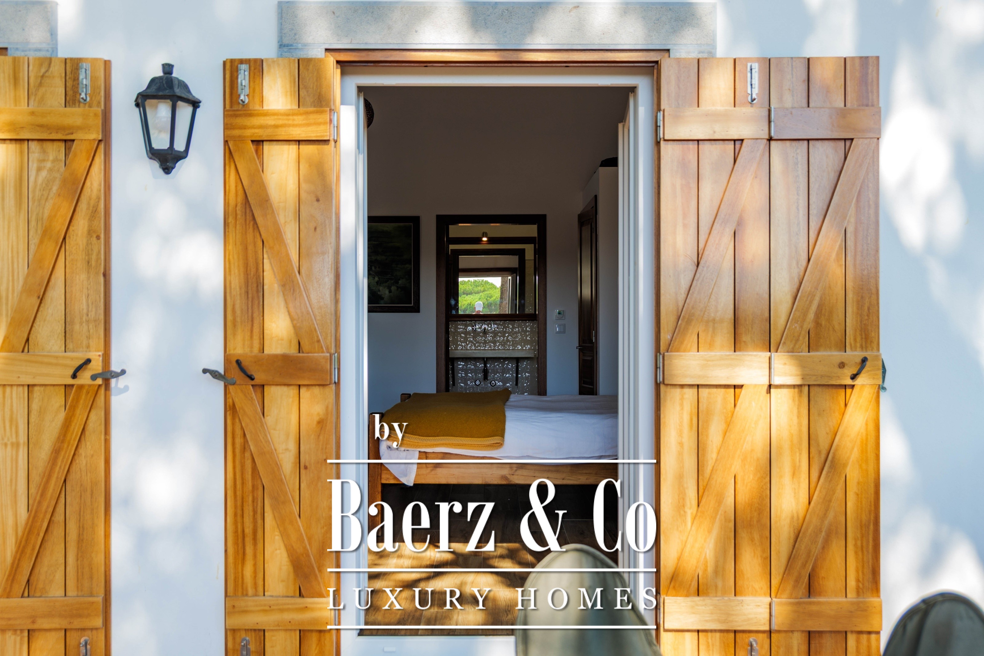 De buitenruimte beschikt over een serene zwembad, harmonieus opgenomen in het natuurlijke landschap, en stille hoekjes met uitzicht op zee. Het tweede huis, momenteel in gebruik als poolhouse, biedt een open leefruimte met een antieke schouw, flexibel in te richten voor gasten of als creatieve werkplek. In totaal zijn er vijf slaapkamers en vijf badkamers, elk zorgvuldig gepositioneerd in beide woningen.