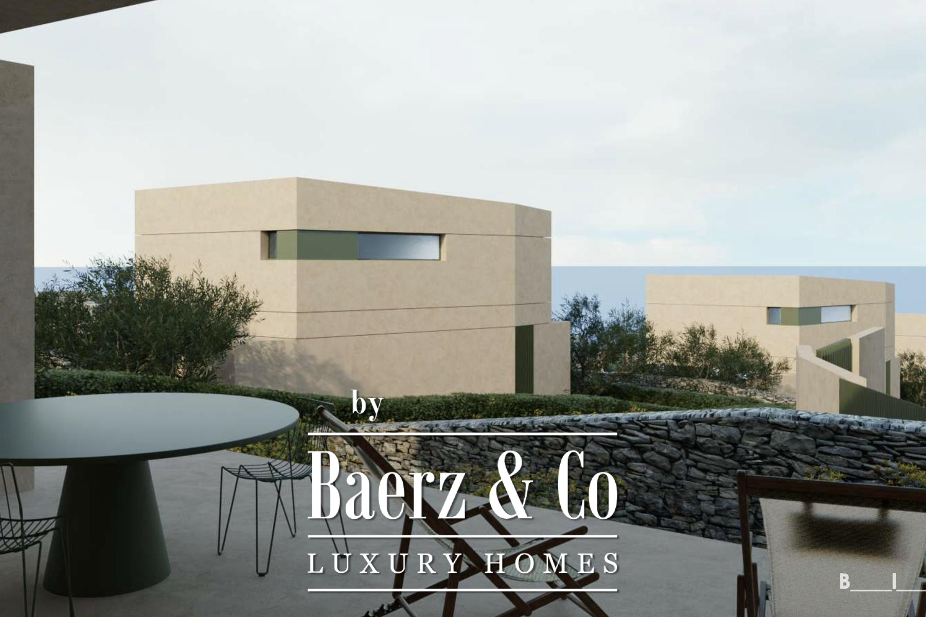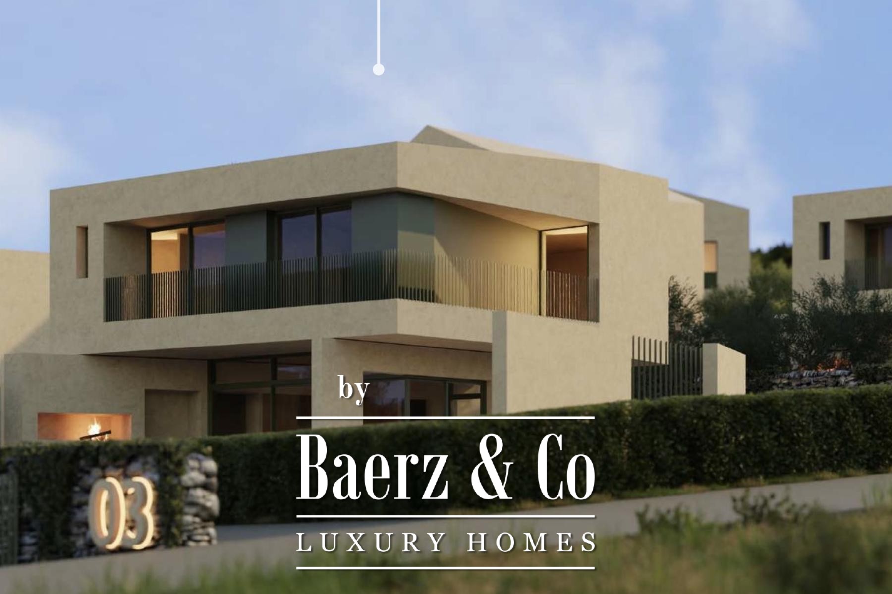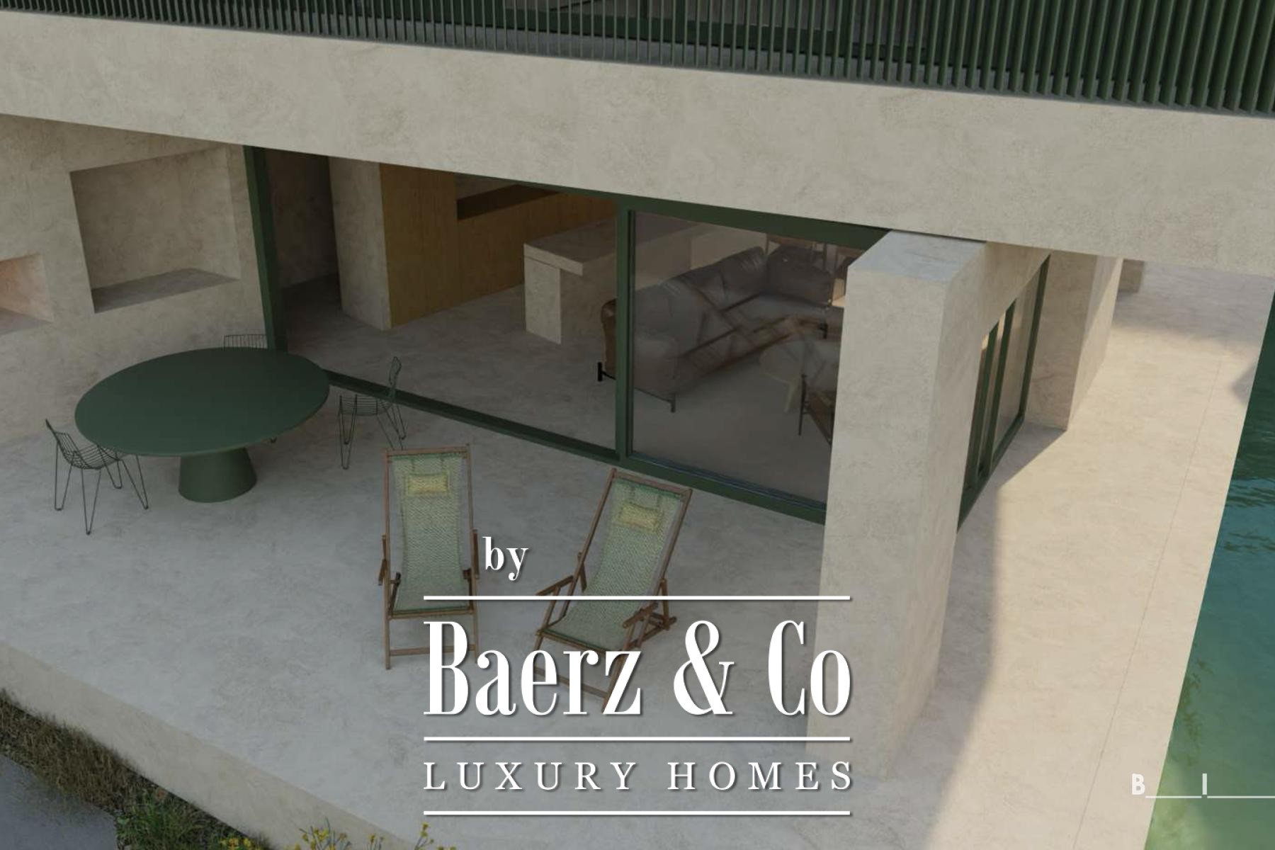 Op de bovenverdieping beschikken drie slaapkamers elk over een eigen badkamer en toegang tot een loggia, georiënteerd op het open zeezicht. De buitenruimte is ingericht met een mediterrane tuin, een buitenbarbecue, royale terrassen, balkons en meerdere buitenparkeerplaatsen die discreet aan de westzijde van het perceel van 286 m² zijn geplaatst.
