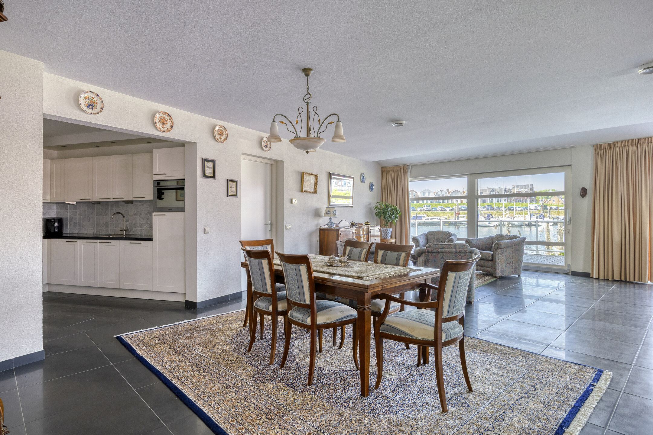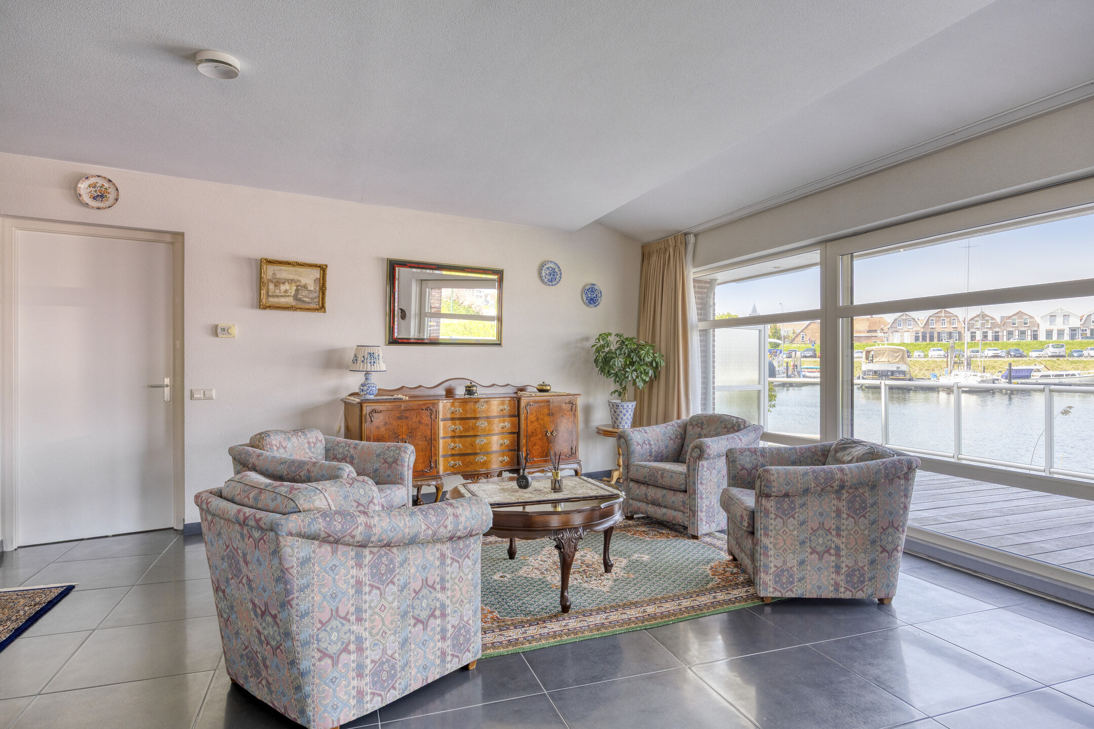woonkamer met zicht op de haven voorzien van een schuifpui naar het royale terras van 70 m², wandafwerking sierpleister, tegelvloer, plafond afgewerkt met spuitwerk;