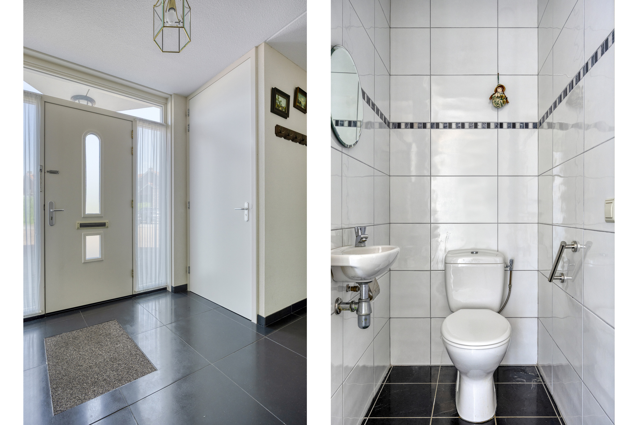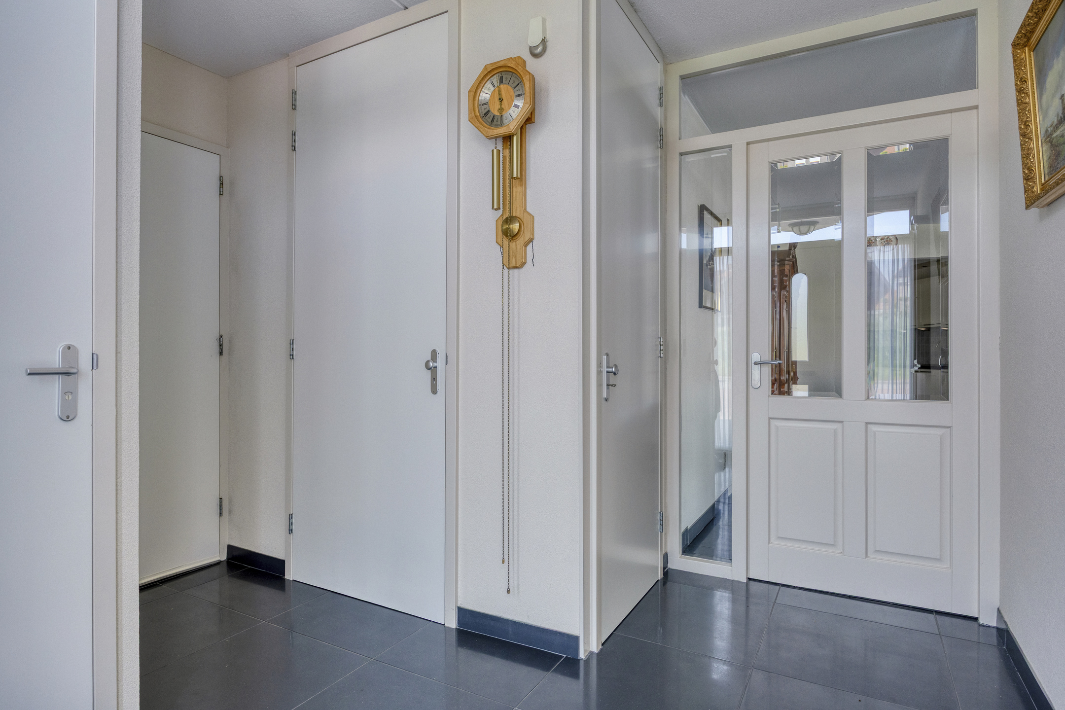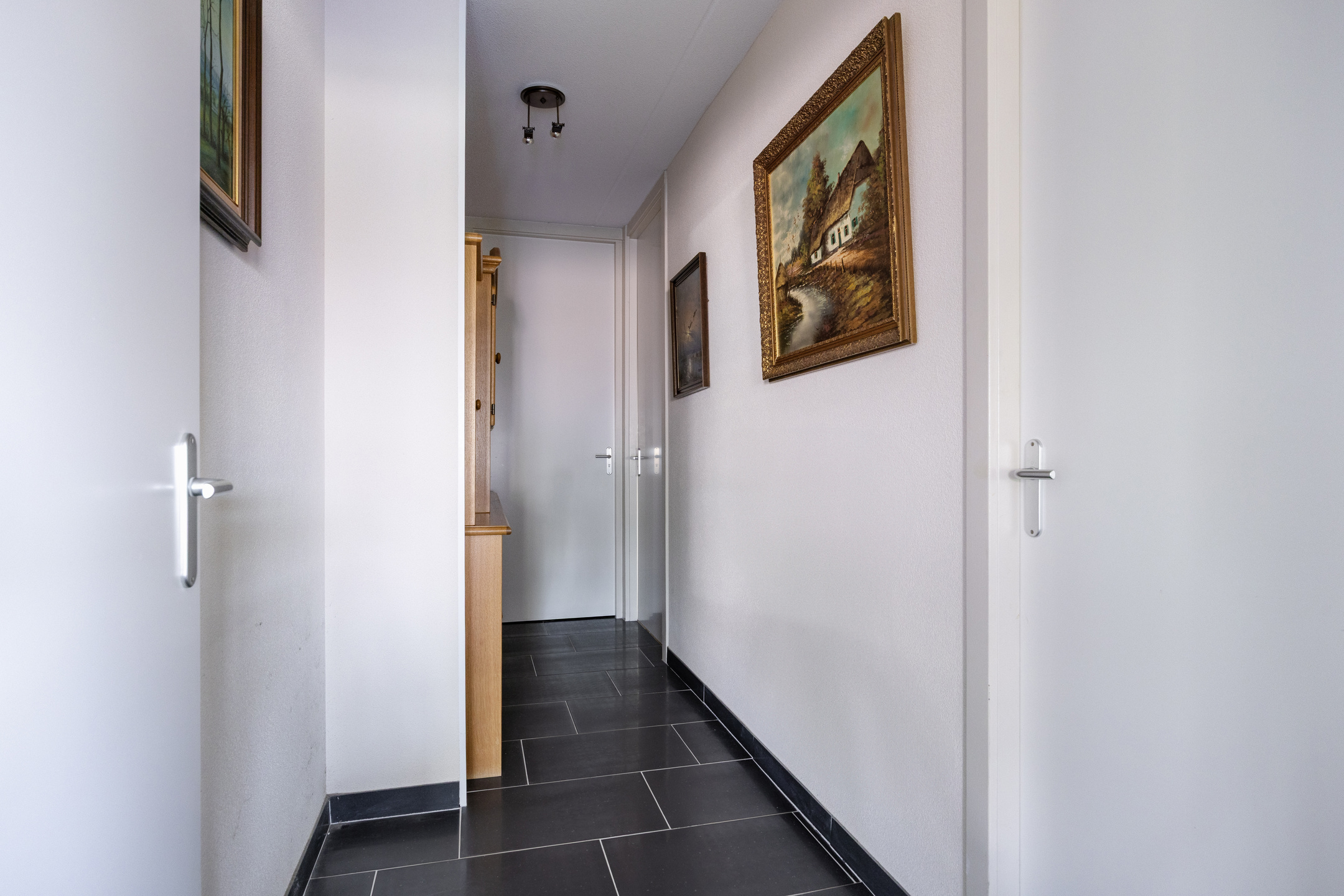 vanuit de tussenhal: voorzien van een tegelvloer, wanden afgewerkt met sierpleister en plafond met spuitwerk, toegang tot: