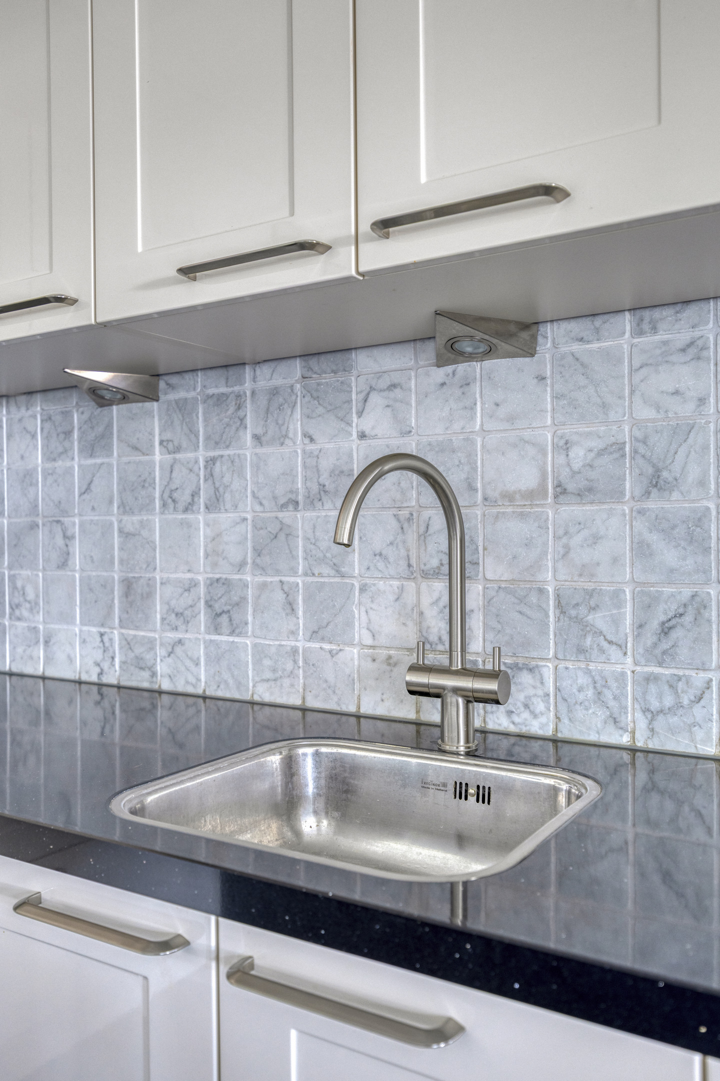 half open keuken waarin geplaatst een in hoek opgestelde inbouwkeuken (2013), voorzien van een granieten aanrechtblad met een spoelbak, inbouw inductie kookplaat, -koeler, -combi oven/magnetron, -vaatwasser en een afzuigkap, wandafwerking sierpleister, tegelvloer, plafond afgewerkt met spuitwerk;