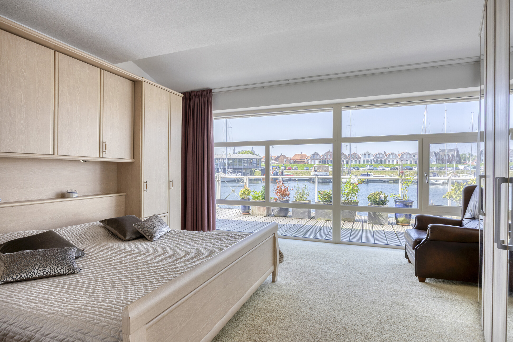slaapkamer rechts voor (master) met uitzicht op het water, wandafwerking sierpleister, vloer afgewerkt met tapijt, plafond afgewerkt met spuitwerk;