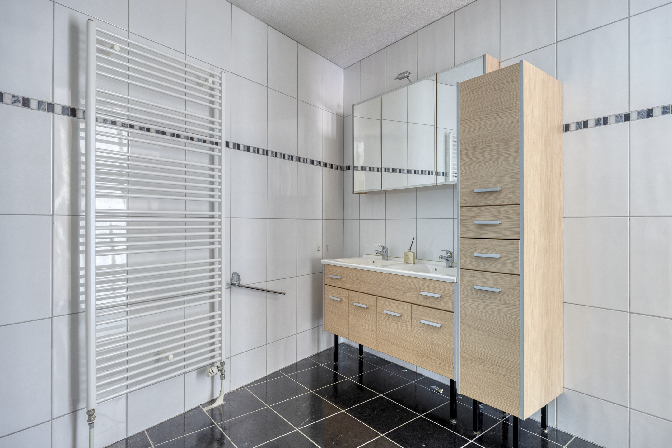betegelde badkamer, voorzien van een ligbad, douchecabine met jets en massagepaneel voorzien van een lage instap, toilet, badkamermeubel met een dubbele wastafel en een designradiator;