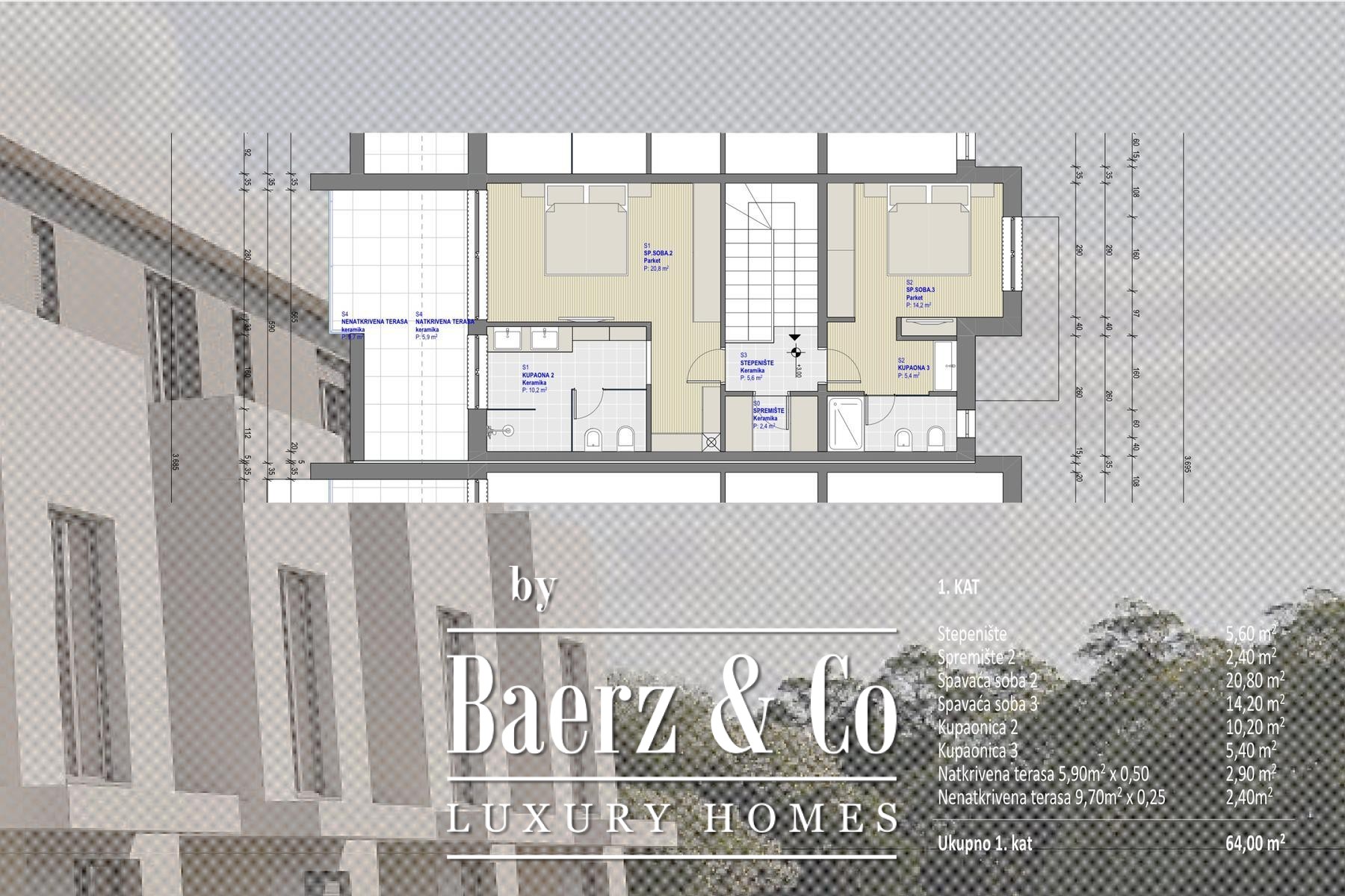 De moderne geschakelde woning Umag biedt een zeldzame kans op verfijnd mediterraan wonen, op slechts 300 meter van de Adriatische Zee. Gelegen in het idyllische Zambratija is deze eigentijdse residence ontworpen voor iedereen die waarde hecht aan architectuur, lichtinval en de verbondenheid tussen binnen- en buitenleven. De indeling met vier slaapkamers en vier badkamers strekt zich uit over een doordacht P+2-concept, goed voor 181 m² woonoppervlakte op een royaal perceel van 1.683 m².