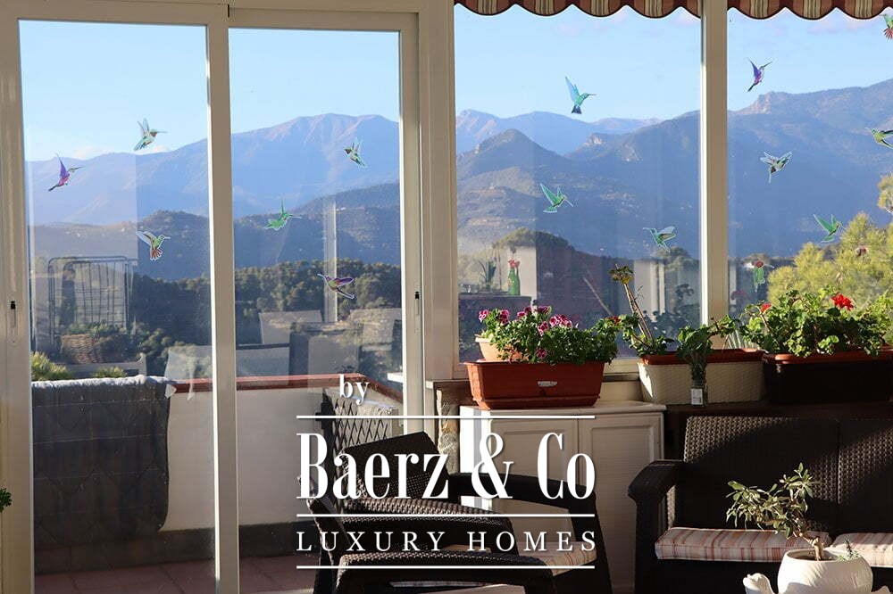 Bij binnenkomst presenteert de bovenste verdieping een royale woonkamer die uitkomt op een overdekt terras, met ongehinderd uitzicht over de Middellandse Zee en de vallei. Op dit niveau bevinden zich twee slaapkamers, elk met en-suite badkamer, terwijl de hoofdsuite beschikt over een privé inloopkast. Op de benedenverdieping biedt een ruime garage plaats aan meerdere voertuigen, en een ruim atelier of kantoor is naadloos geïntegreerd in het geheel van de woning.