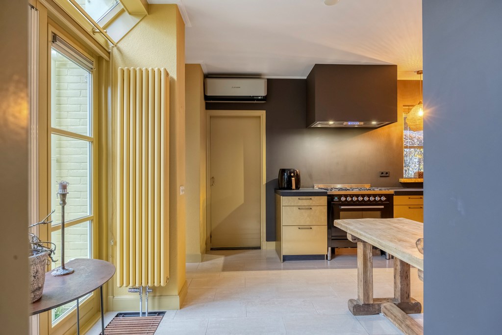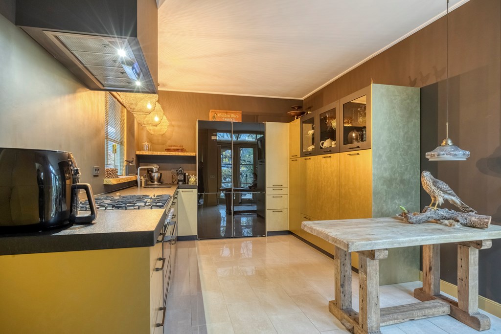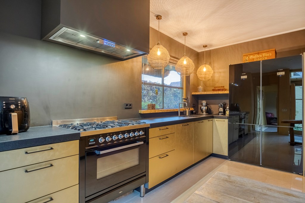 De woonkeuken is modern uitgevoerd met luxe apparatuur zoals een groot gasfornuis, een schouwafzuigkap, vaatwasser, koel- en vrieskast, airconditioning en een Quookerkraan. Hier kookt u met zicht op de tuin, terwijl het natuurlijke licht mooi over de gouden fronten van de keuken strijkt. Ook via de keuken zijn de serre en achtertuin toegankelijk gemaakt. Aangrenzend bereikt u enerzijds de praktische bijkeuken met witgoedaansluitingen en anderzijds een riante slaapkamer, met een evenzo riante walk-in closet en een badkamer en suite. Een schuifpui verbindt de slaapkamer met de tuin, en ook via de walk-in closet kunt u de tuin eenvoudig bereiken. De ruime badkamer is voorzien van licht tegelwerk en een lichtkoepel, een whirlpool, dubbele wastafel, een inloopdouche, wandcloset en volop opbergruimte.