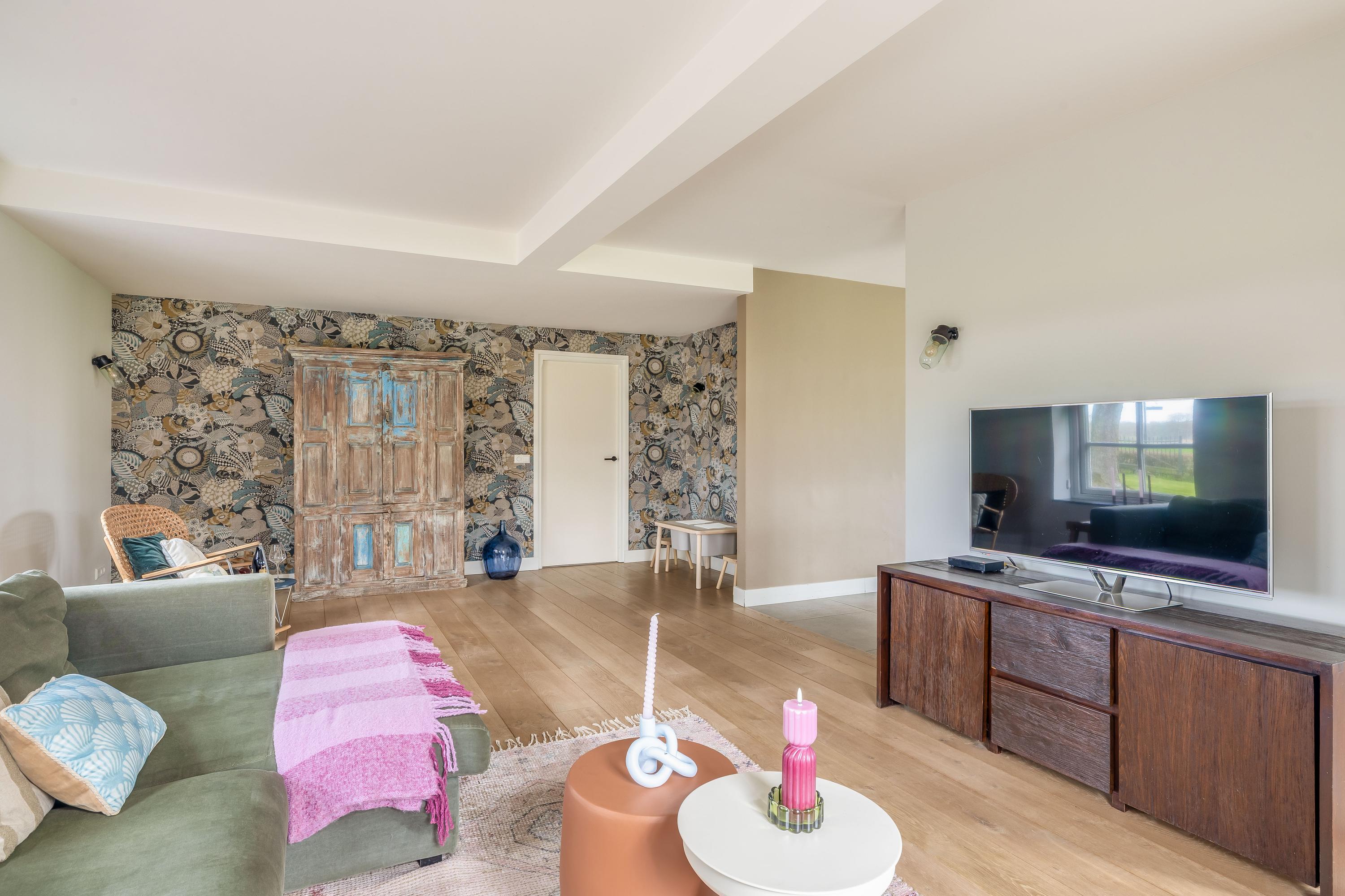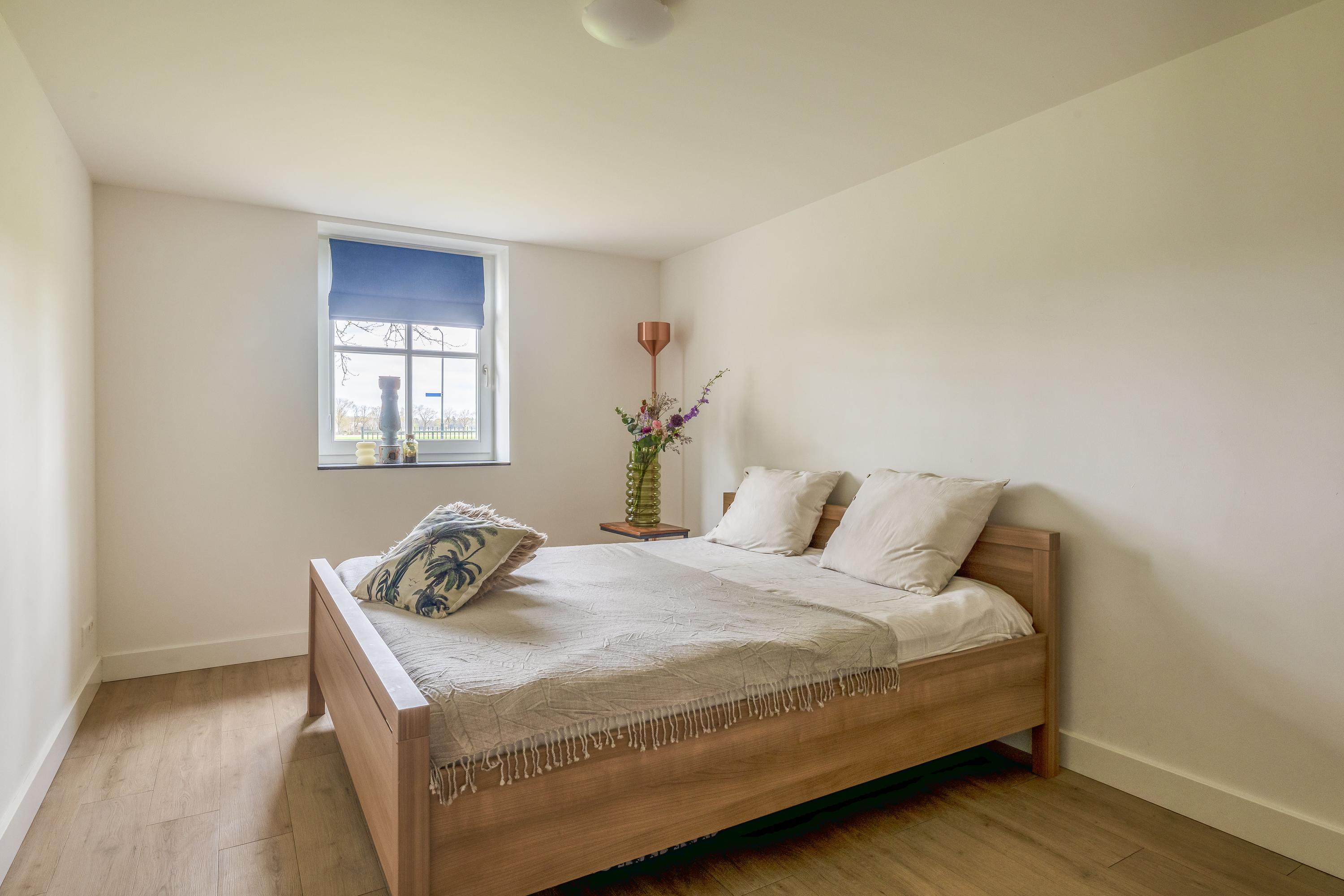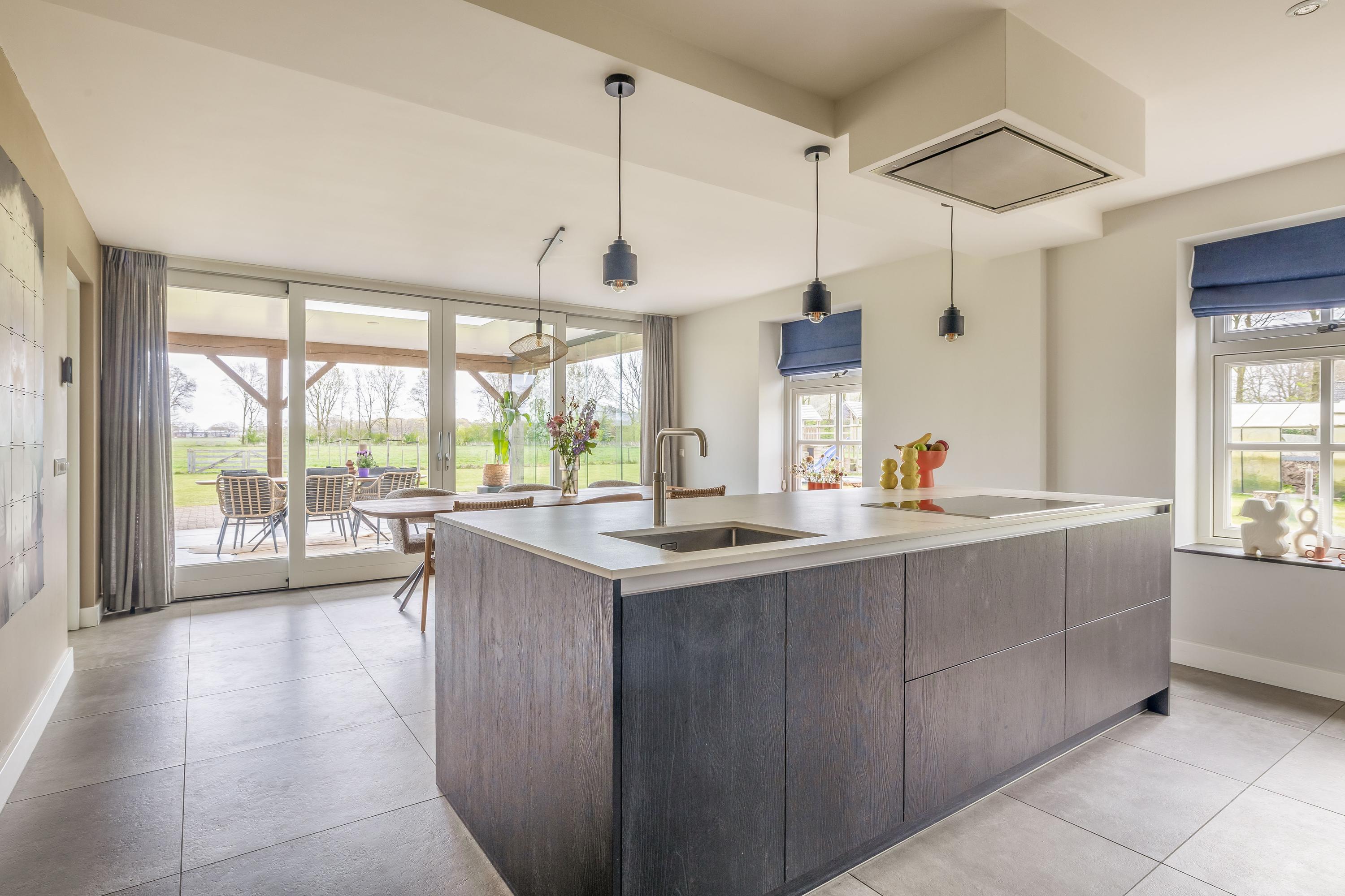 De hal is afgewerkt met een tegelvloer en biedt toegang tot de woonkamer, de slaapkamer en de centrale corridor. In de hal is tevens de vernieuwde meterkast gesitueerd. De slaapkamer is afgewerkt met PVC vloer en geniet volop lichtinval. Er zijn mogelijkheden tot het eenvoudig realiseren van een badkamer-en-suite. De sfeervolle woonkamer met warme houten parketvloer en stucwerk wanden is een heerlijke ruimte met veel lichtinval. De woonkamer staat in directe verbinding met de leefkeuken. De leefkeuken is ingericht met een kookeiland en een wandopstelling en beschikt over alle benodigde apparatuur, waaronder een Quooker, vaatwasser, inductiekookplaat, oven en koelkast. De moderne tegelvloer met vloerverwarming en de schuifpui die toegang biedt tot het overdekte terras, maken deze keuken tot een prettige en praktische leefruimte met uitzicht op het omliggende landschap. Via de corridor zijn de bijkeuken, toiletruimte en berging bereikbaar. De bijkeuken is praktisch ingericht met wasapparatuur op hoogte, bergruimte en extra voorzieningen zoals een koelkast en combi-oven. De toiletruimte is voorzien van een zwevend toilet en fonteintje. De berging beschikt over aansluitingen voor het realiseren van een badkamer, waarmee een levensloopbestendige invulling eenvoudig mogelijk is.