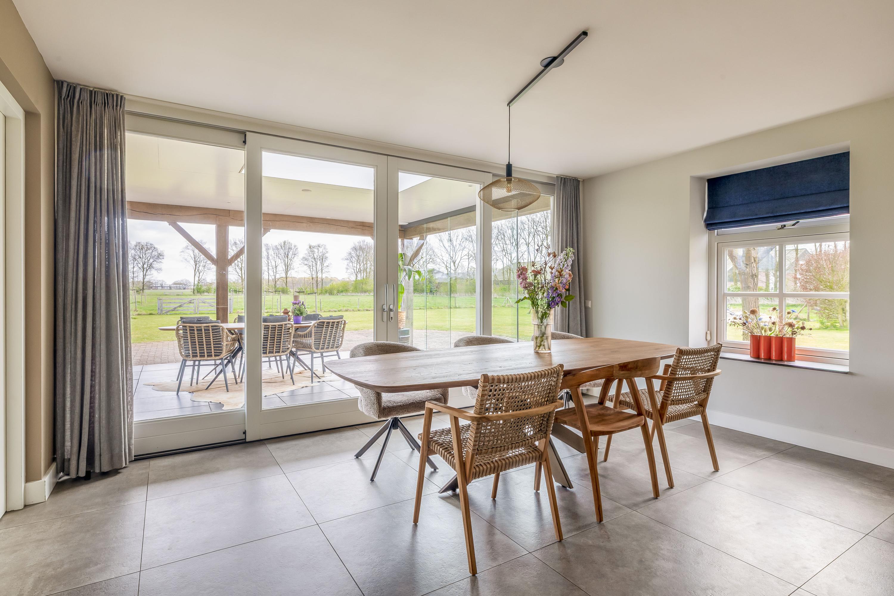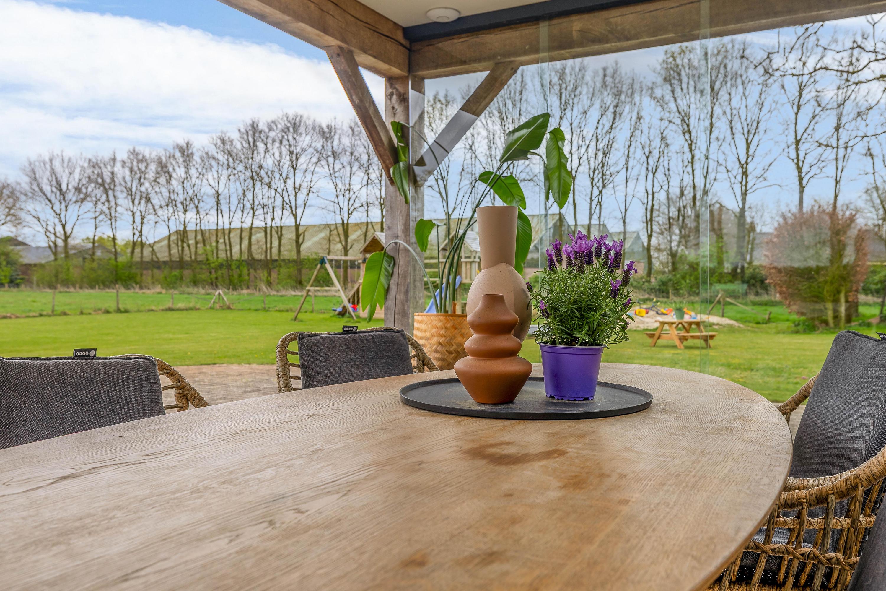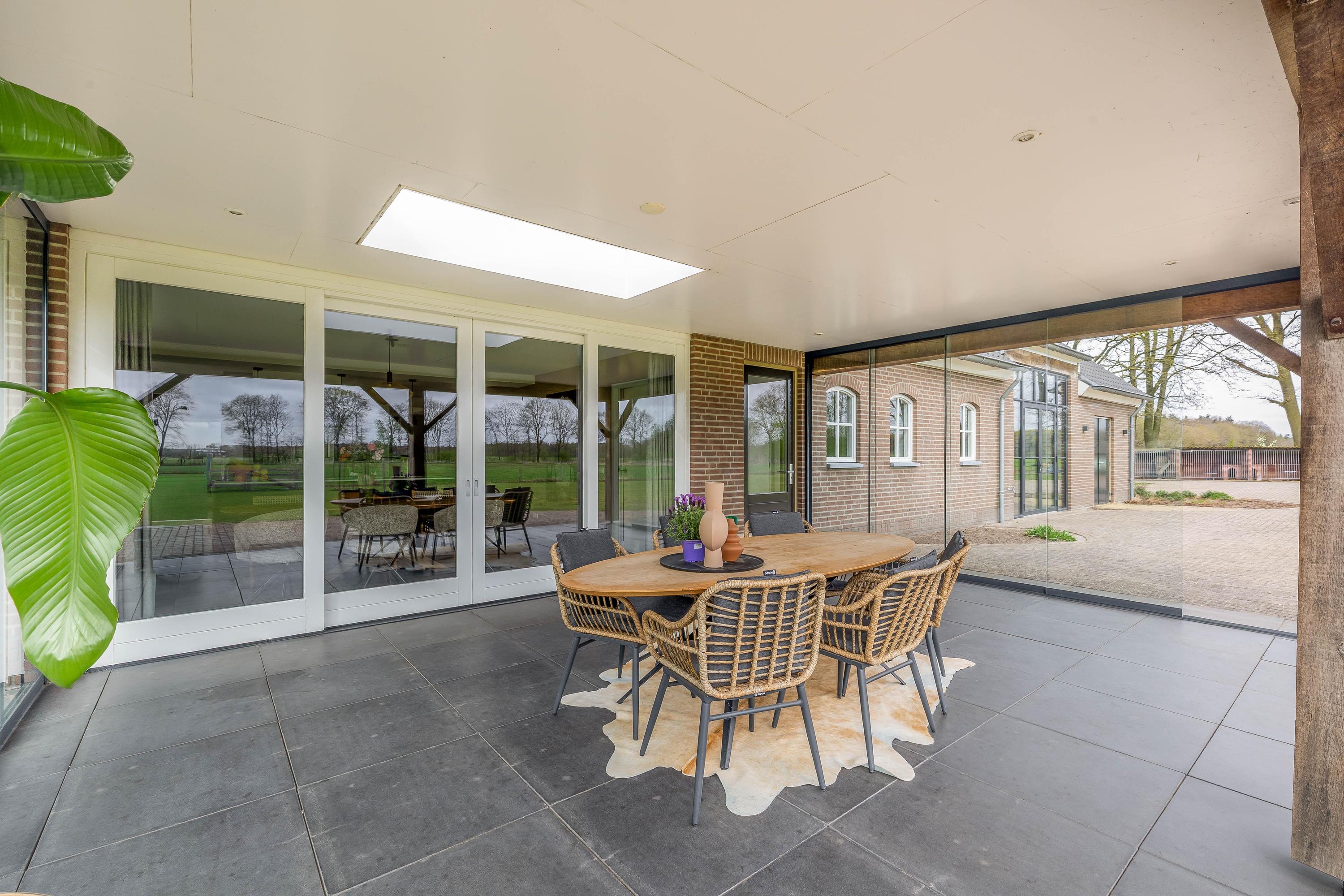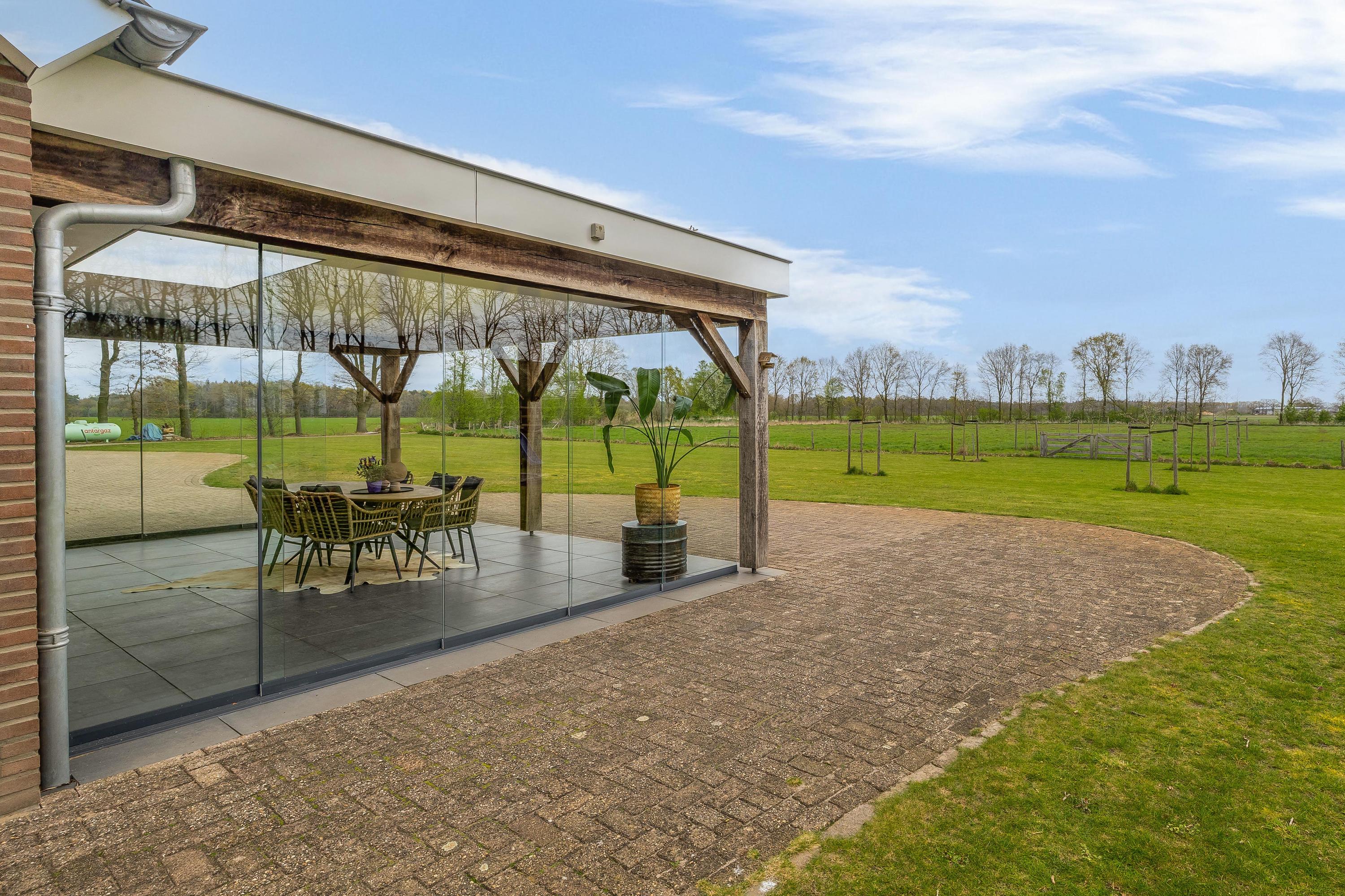 De rondom de woning gelegen tuin vormt een natuurlijk verlengstuk van het buitenleven. Het overdekte terras met lichtkoepel en glazen schuifwanden biedt een beschutte plek met vrij uitzicht over het aangrenzende weiland.