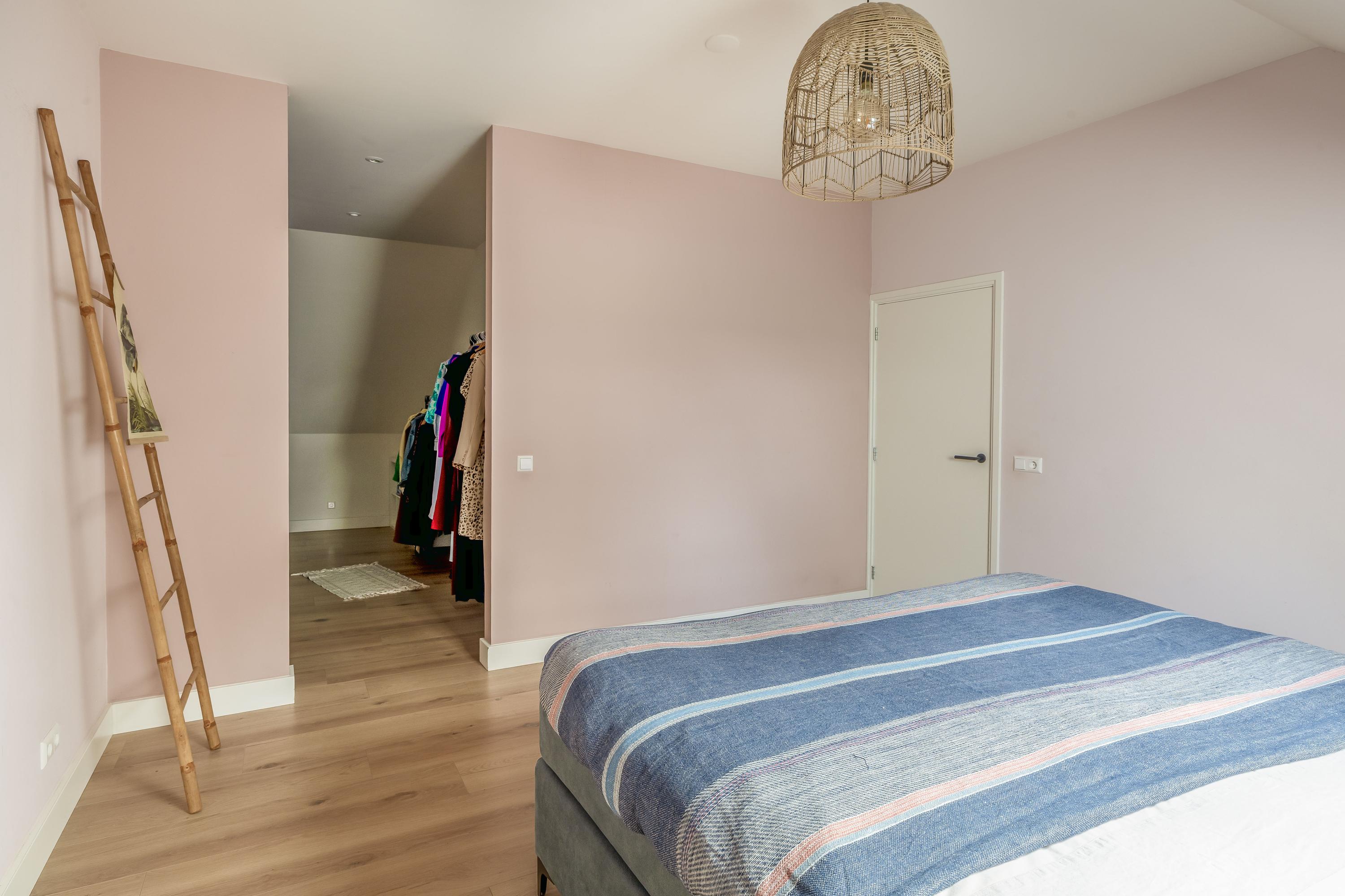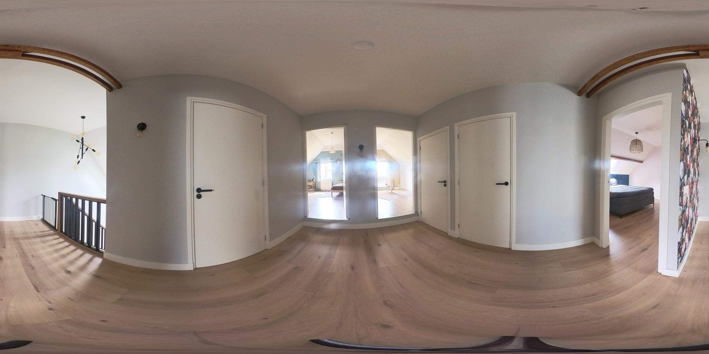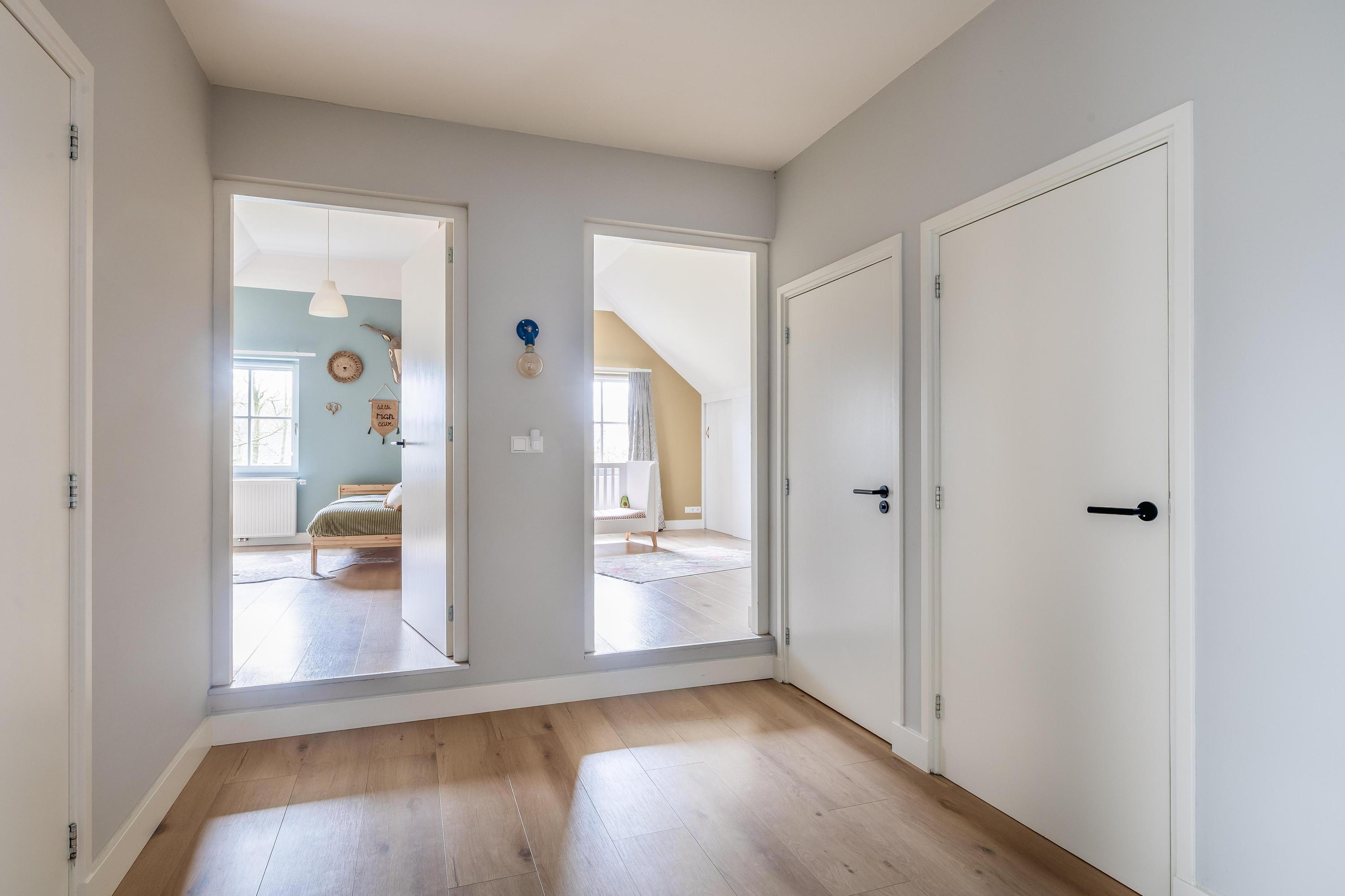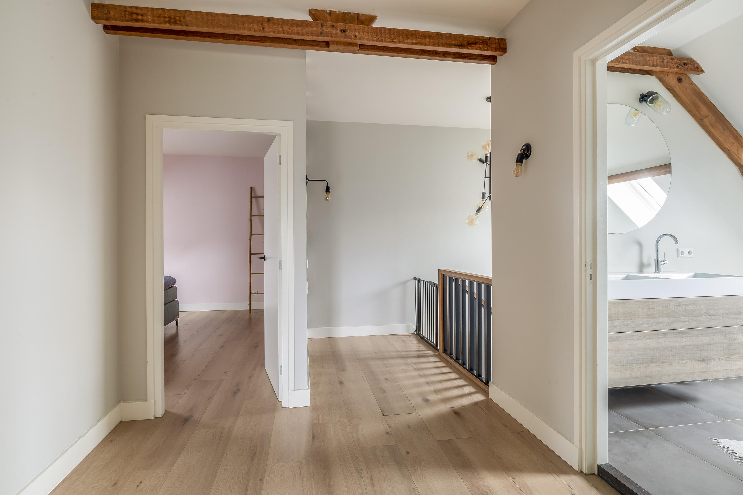 De eerste verdieping wordt gekenmerkt door een royale overloop met vide en biedt toegang tot drie ruime slaapkamers, een badkamer, separate toiletruimte en cv-ruimte. De verdieping is afgewerkt met een laminaatvloer en stucwerk wanden. De hoge plafonds zorgen voor een ruimtelijk effect. Eén van de slaapkamers beschikt over vaste kasten en de master bedroom is voorzien van een inloopkast. De badkamer is uitgerust met een ligbad, douche en dubbele wastafel met meubel. Zichtbare houten spanten dragen bij aan de warme en landelijke sfeer. De separate toiletruimte is voorzien van een zwevend toilet. In de cv-ruimte bevindt zich de cv-combiketel (Nefit, 2018).