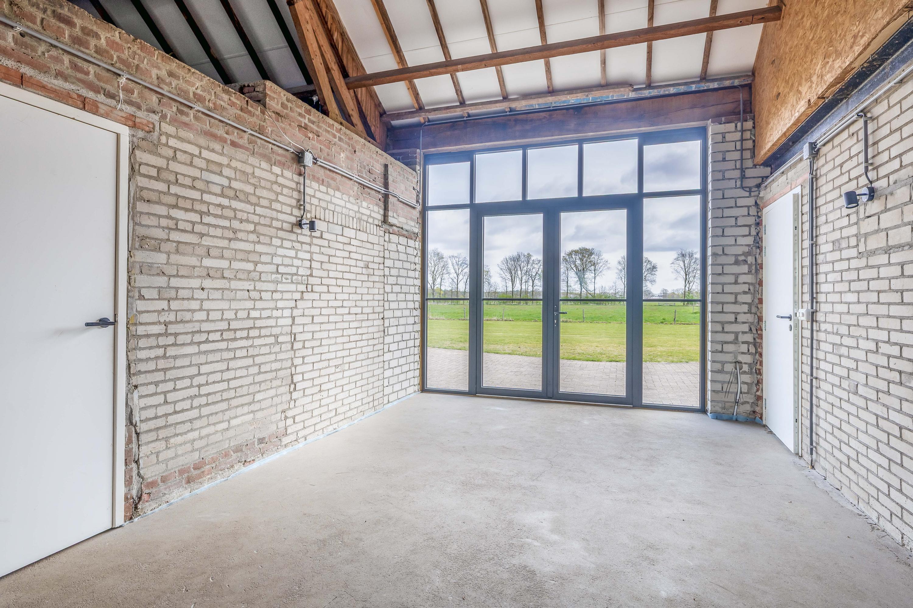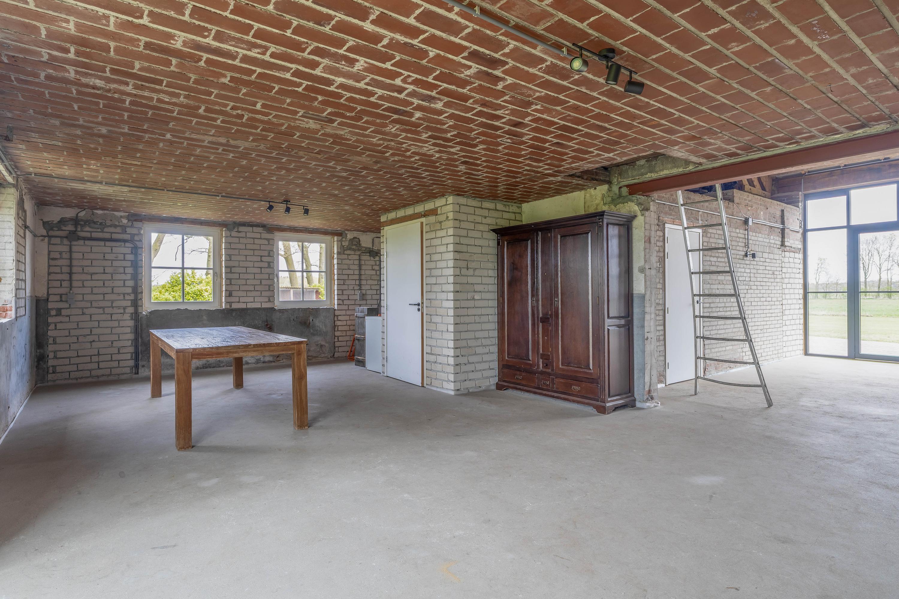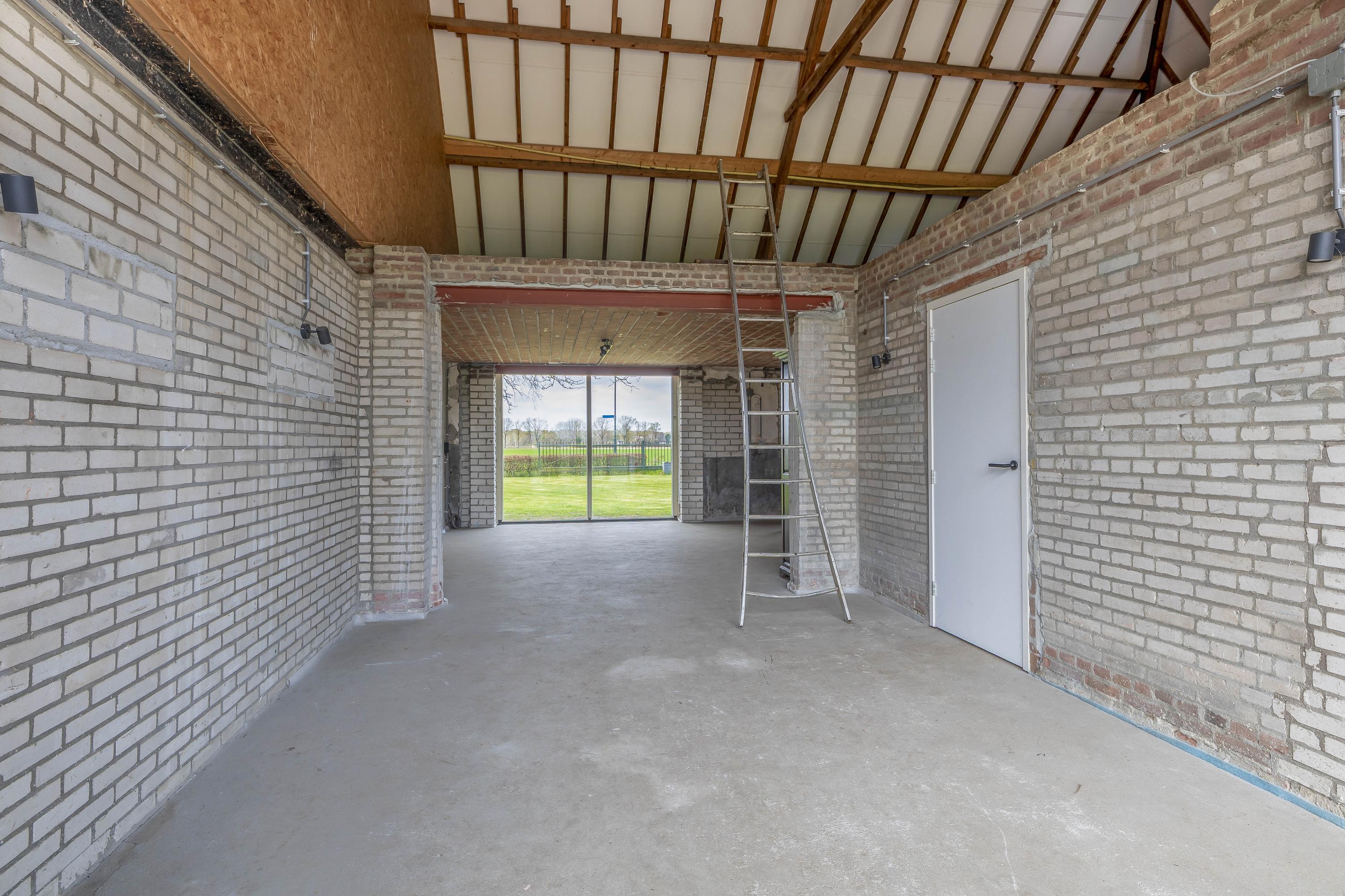 Aansluitend bevindt zich het inpandige achterhuis dat, naast de inpandige garage, een aanzienlijk extra gebruiksoppervlak biedt. Deze vormt een solide basis en is bij de ontwikkeling ontworpen met het oog op veelzijdig gebruik. Het achterhuis leent zich daarmee uitstekend voor uiteenlopende invullingen, zoals een zelfstandige woonruimte (mantelzorg), een kantoor- of praktijkruimte met vergaderfaciliteiten of een comfortabel gastenverblijf. De ruimte is voorzien van een vernieuwde betonnen vloer met vloerverwarming, metselwerk wanden en zichtbare houten gebinten die de landelijke sfeer versterken. Een deel beschikt over een entresol en er is volop natuurlijke lichtinval aanwezig. Openslaande deuren in de achtergevel zorgen voor een directe verbinding met de tuin. Daarnaast is er een aparte toiletruimte aanwezig met een zwevend toilet en fonteintje. Vanuit het achterhuis is tevens toegang tot de inpandige garage. Vanaf het erf is de garage bereikbaar via een brede loopdeur.