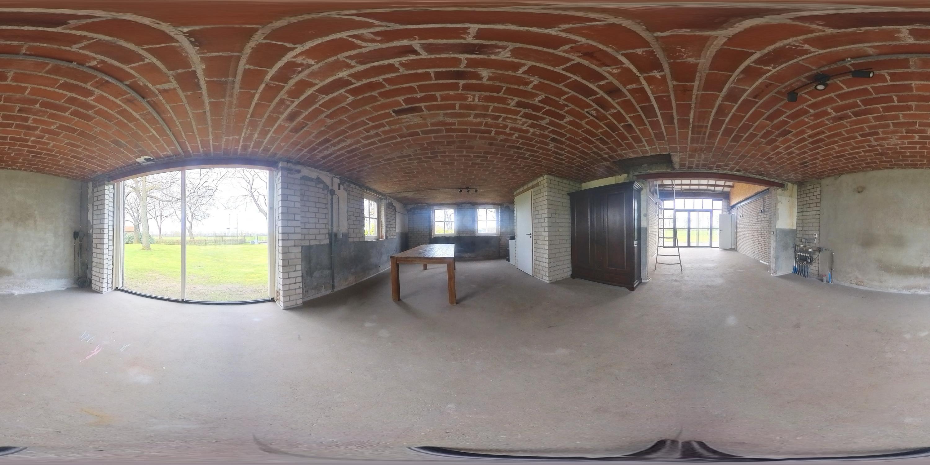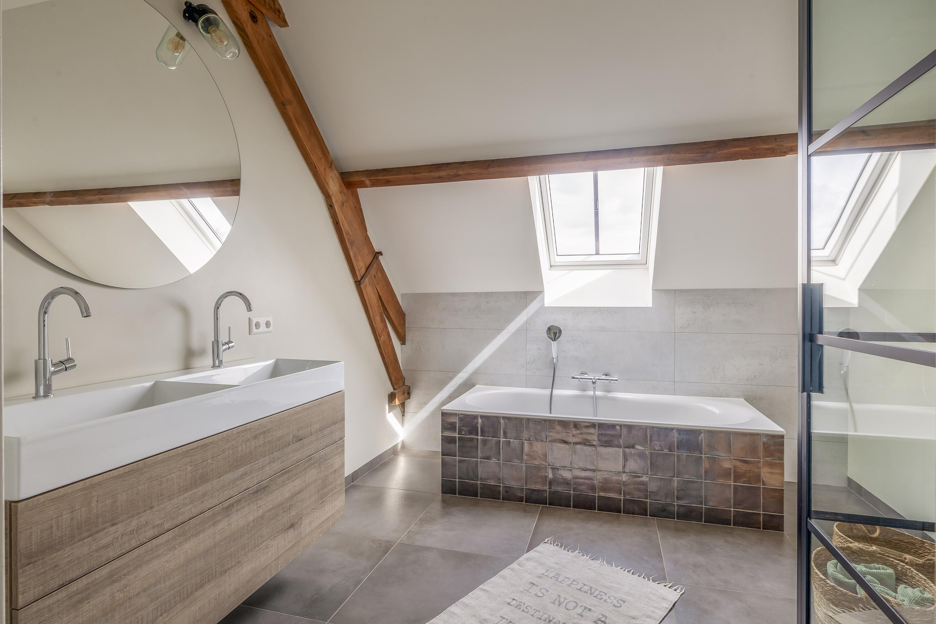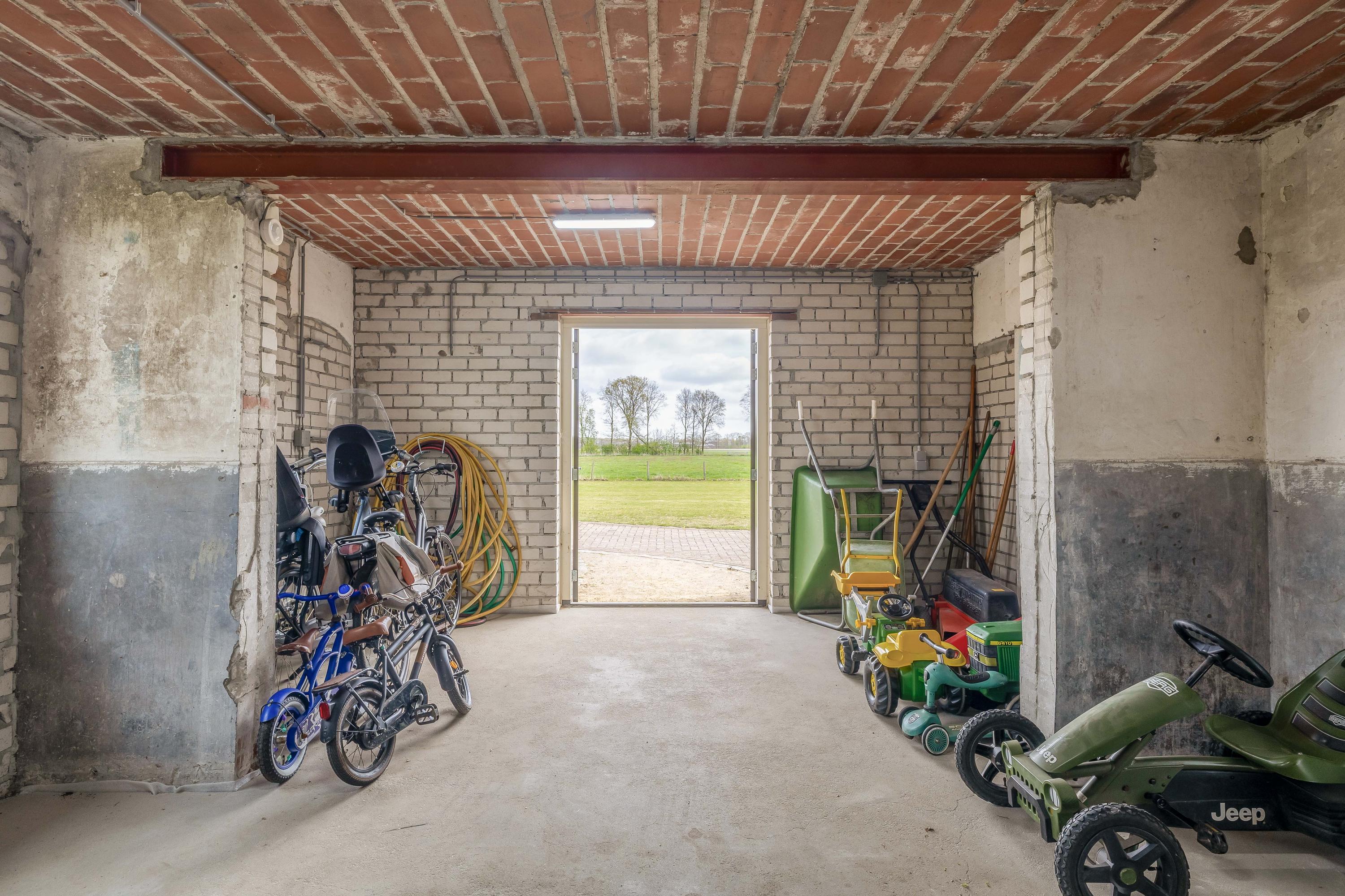 Aansluitend bevindt zich het inpandige achterhuis dat, naast de inpandige garage, een aanzienlijk extra gebruiksoppervlak biedt. Deze vormt een solide basis en is bij de ontwikkeling ontworpen met het oog op veelzijdig gebruik. Het achterhuis leent zich daarmee uitstekend voor uiteenlopende invullingen, zoals een zelfstandige woonruimte (mantelzorg), een kantoor- of praktijkruimte met vergaderfaciliteiten of een comfortabel gastenverblijf. De ruimte is voorzien van een vernieuwde betonnen vloer met vloerverwarming, metselwerk wanden en zichtbare houten gebinten die de landelijke sfeer versterken. Een deel beschikt over een entresol en er is volop natuurlijke lichtinval aanwezig. Openslaande deuren in de achtergevel zorgen voor een directe verbinding met de tuin. Daarnaast is er een aparte toiletruimte aanwezig met een zwevend toilet en fonteintje. Vanuit het achterhuis is tevens toegang tot de inpandige garage. Vanaf het erf is de garage bereikbaar via een brede loopdeur.
