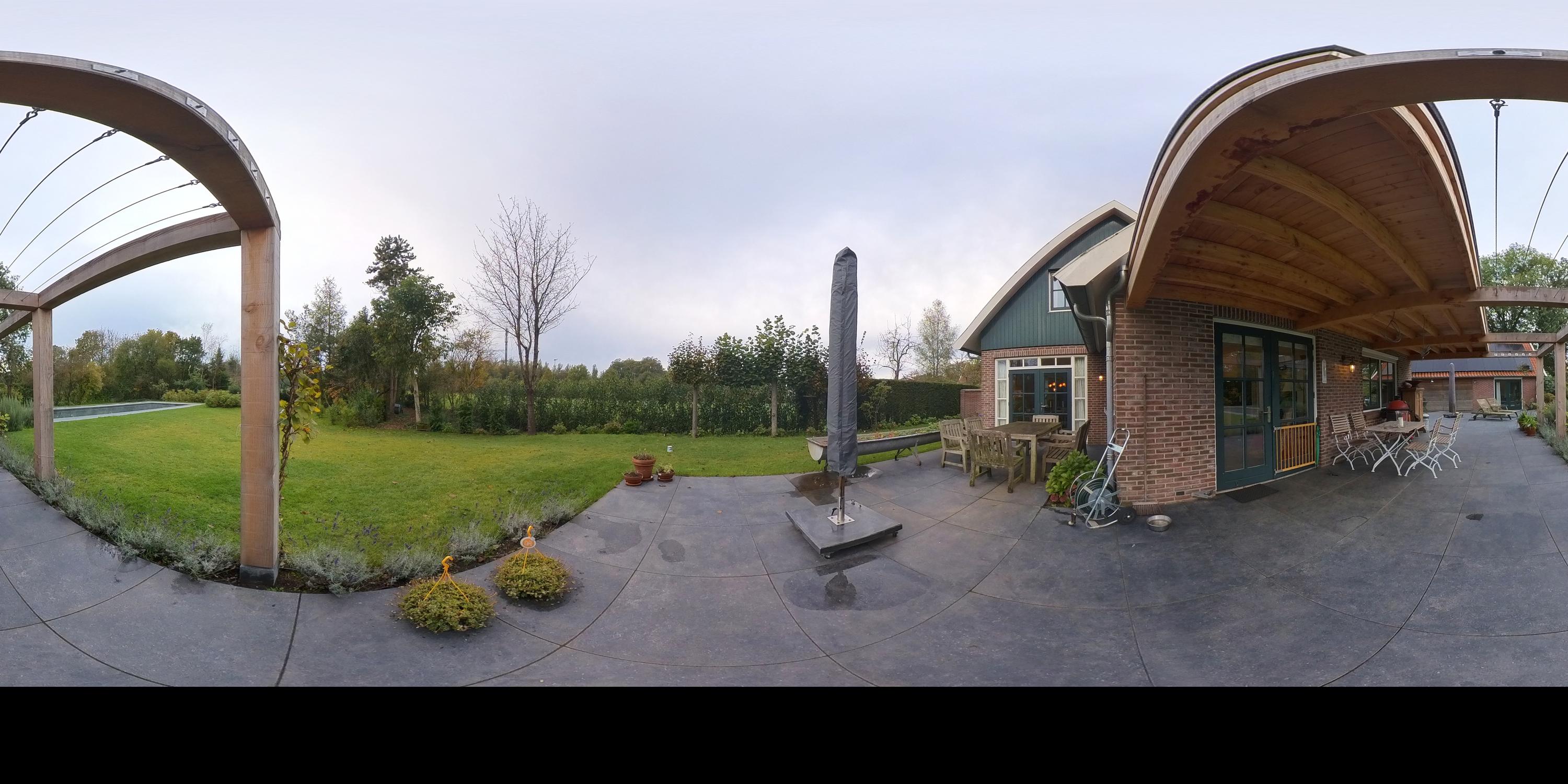 Achter de keuken het heerlijke zonneterras met veranda. De siertuin is prachtig, met een groot gazon, een vruchtenboomgaard en fraai ingerichte borders en bloemperken. De tuin is voorzien van een beregeningsinstallatie op grondwater en de automatische grasmaaier zorgt ervoor dat het gazon er als een biljartlaken bij ligt.
