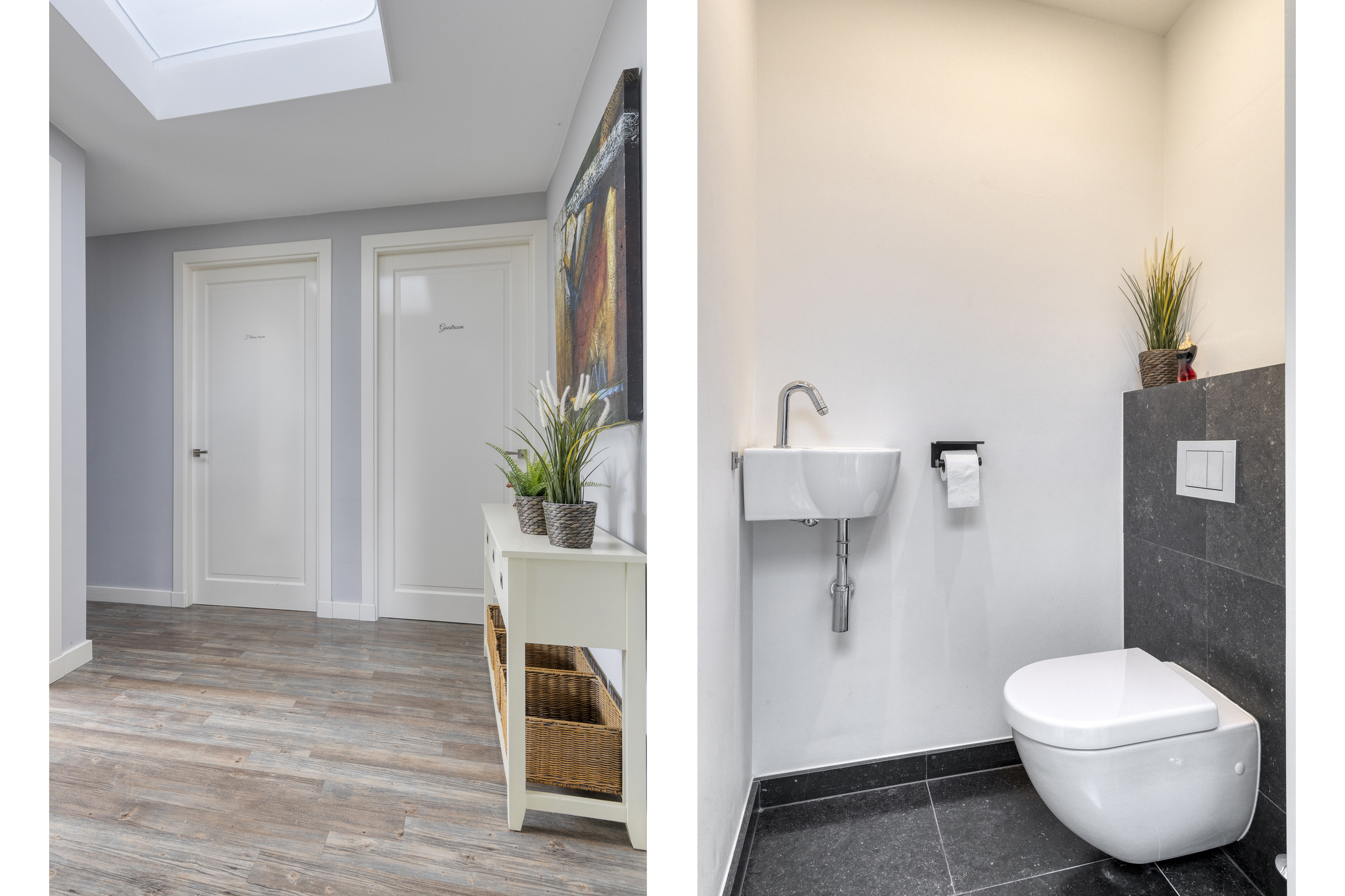 Toilet: separaat; met wandcloset en fonteintje. Wanden gestuct en afgewerkt met natuursteen.