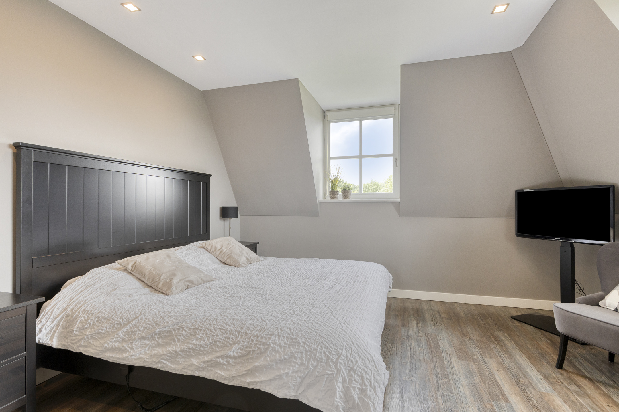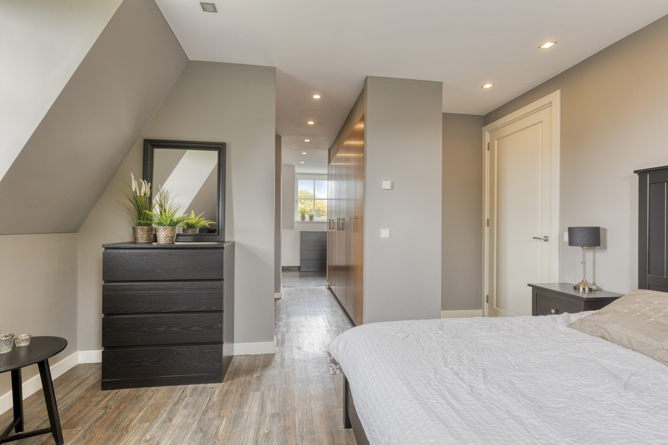 Hoofdslaapkamer: met inloopkasten; wanden gestuct; PVC?vloer; plafond met inbouwspots.