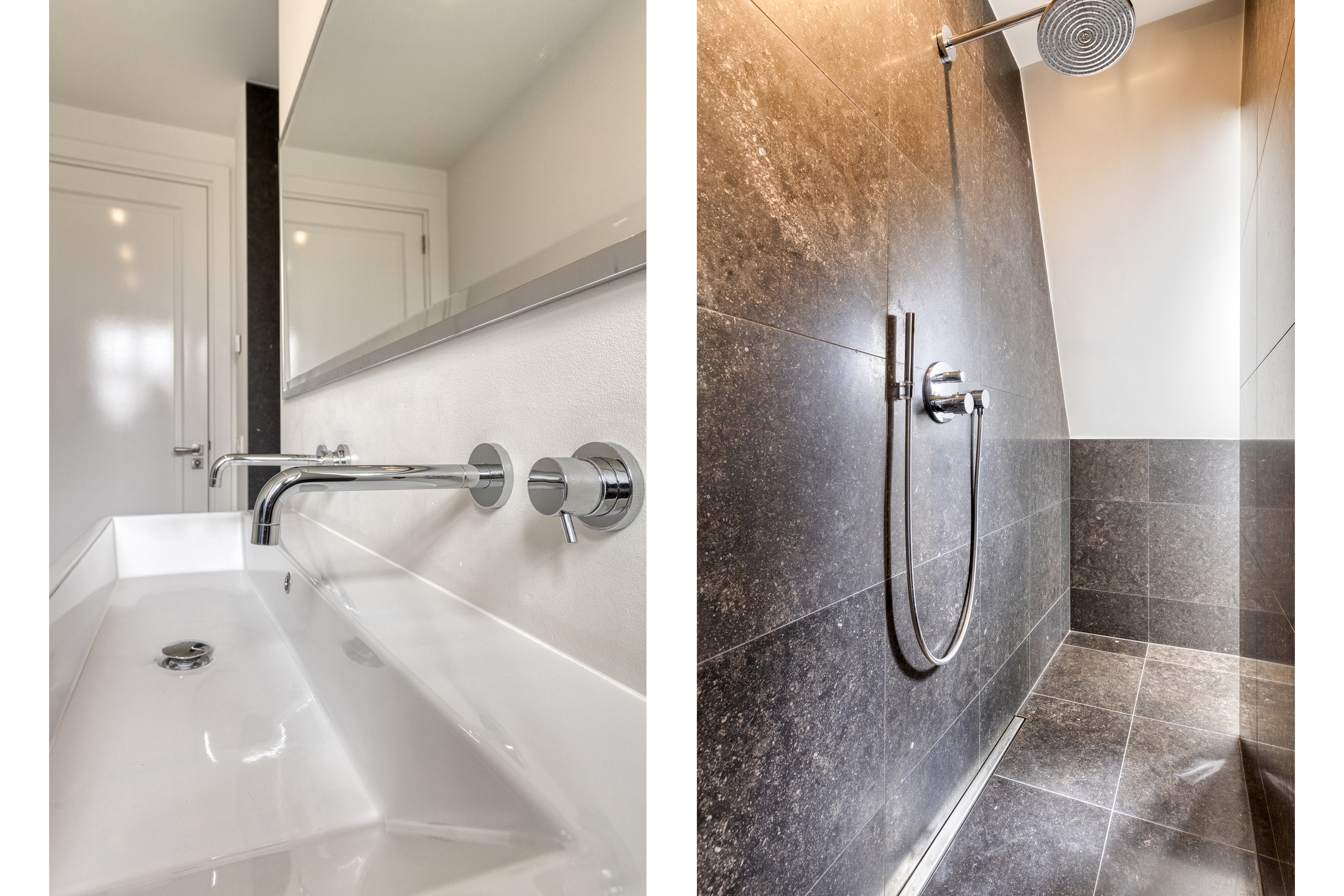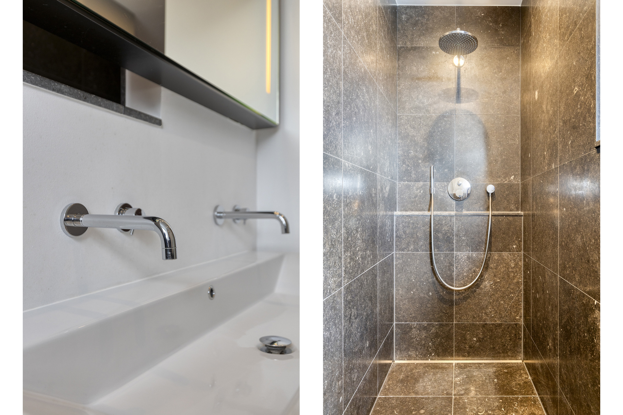 2e luxe badkamer (kinderen/gasten): uitgevoerd in natuursteen; met dakkapel; royale inloopdouche en dubbele wastafel.