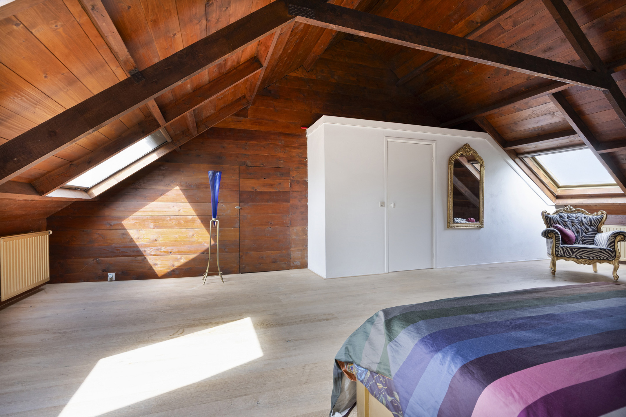 hoofdslaapkamer met een 3-tal dakramen, wandafwerking stucwerk, laminaatvloer met eiken bovenlaag, fraai zicht op de houten balkenconstructie, inloopkast vv. omvormer en een dakraam;