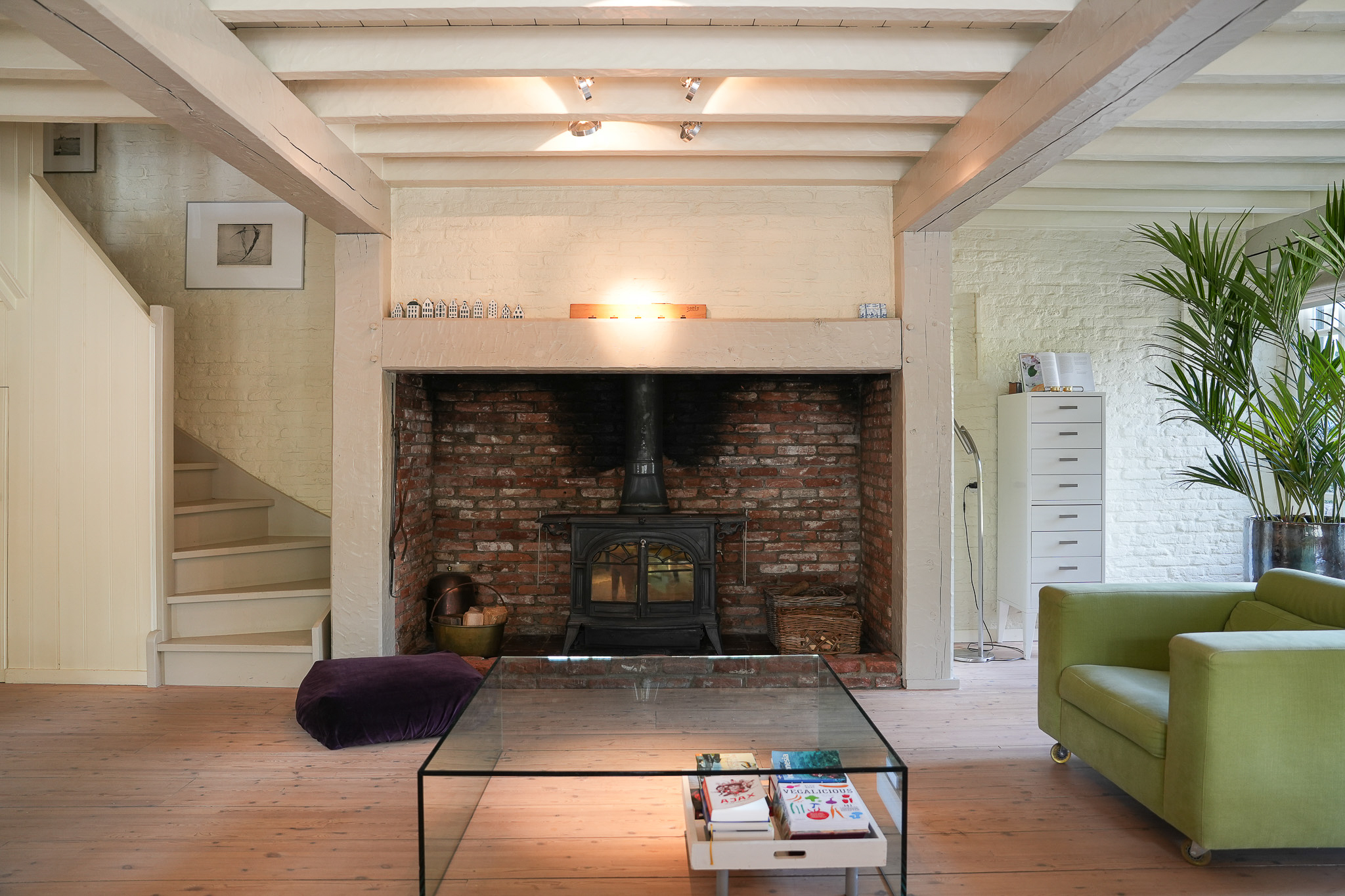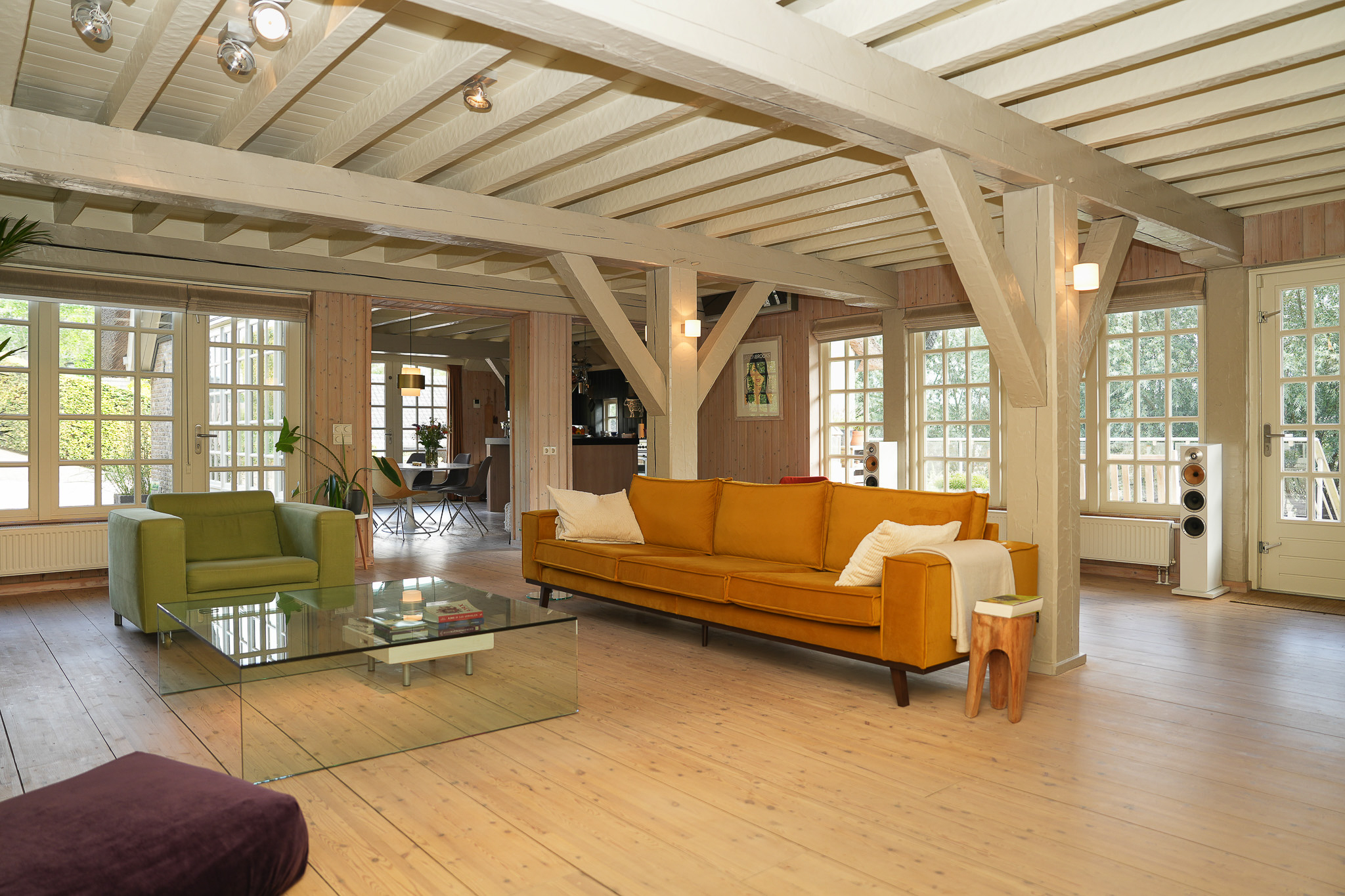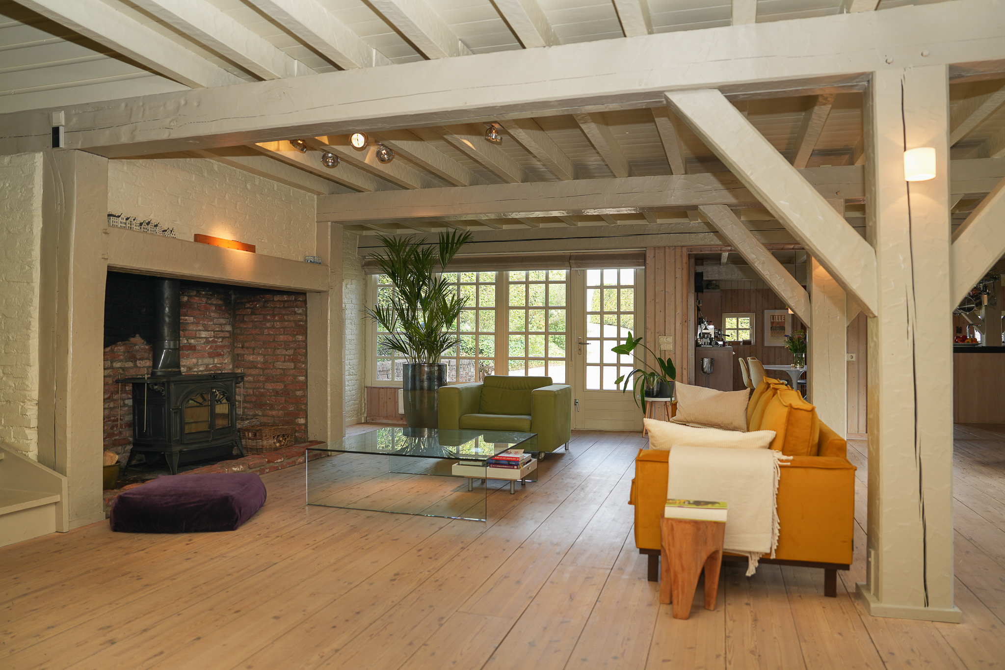 Via de brede pui met roederamen komt men binnen in de imposante leefruimte, waar brede vloerdelen, een houtgestookte kachel en grote raampartijen een warme sfeer creëren.