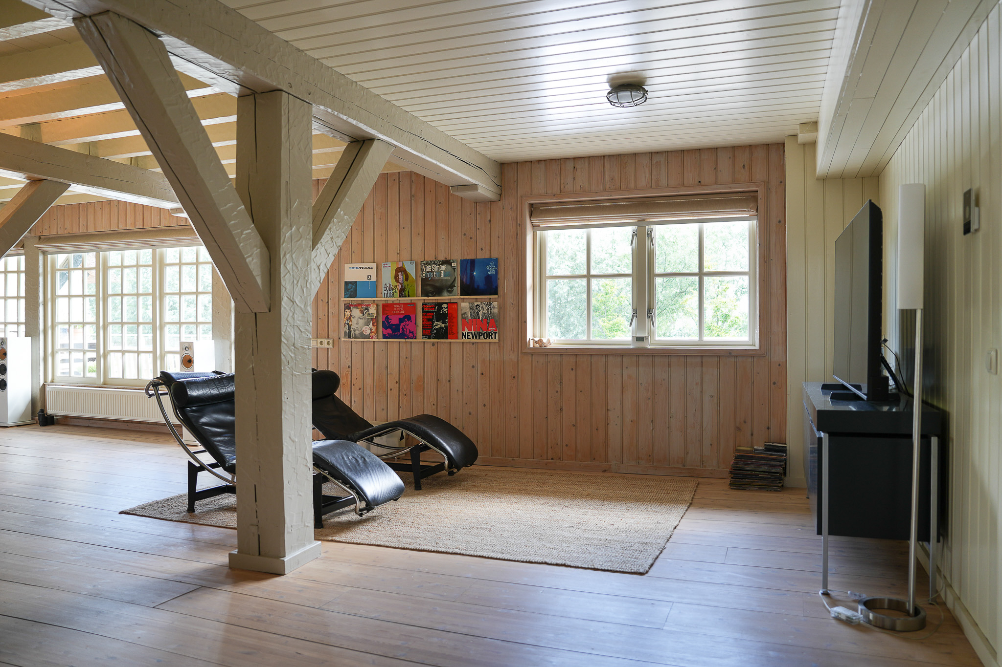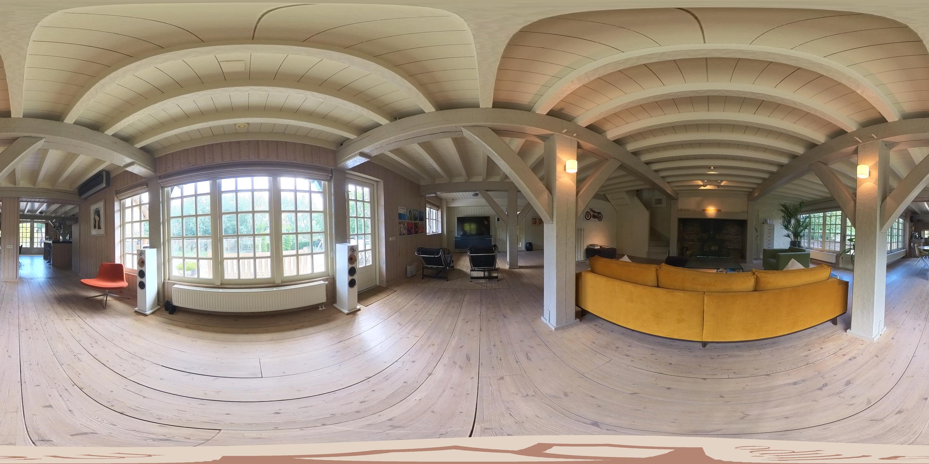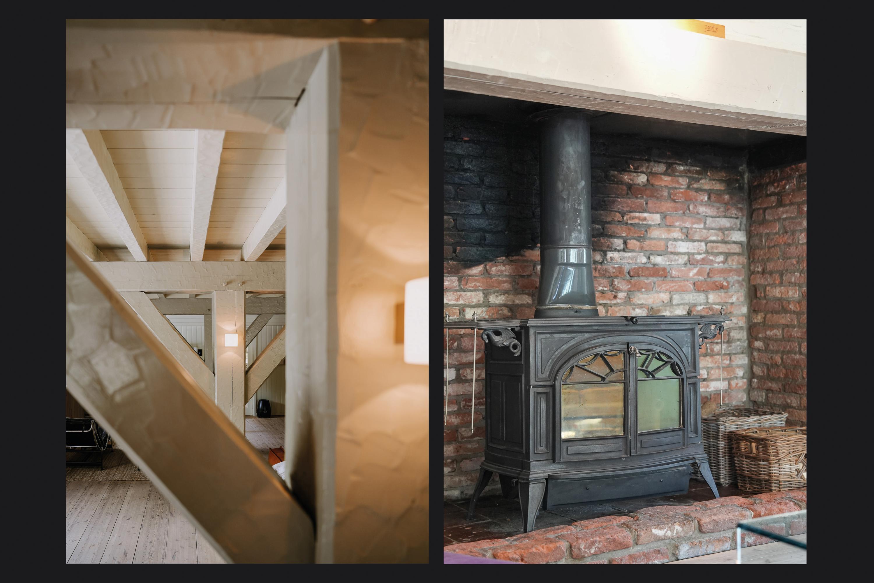 Via de brede pui met roederamen komt men binnen in de imposante leefruimte, waar brede vloerdelen, een houtgestookte kachel en grote raampartijen een warme sfeer creëren.