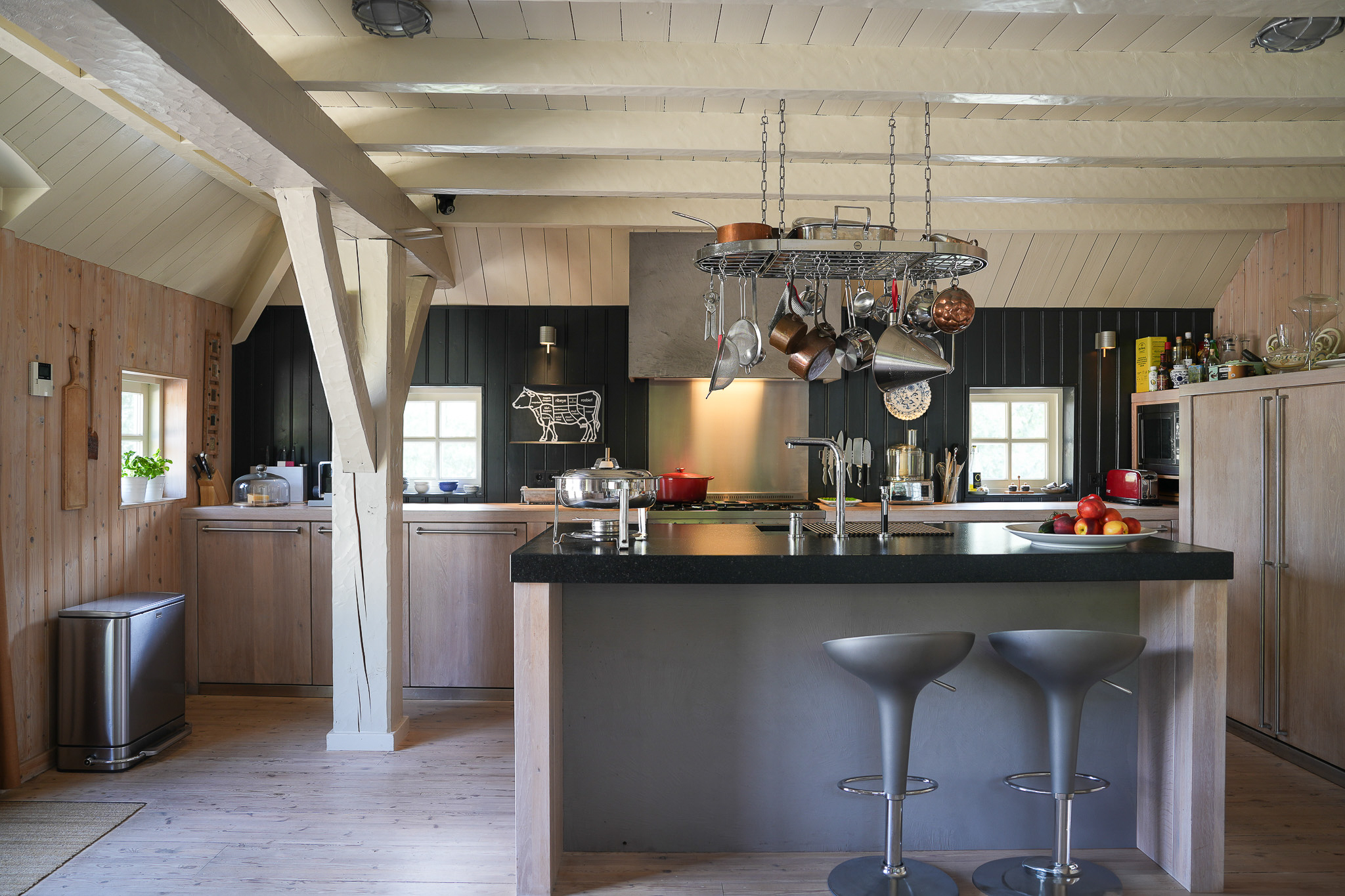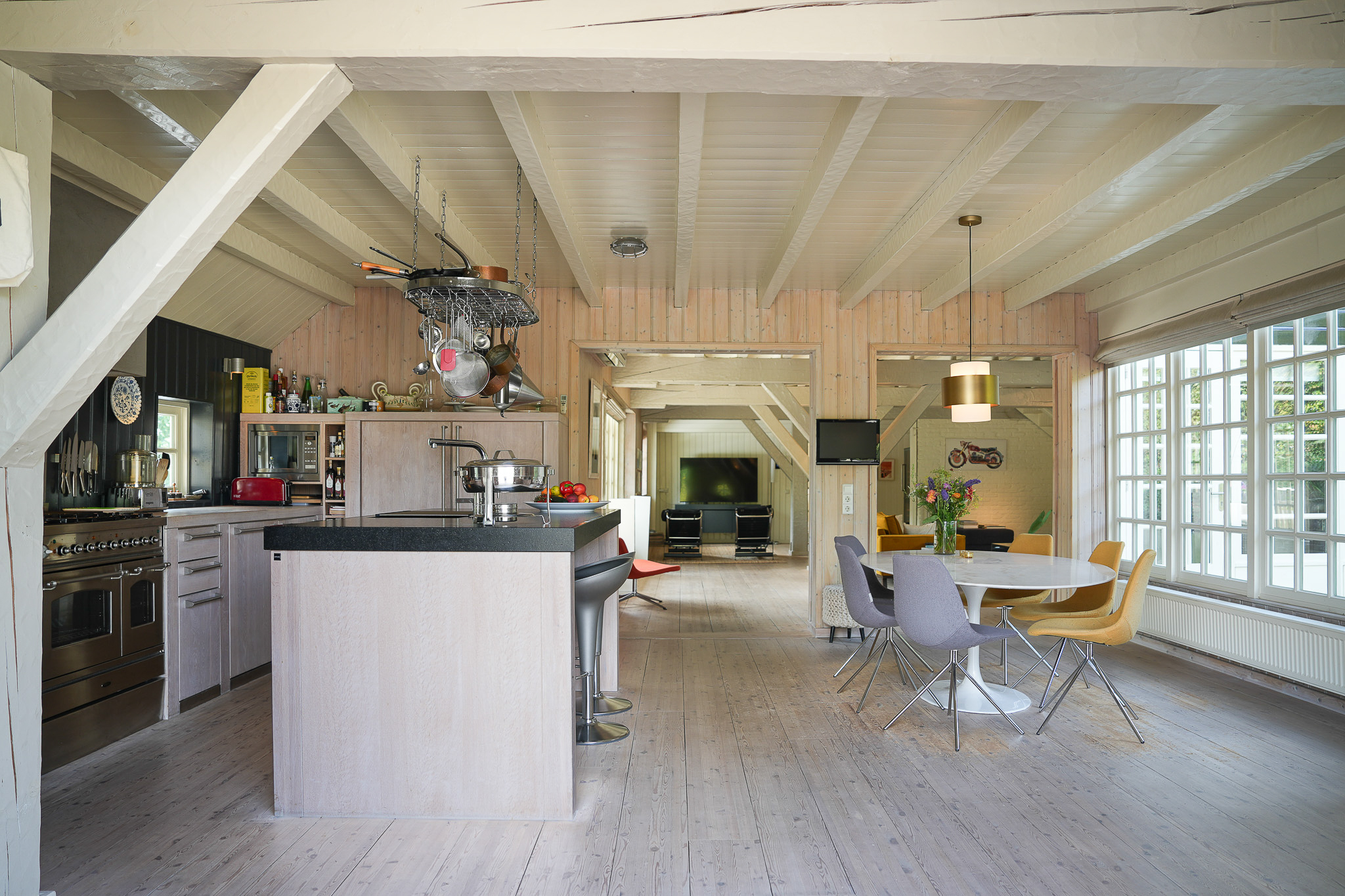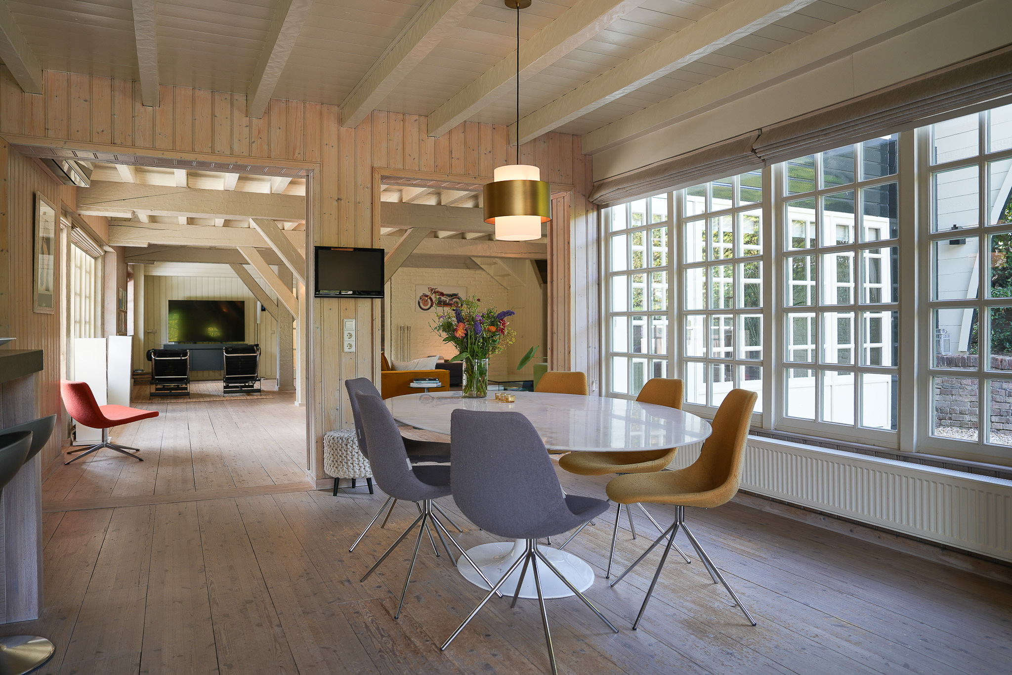 Tuingerichte leefruimte van 140 m² met brede vloerdelen, houtkachel en een compleet ingerichte keuken, portaal naar de gastenkamer met aangrenzende doucheruimte, toilet en werkkamer op de begane grond.