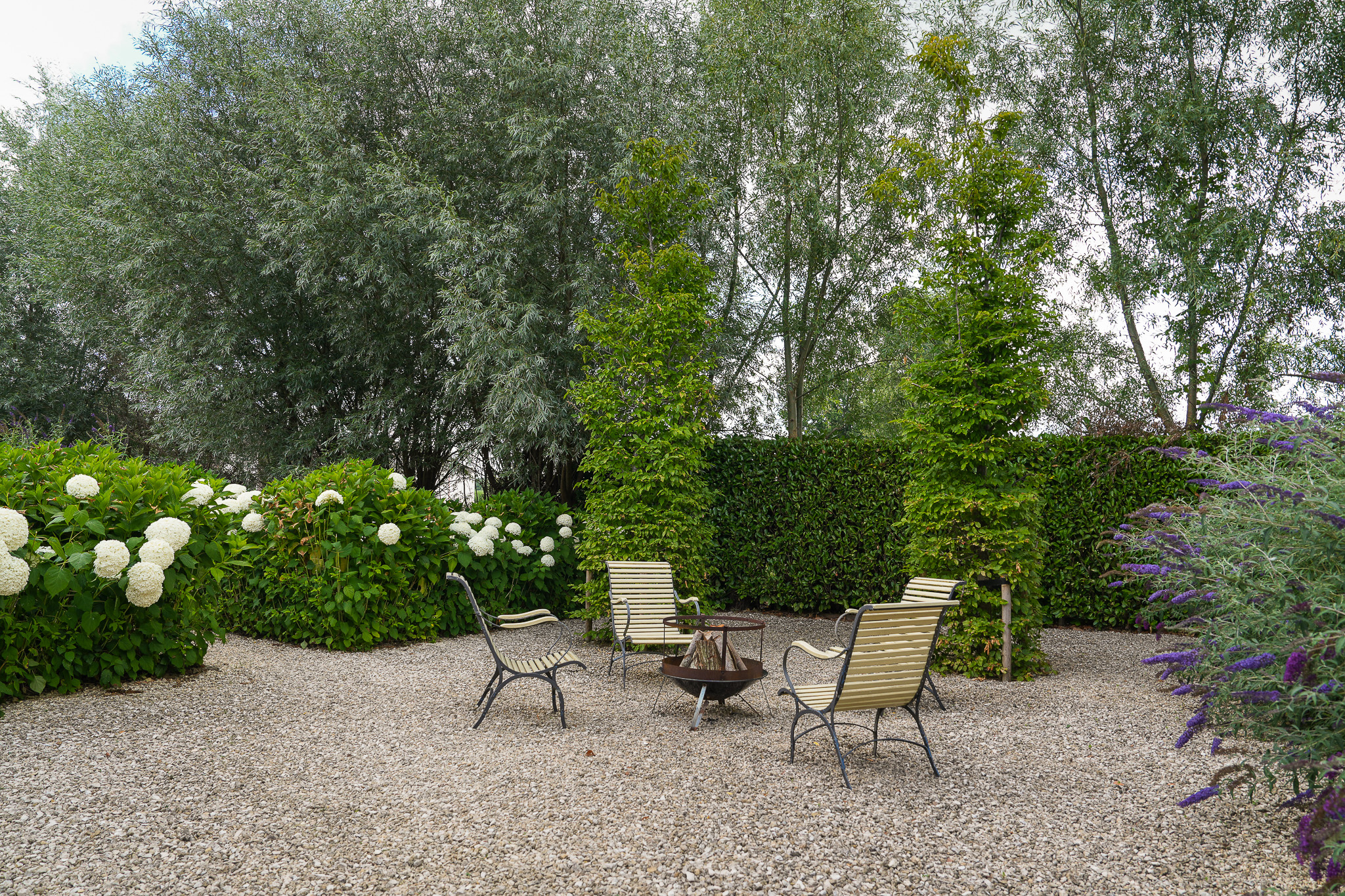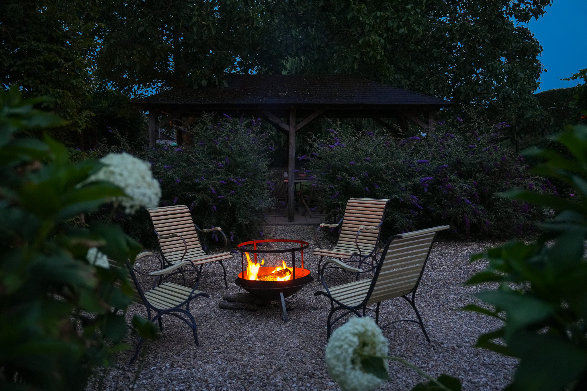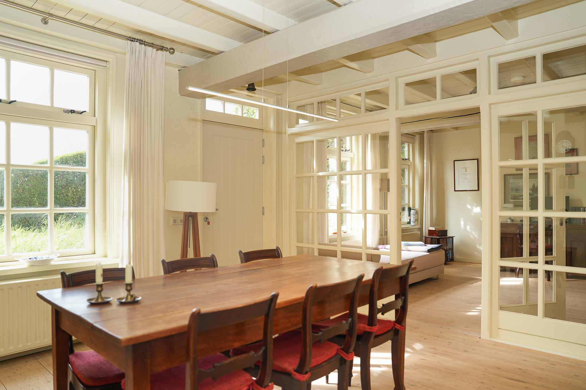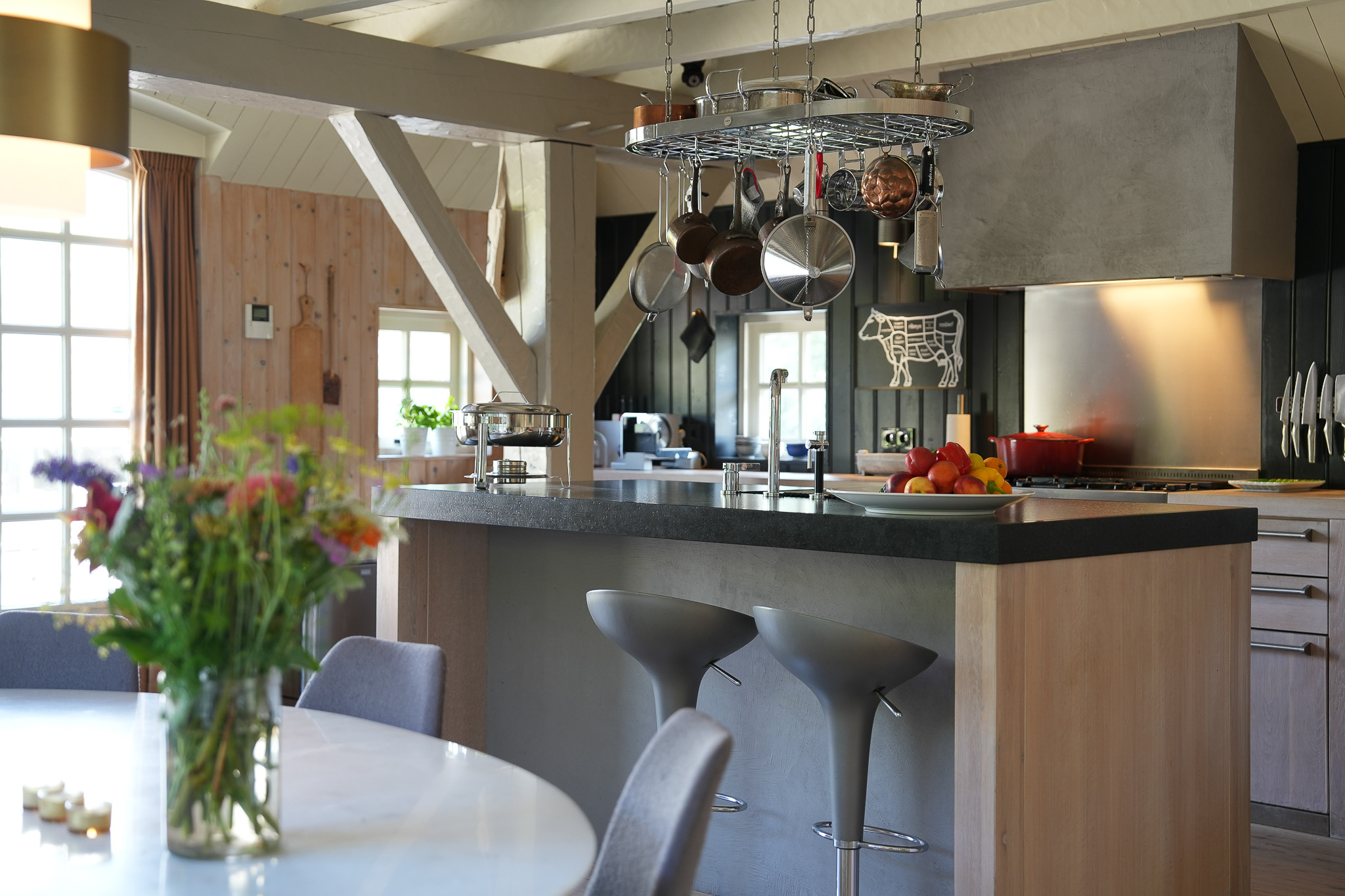 Tuingerichte leefruimte van 140 m² met brede vloerdelen, houtkachel en een compleet ingerichte keuken, portaal naar de gastenkamer met aangrenzende doucheruimte, toilet en werkkamer op de begane grond.