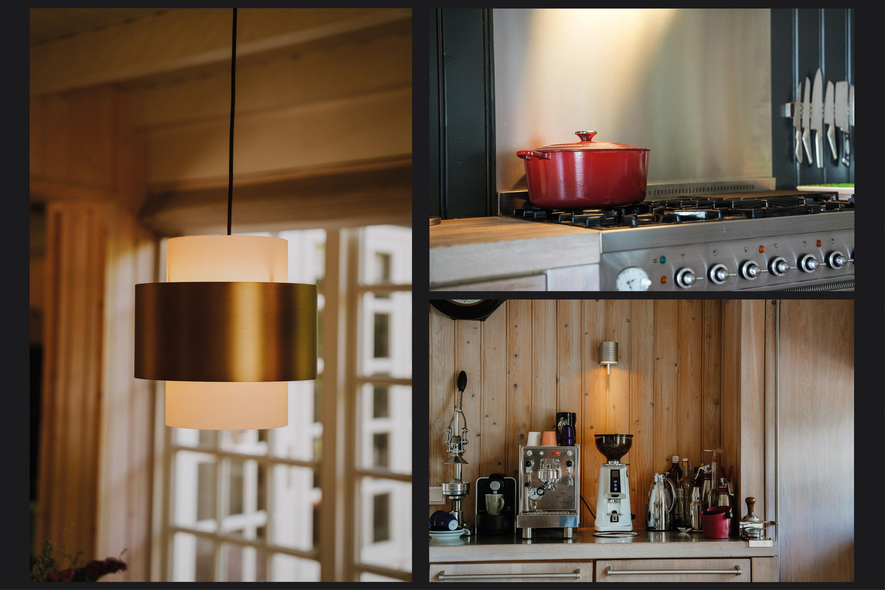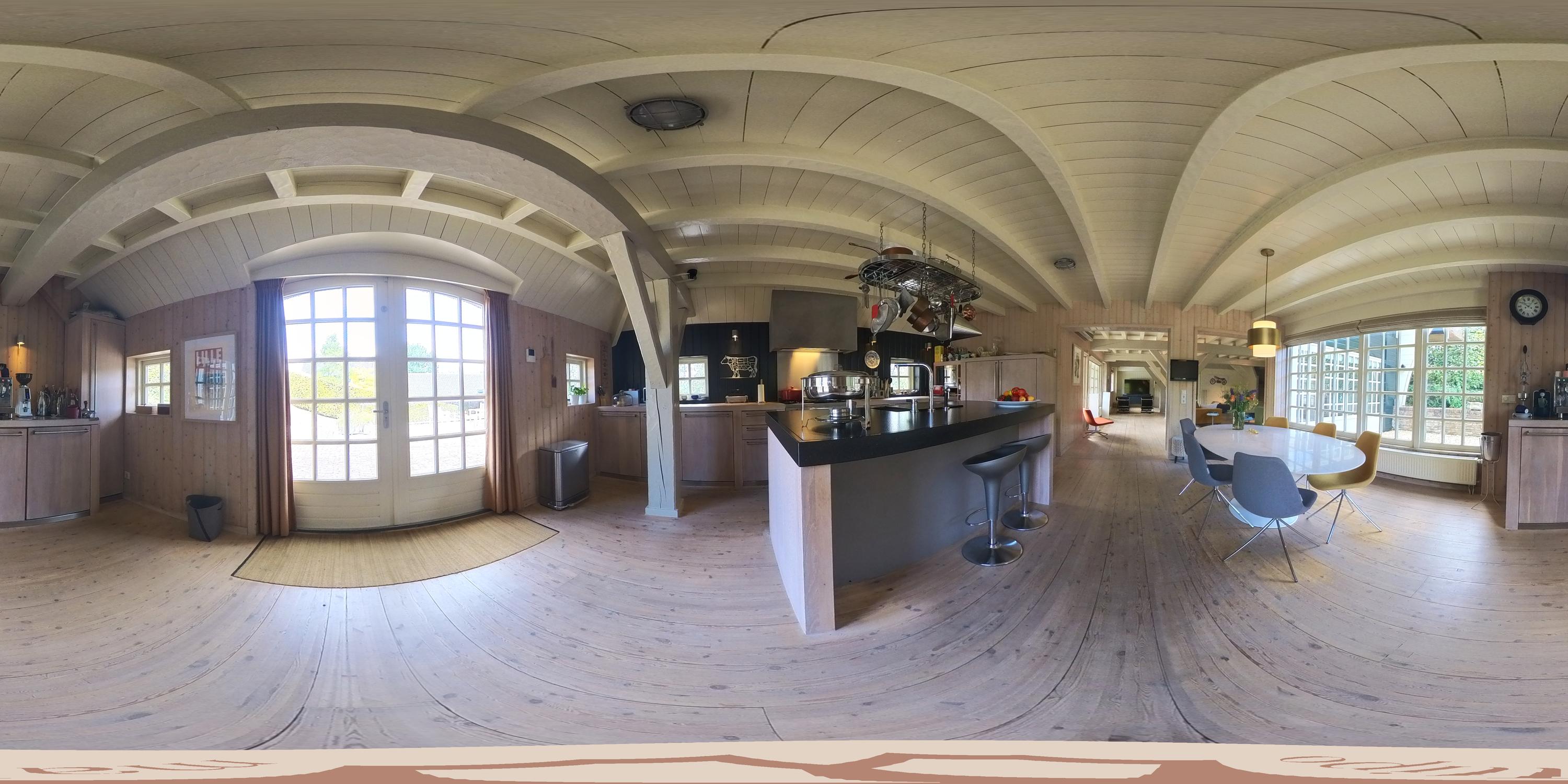 De woonkeuken is eveneens licht en ruim, biedt plek aan een grote eettafel en is voorzien van een luxe, compleet uitgeruste keuken met hoogwaardige inbouwapparatuur. Vanuit hier is er toegang tot een tweede terras dat grenst aan de oprit.