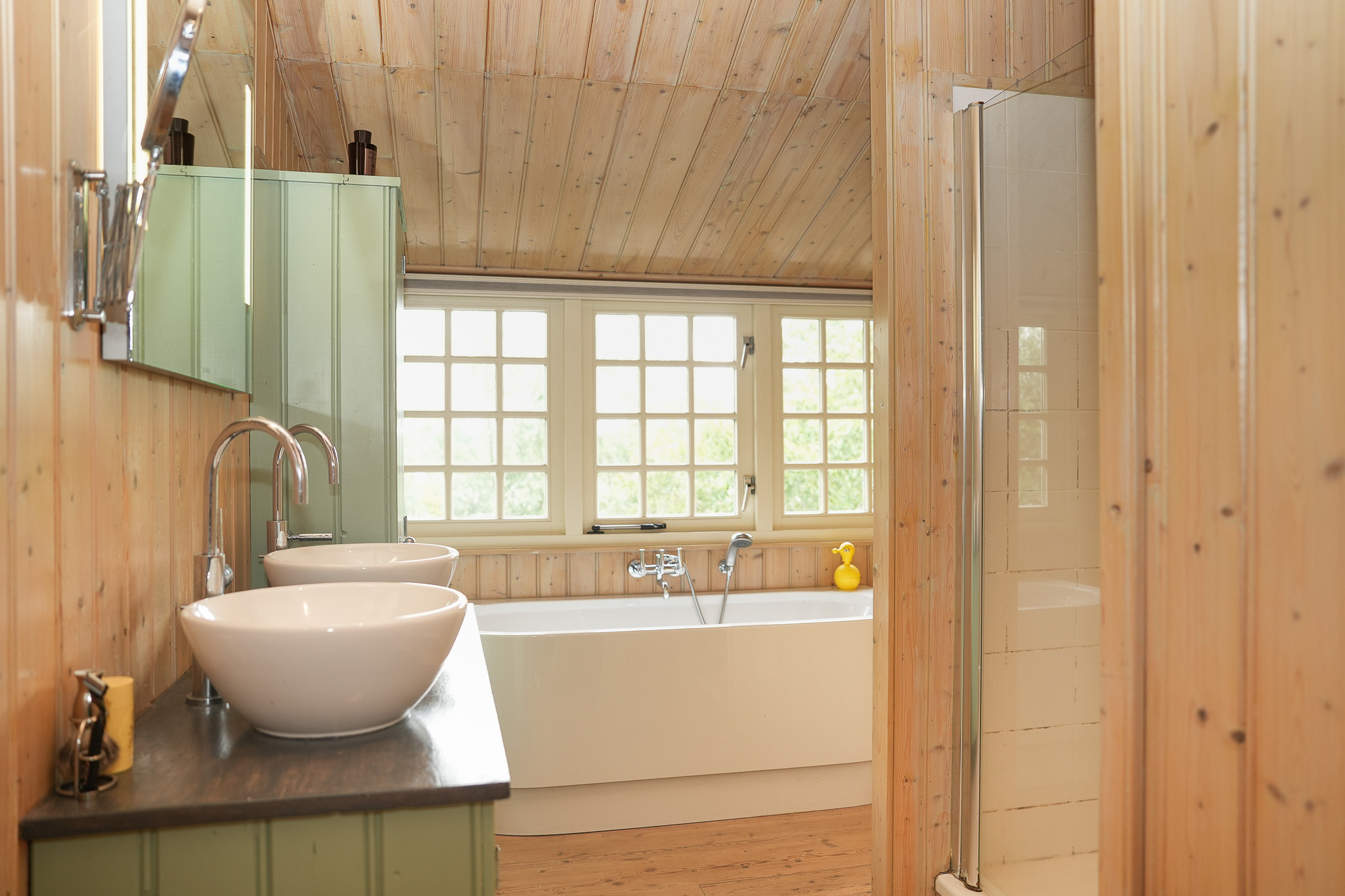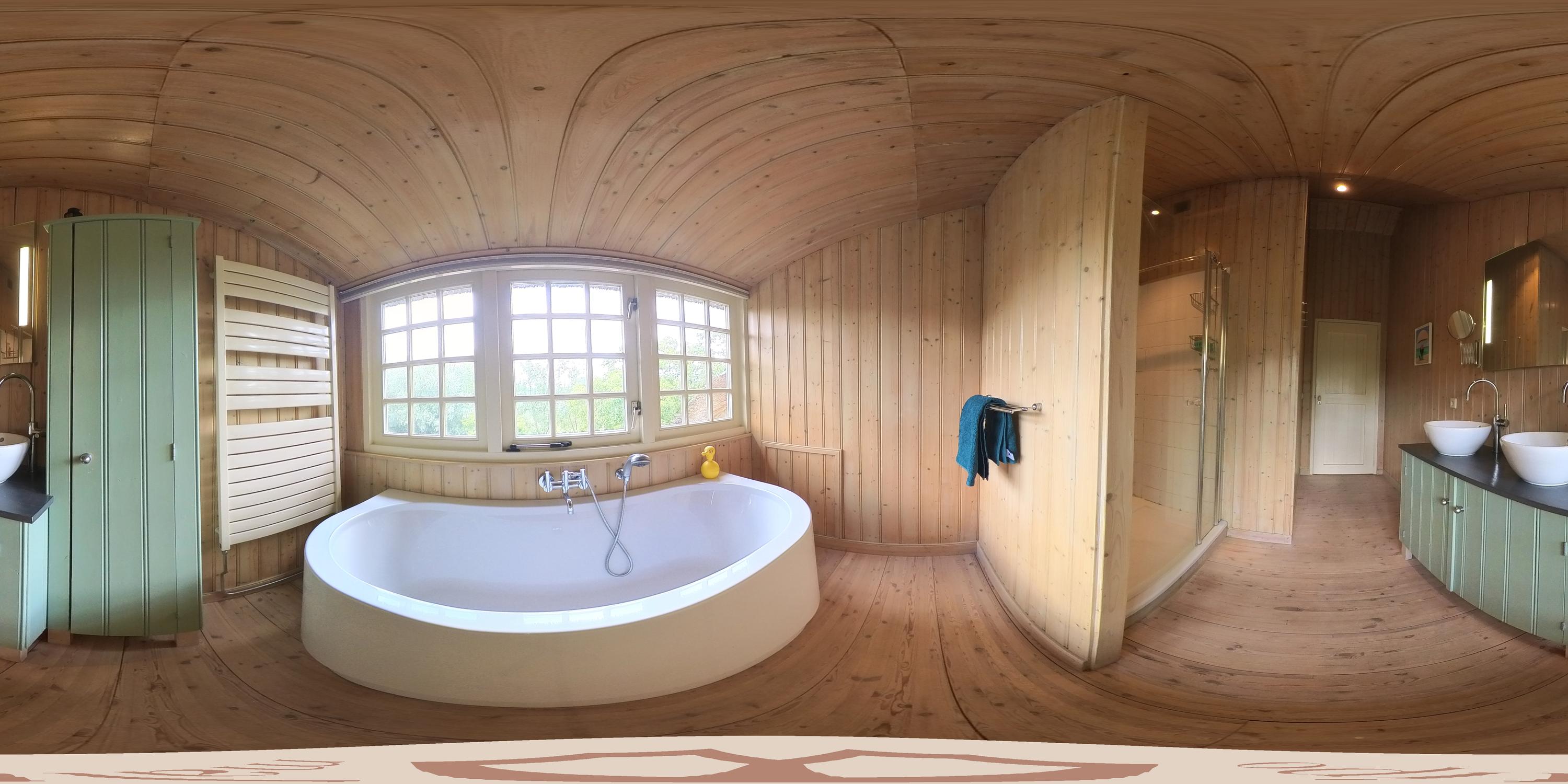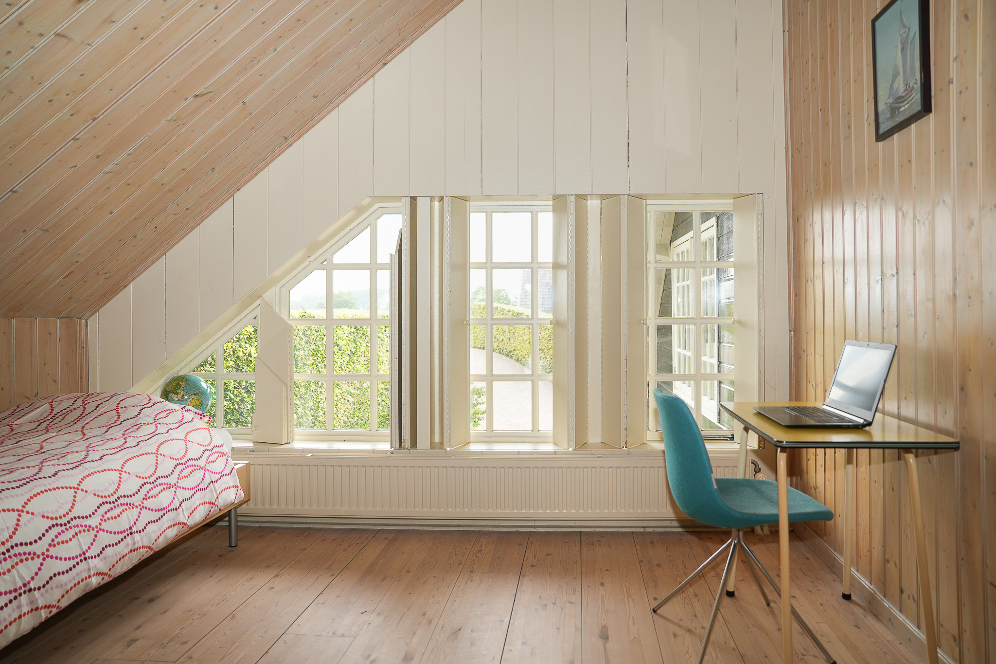 De overige twee slaapkamers zijn speels vormgegeven, met zichtbare kapconstructie en roederamen die een fraai uitzicht over de omgeving bieden. De badkamer is in dezelfde stijl afgewerkt als de slaapkamers en uitgerust met een ligbad, douchecabine en dubbele wastafel.