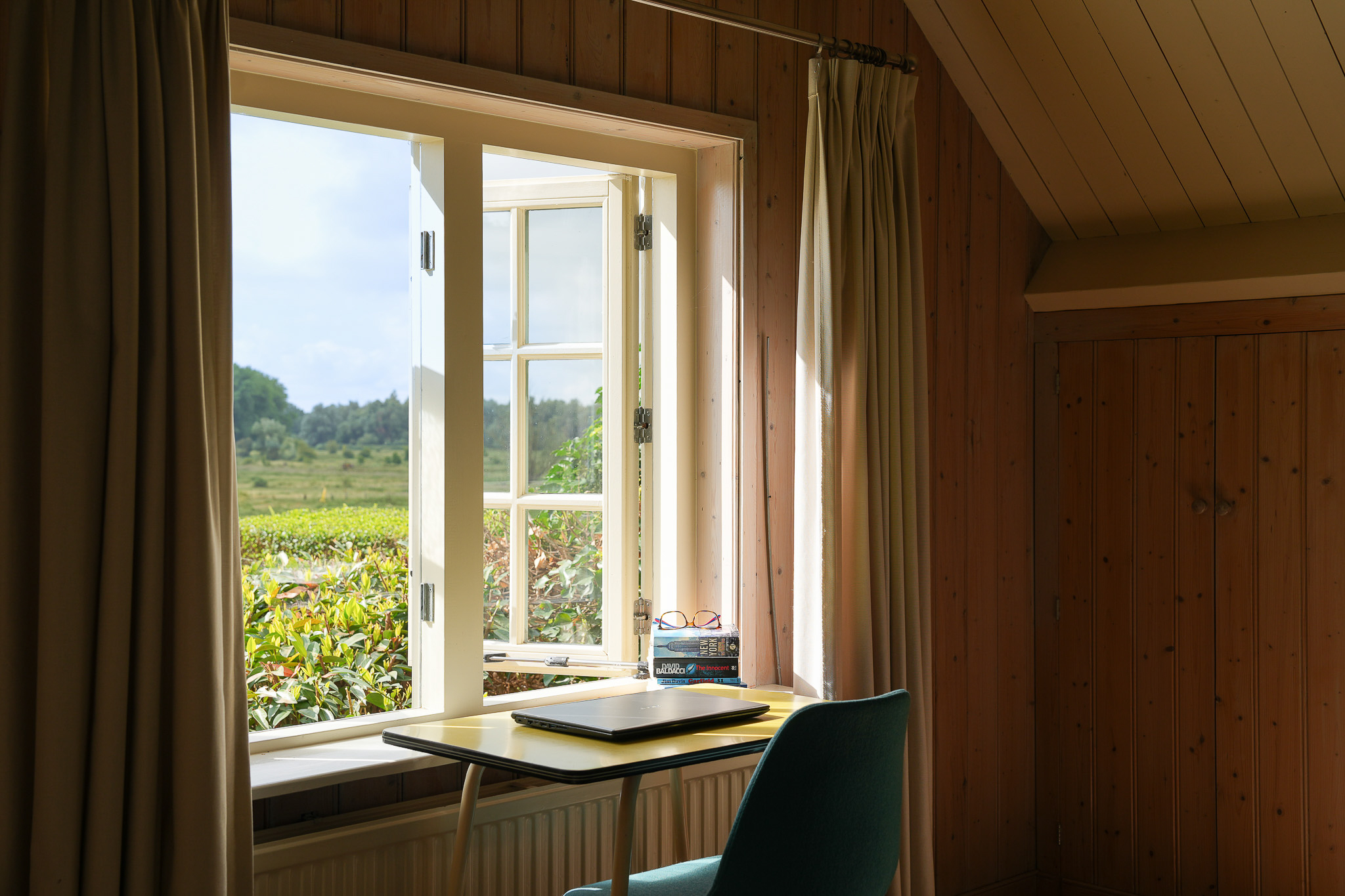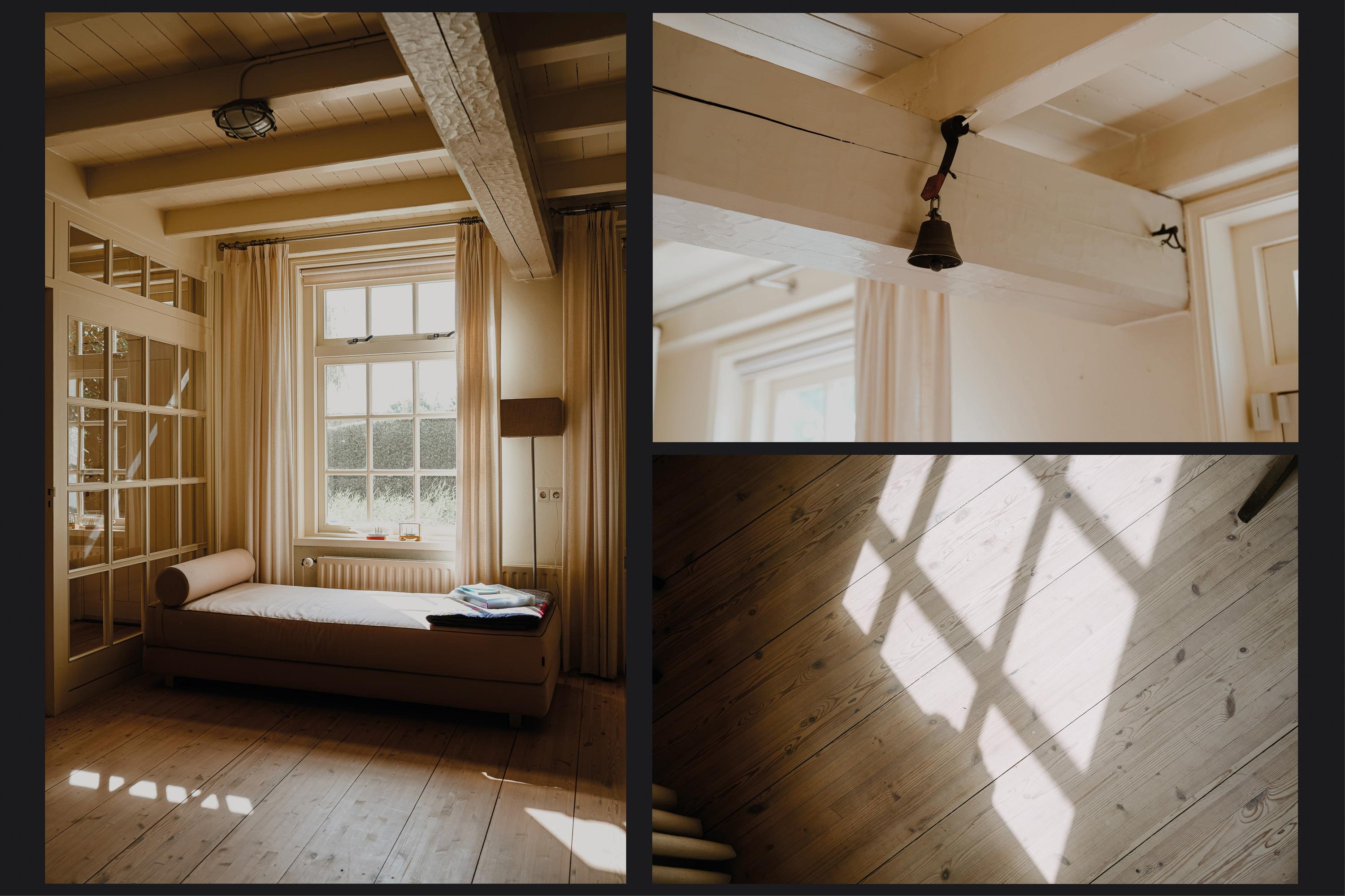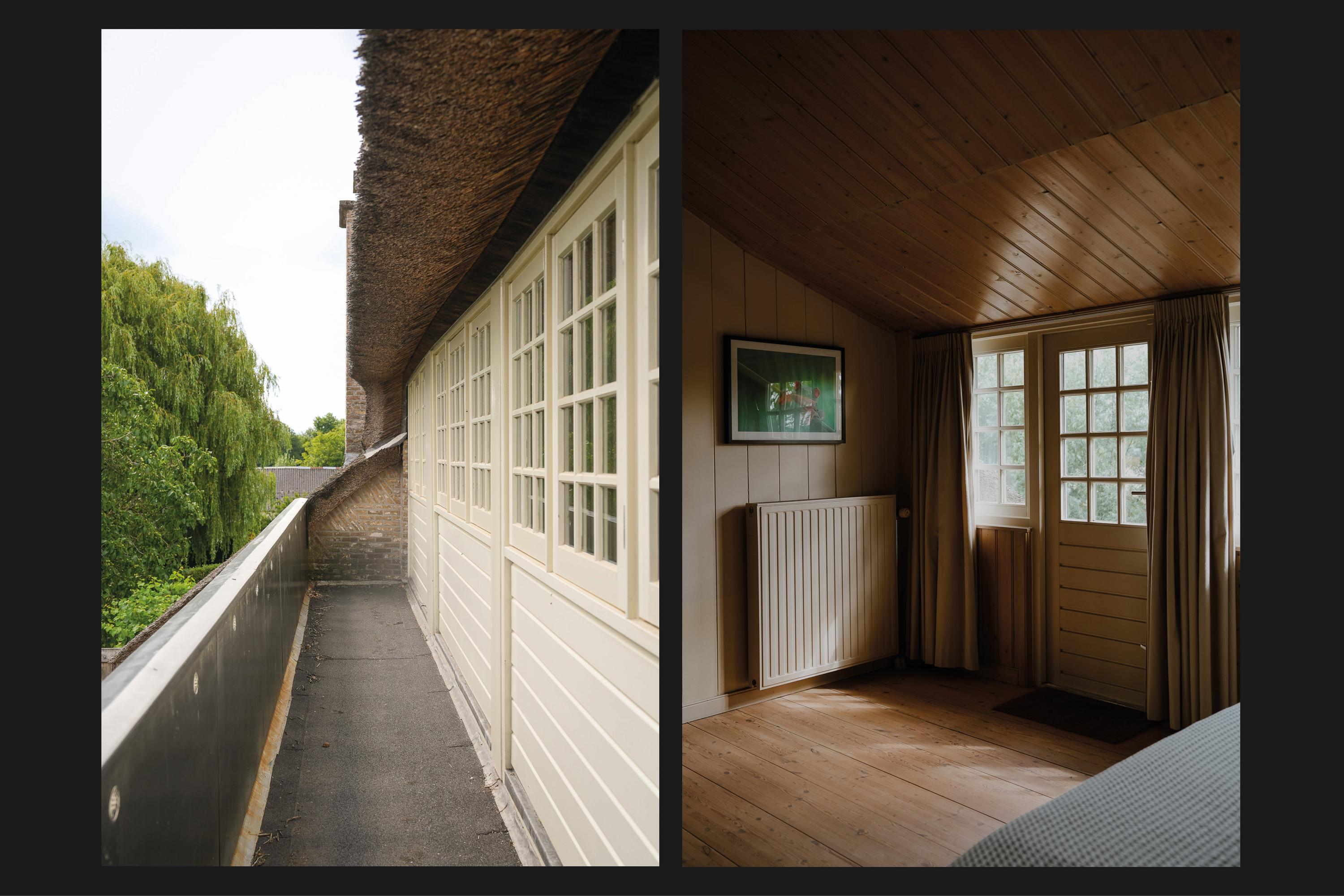 De overige twee slaapkamers zijn speels vormgegeven, met zichtbare kapconstructie en roederamen die een fraai uitzicht over de omgeving bieden. De badkamer is in dezelfde stijl afgewerkt als de slaapkamers en uitgerust met een ligbad, douchecabine en dubbele wastafel.